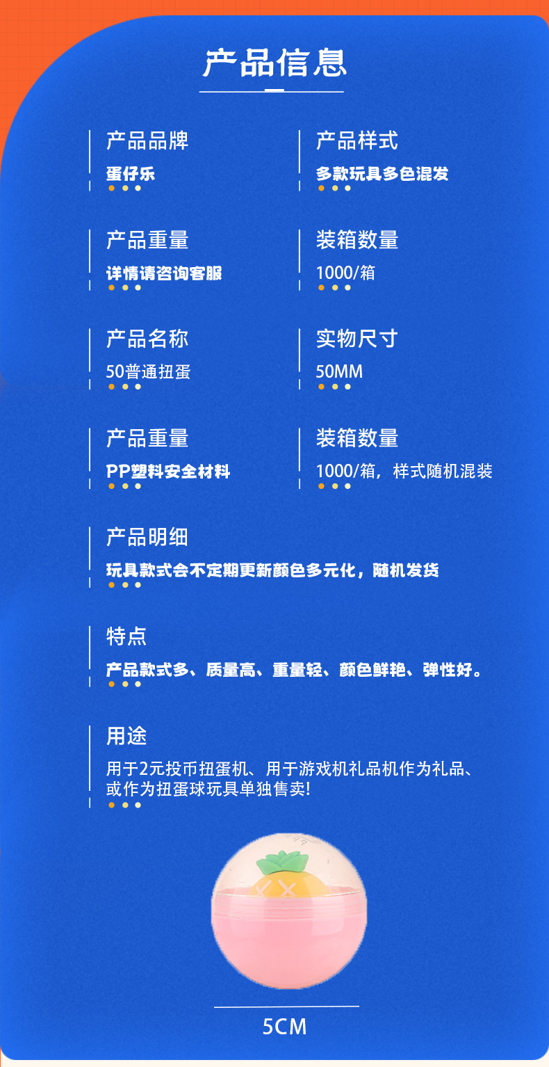 颜色: 50mm普通扭蛋 主要销售地区: 非洲,欧洲,南美,东南亚,北美,东北亚, 主要下游平台: ebay,亚马逊,wish,速卖通,独立 有可授权的自有品牌: 否 3C配置类别: 14岁以下的塑胶玩具 适用人群: 不限 包装: 100个一网袋 纸箱外套编织袋 是否跨境出口专供货源: 否 原产国/地区: 中国大陆 是否进口: 否 商品3C认证码: 2023152202046879 产地: 浙江省 货号: 50普通扭蛋 品牌: 蛋仔乐 上市时间: 2024 能力培养: 情感,视觉,智力开发,爬行,动手动脑,抓 玩具材质: 塑料 是否有动漫形象: 否 是否外贸专供: 否 适用年龄: 儿童(3-6岁) 重量: 0.01 kg/个