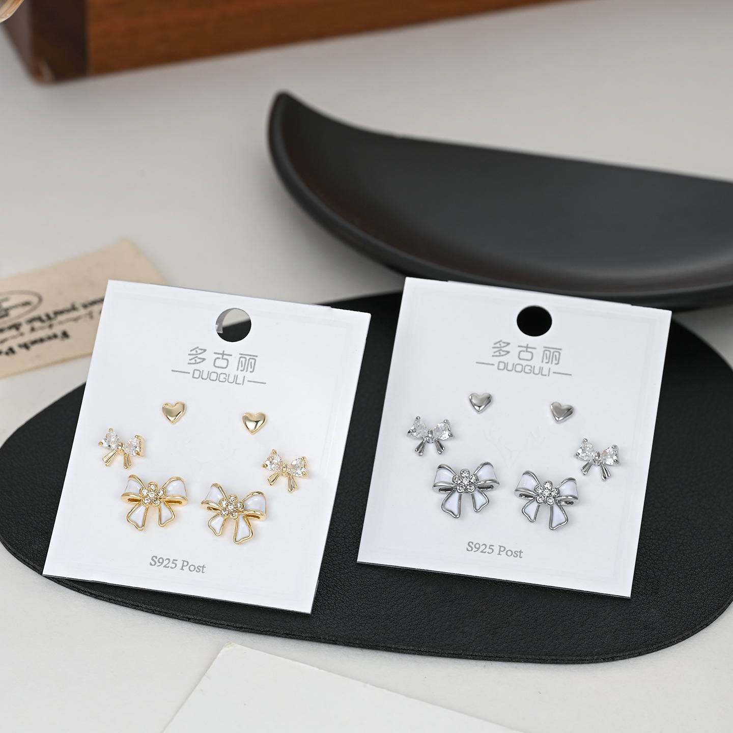 时尚小巧精致高级感蝴蝶结一卡三对装耳环耳钉s925银针耳饰品批发