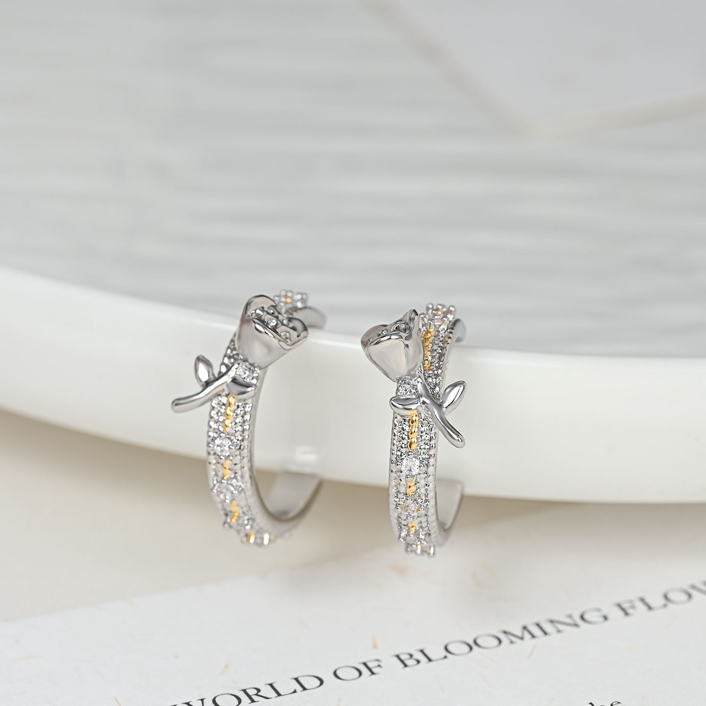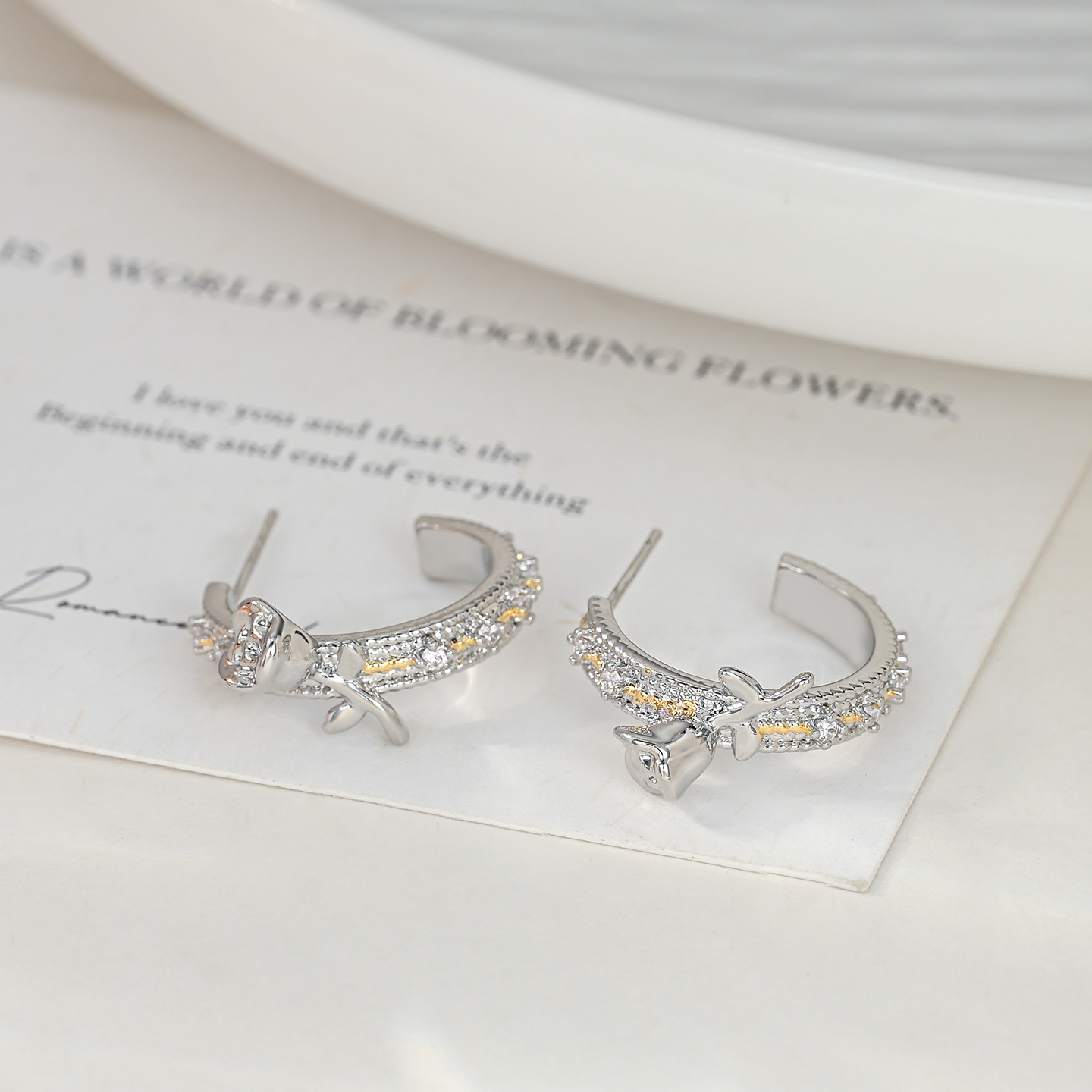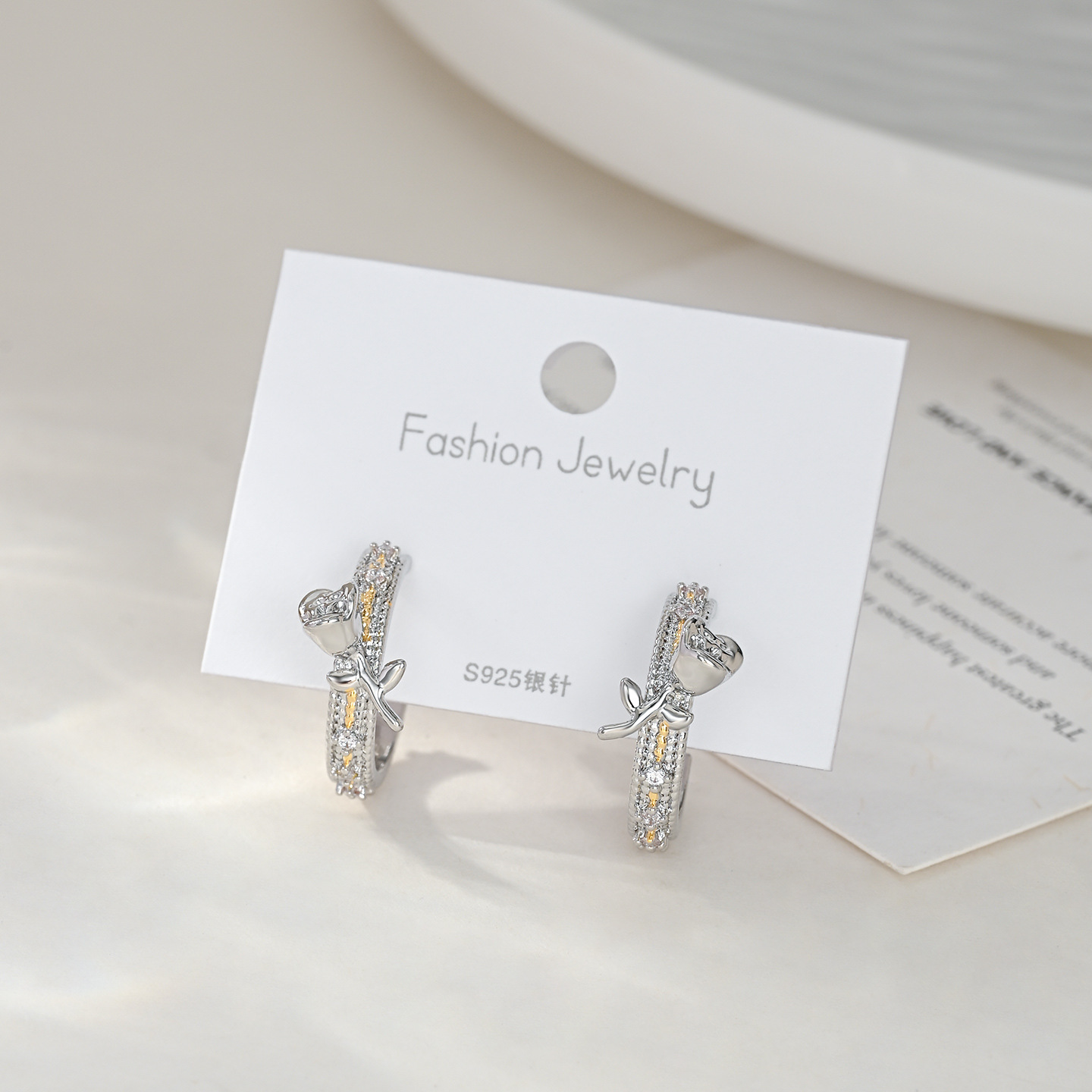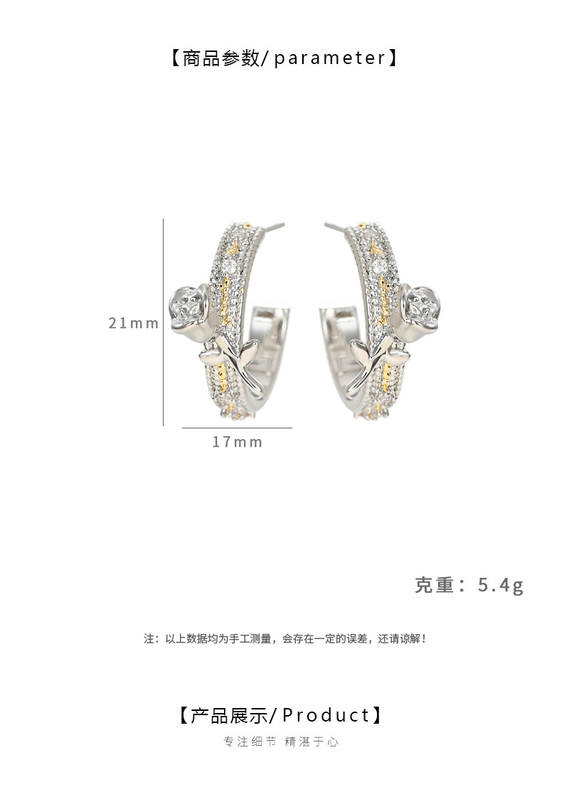 抖音直播热卖S925银针2025新款小众设计感时尚玫瑰花双色耳环耳钉 English | 投诉