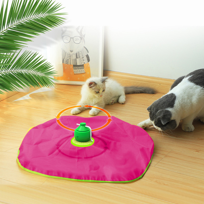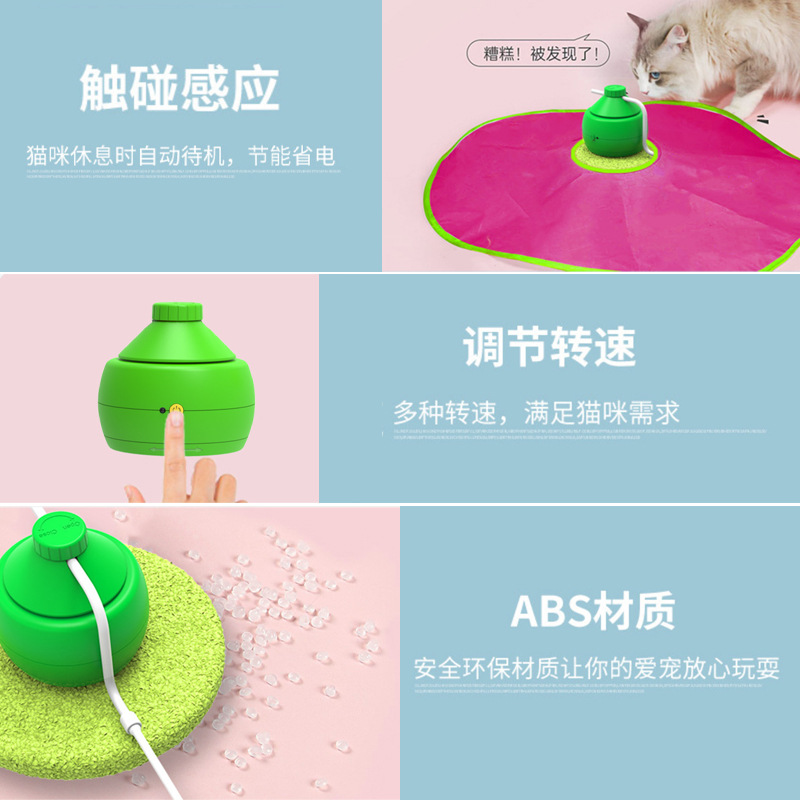 3.盖上布(逗猫盖布玩具),拿下布把支杆翻转(逗猫旋转羽毛玩具),可配爬架使用。 4.自动关机省电功能。