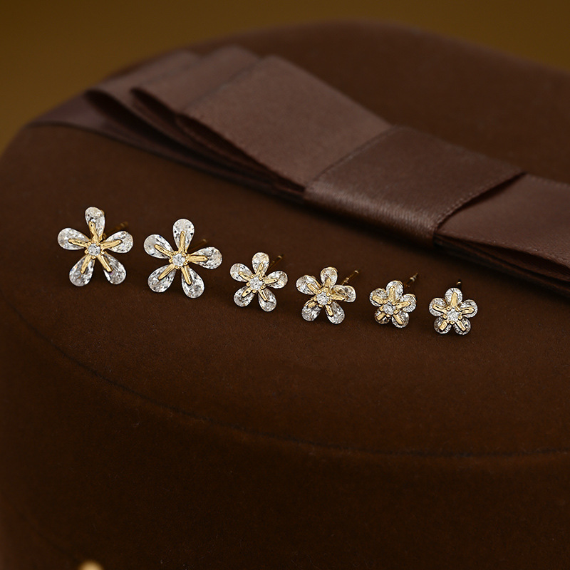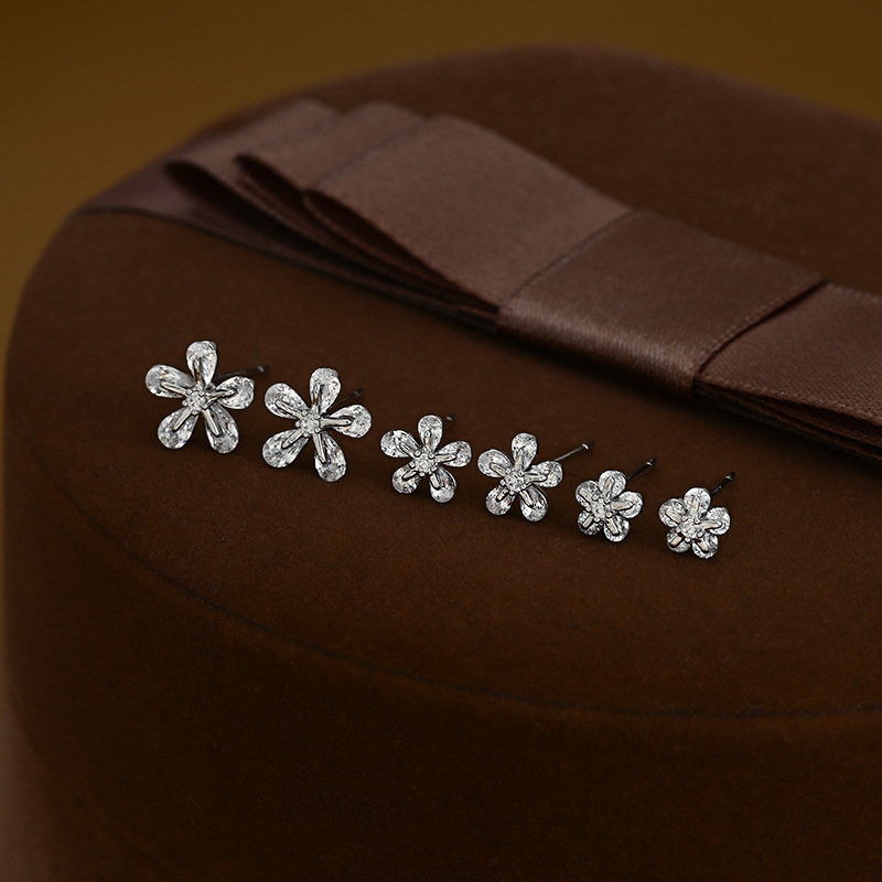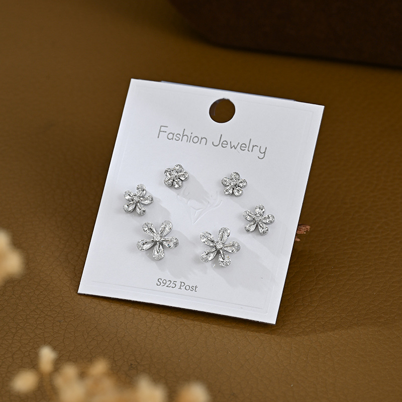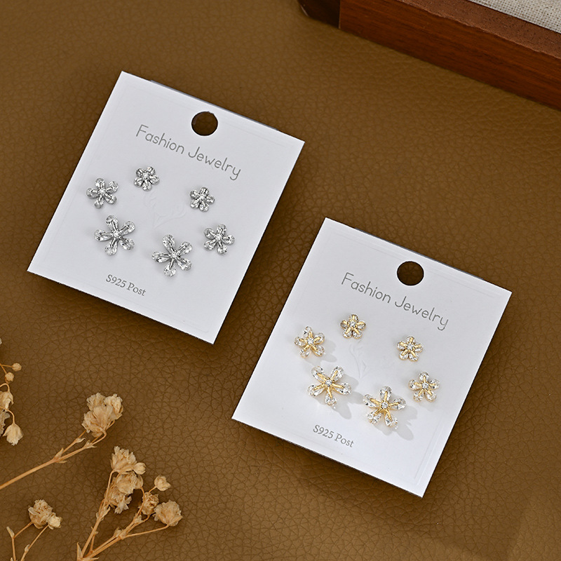 S925银针一卡三对套装耳钉女养耳锆石花瓣耳饰品简约学生百搭耳坠