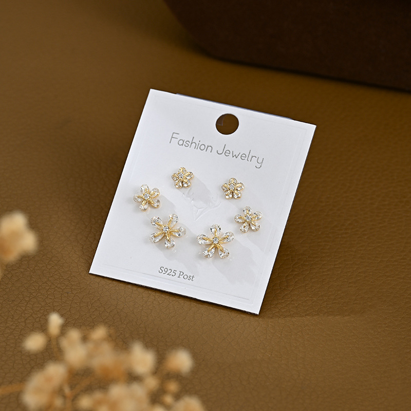 S925银针一卡三对套装耳钉女养耳锆石花瓣耳饰品简约学生百搭耳坠 English | 投诉