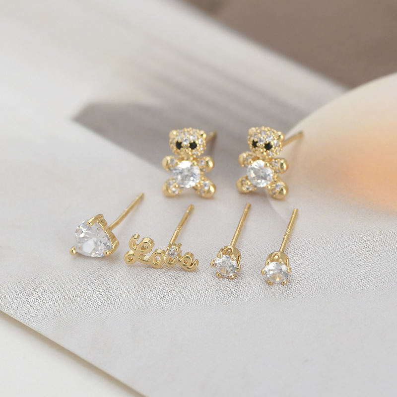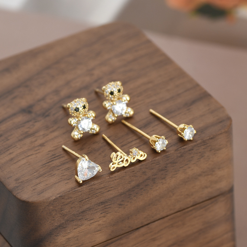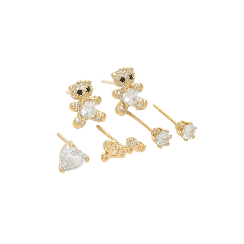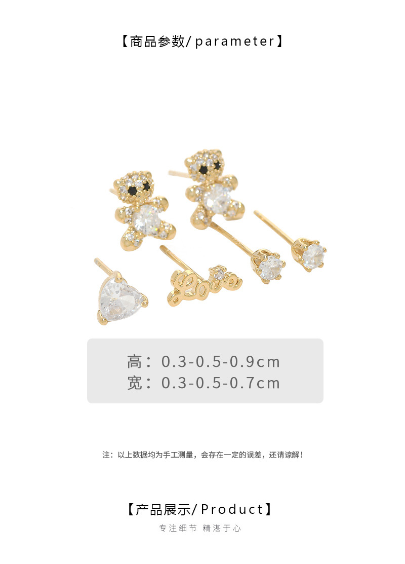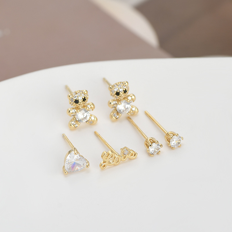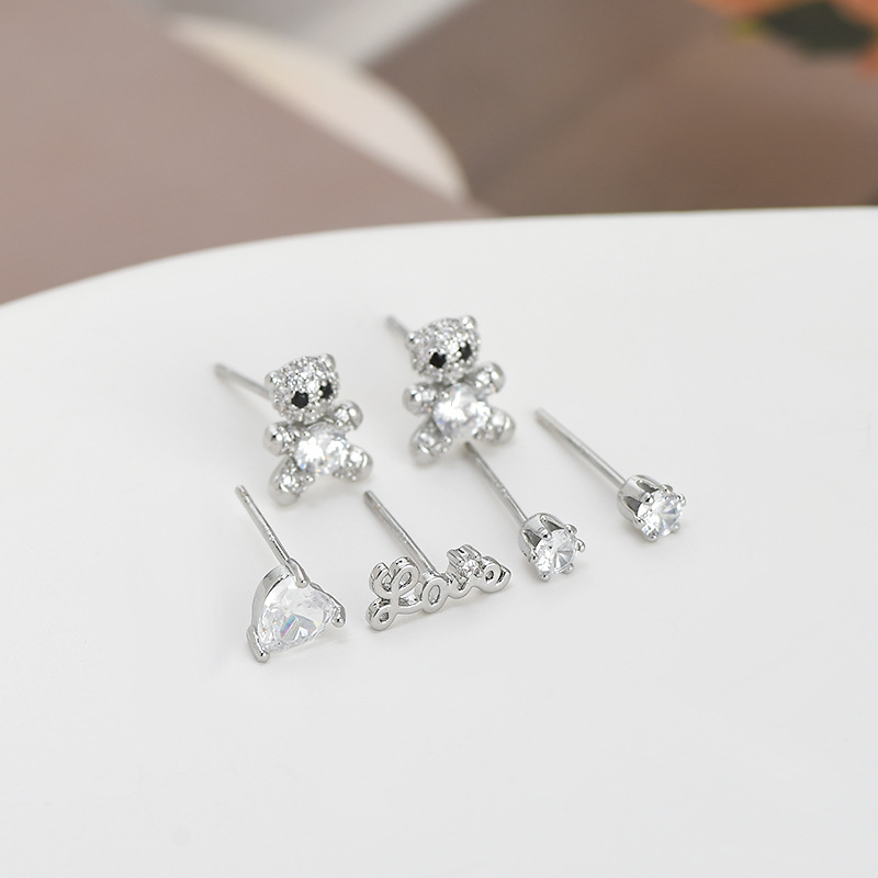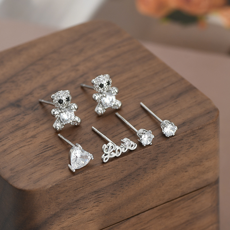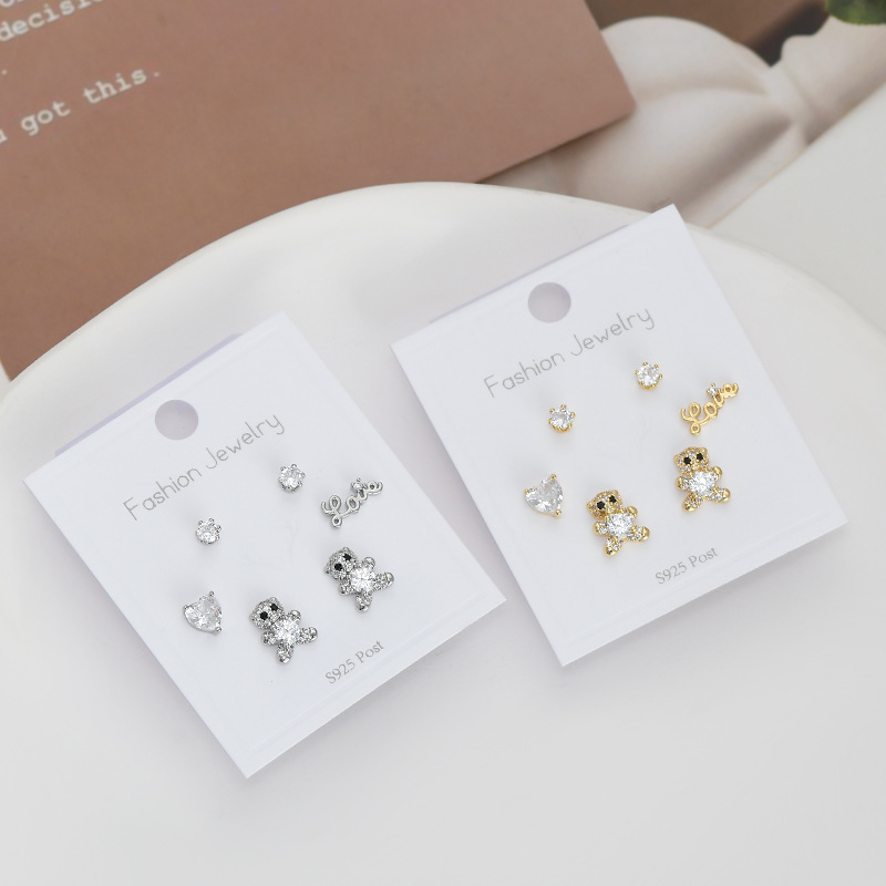 S925银针一卡三对套装耳钉女睡觉不用摘小熊字母耳饰简约学生耳坠 English | 投诉