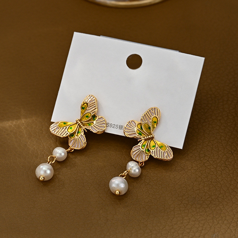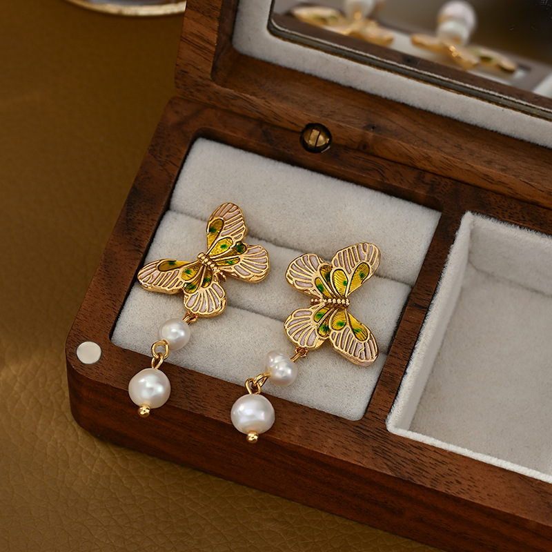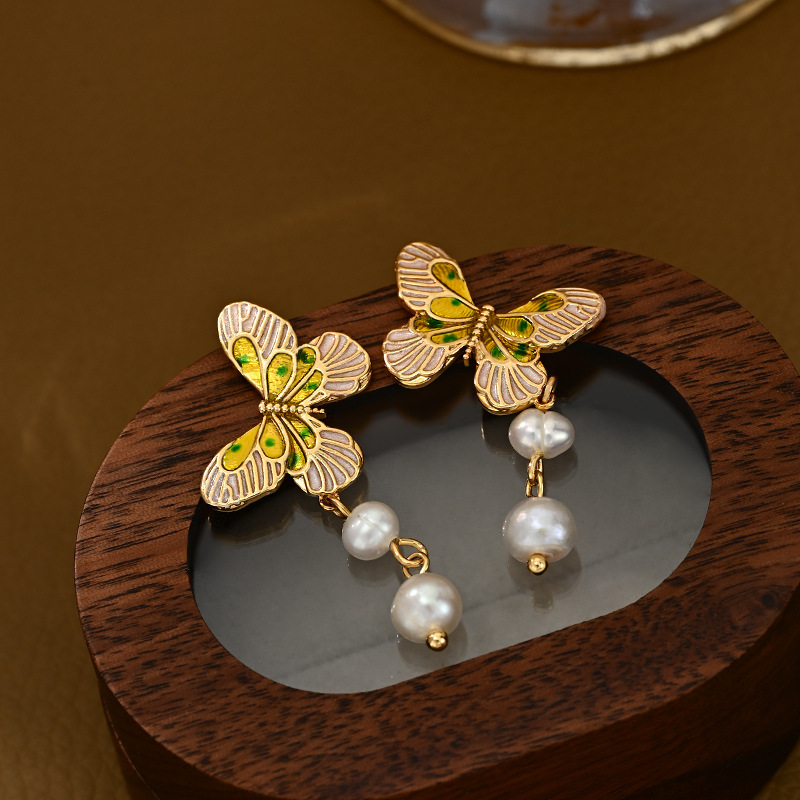 ins新款真金电镀天然淡水珍珠蝴蝶耳钉女S925银针轻奢高级感耳饰
