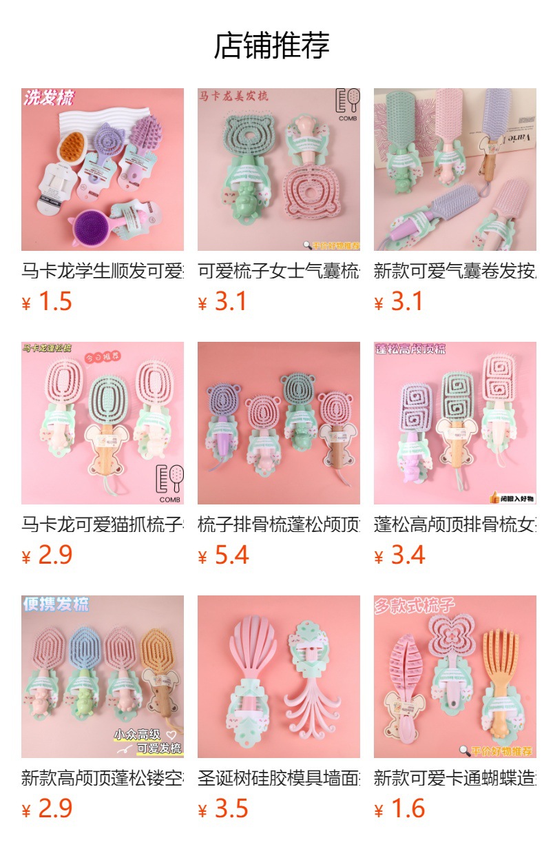 产品类别: 美发梳 是否进口: 否 品牌: 美雅妮 材质: 塑料 颜色: 镂空排骨梳,五角形洗头梳,月亮型洗头梳 货号: 03110158 尺寸: 10-15CM 产地: 义乌 加印LOGO: 可以 加工定制: 是 主要下游平台: ebay,亚马逊,wish,速卖通,独立 主要销售地区: 非洲,欧洲,南美,东南亚,北美,东北亚, 有可授权的自有品牌: 是 是否跨境出口专供货源: 是