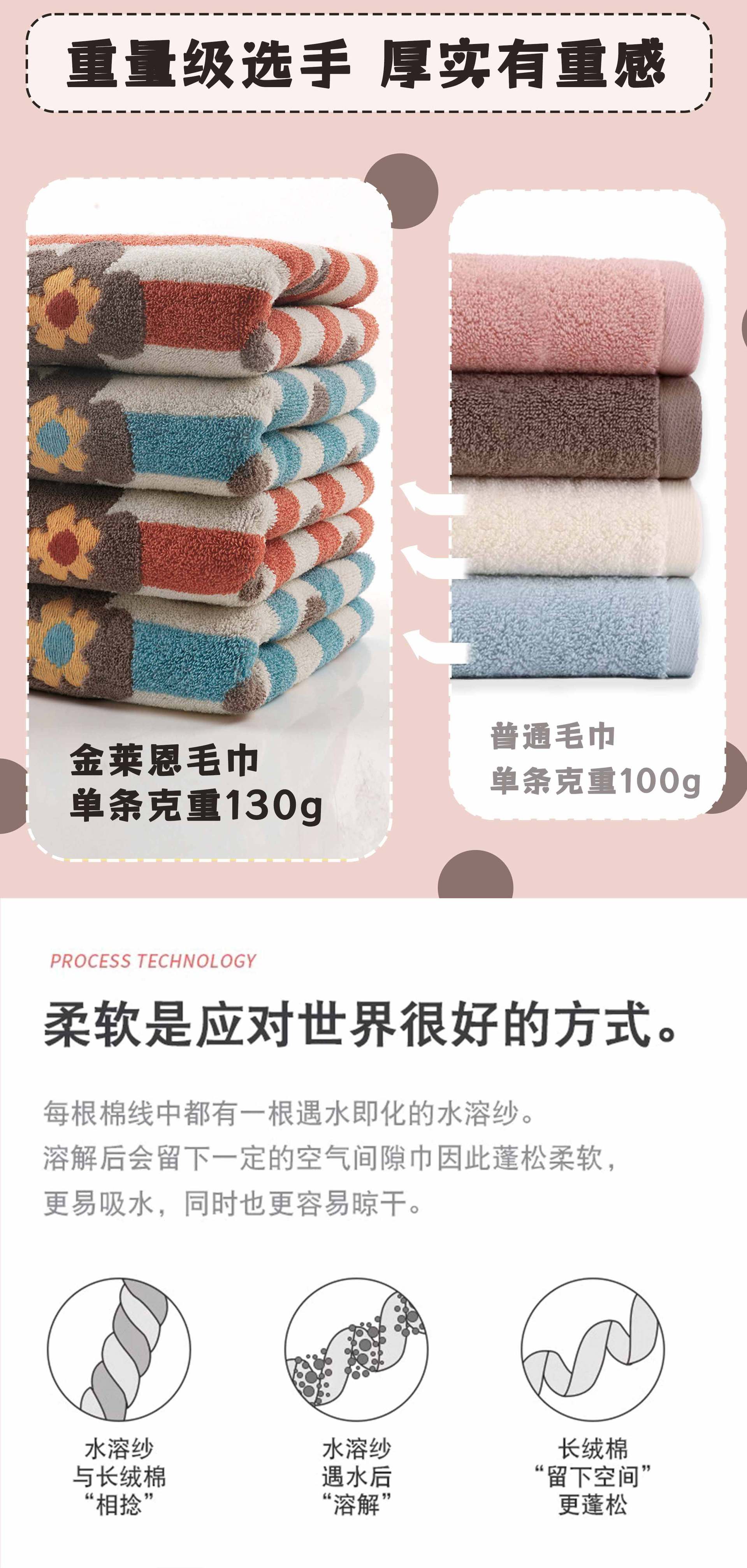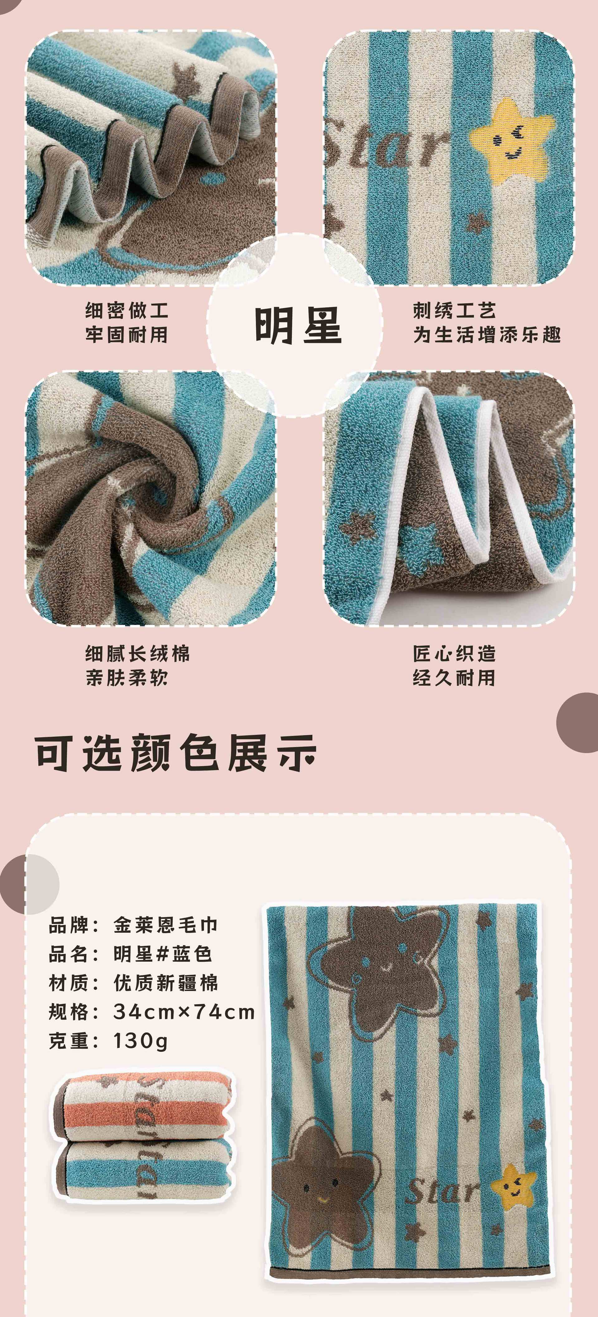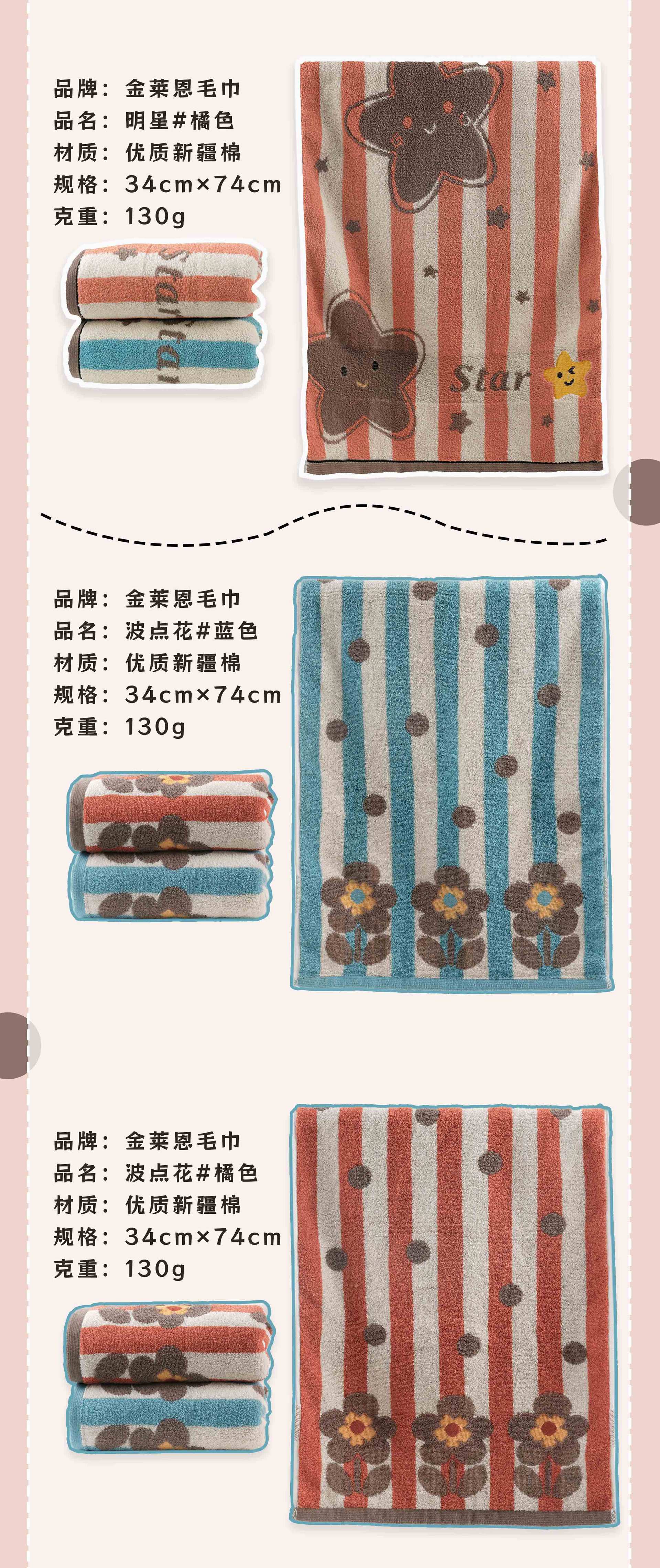 品牌: 金莱恩 货号: xx 材质: 纯棉 纱线规格: 16支 制作工艺: 提花,平织 克重: 120g(含)-140g(不含) 加工定制: 是 颜色: 波点花【双色两条装】,明星【双色两条装】 规格(长*宽cm): 34*74cm 重量: 0.5 kg/条