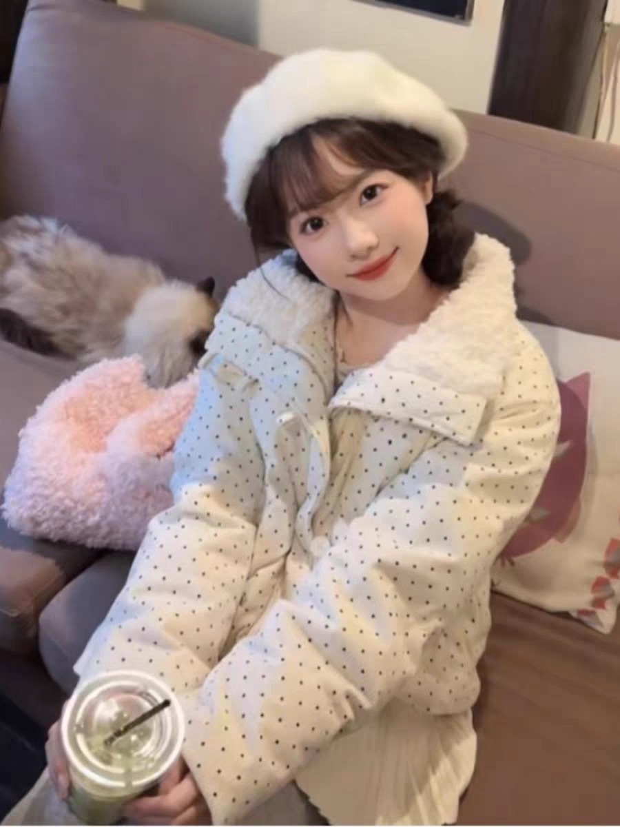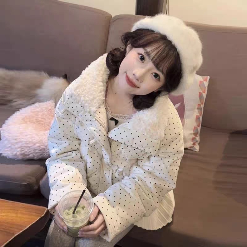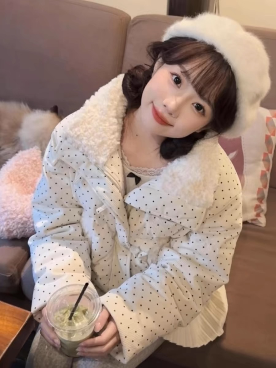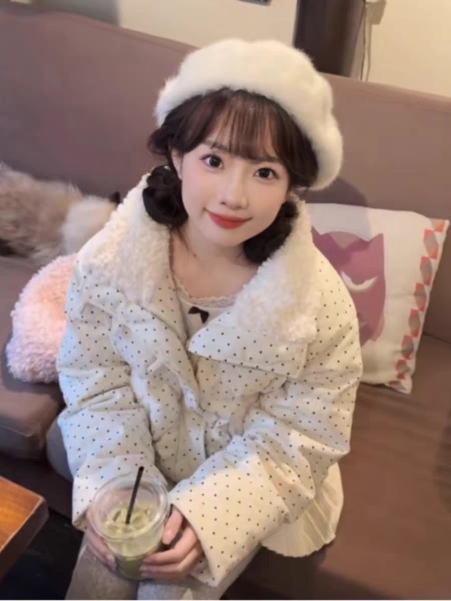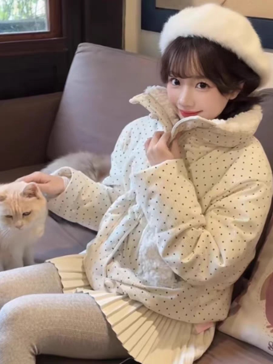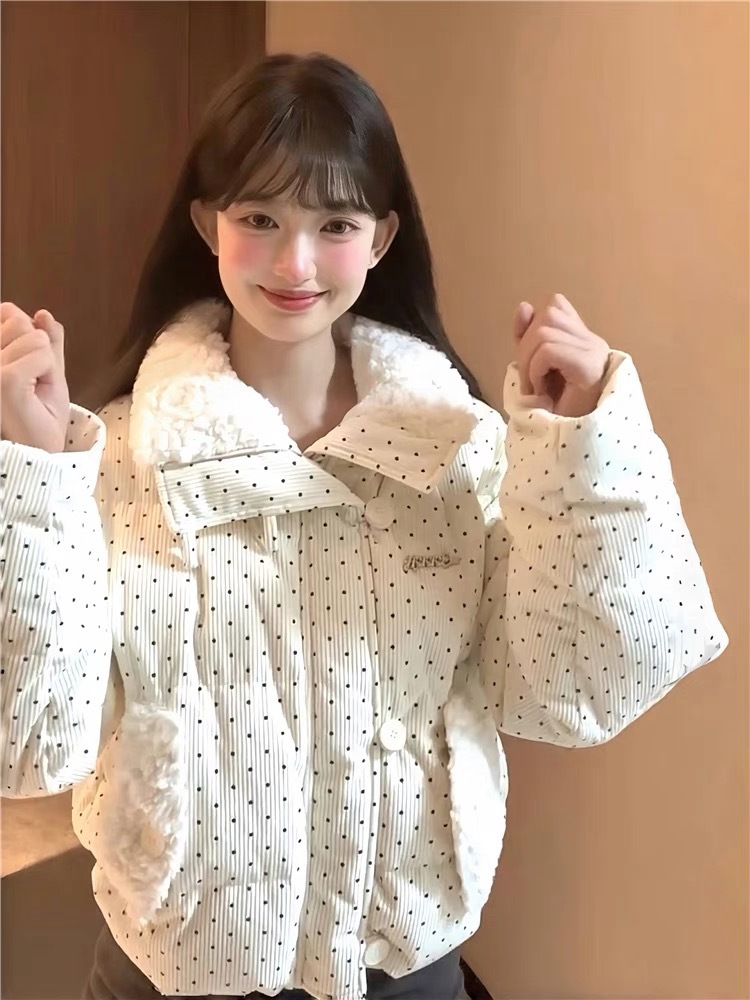 拼接设计感小众波点棉服上衣女冬季甜美可爱羊羔毛翻领外套棉衣韩 投诉