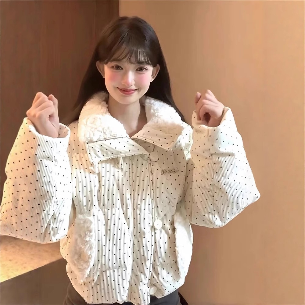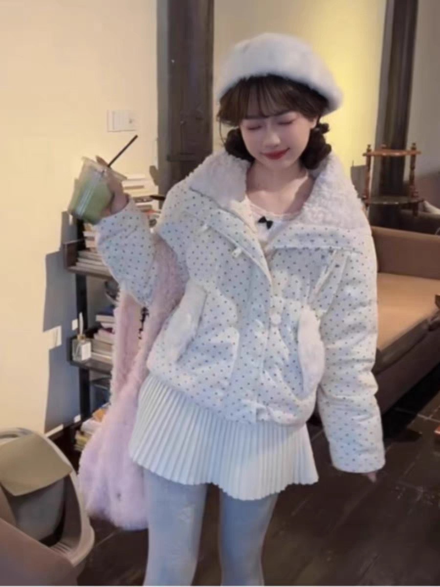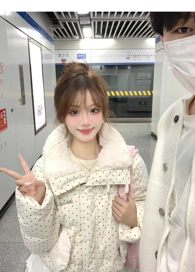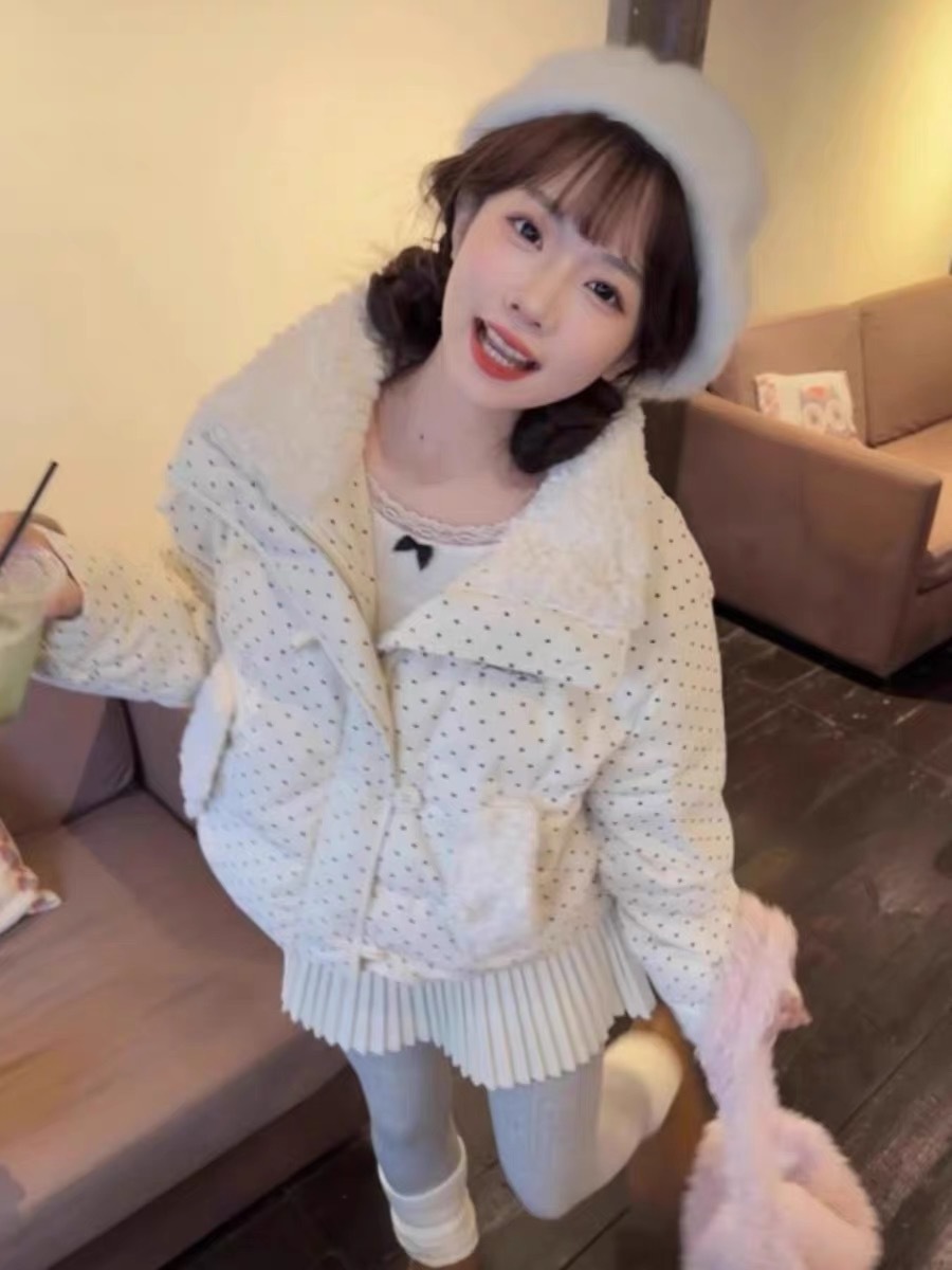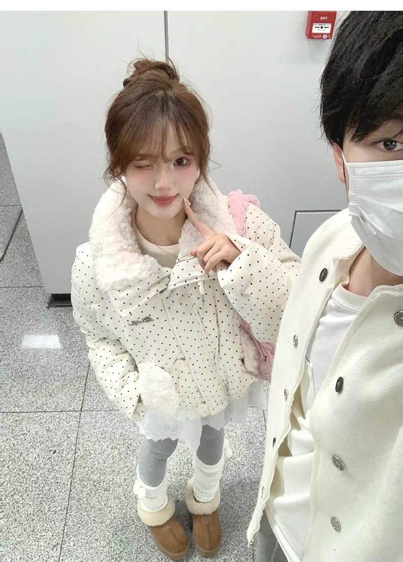 拼接设计感小众波点棉服上衣女冬季甜美可爱羊羔毛翻领外套棉衣韩 投诉