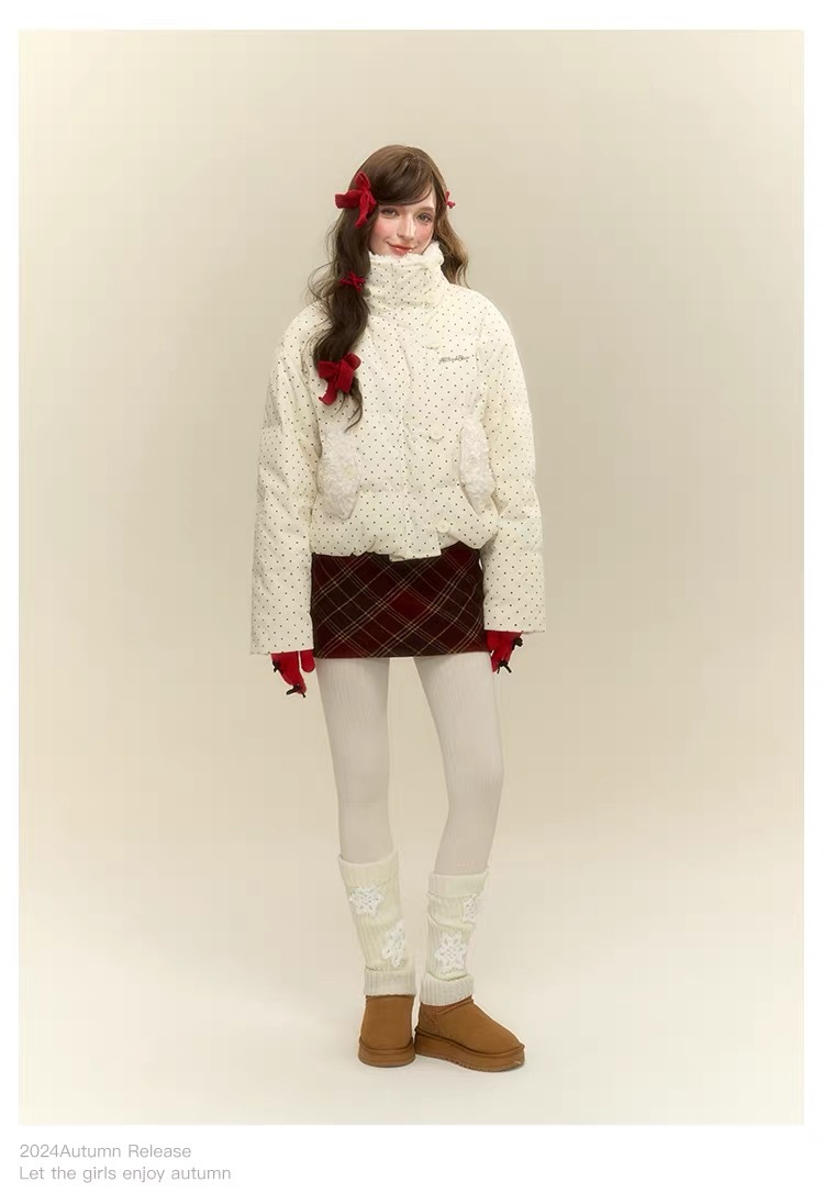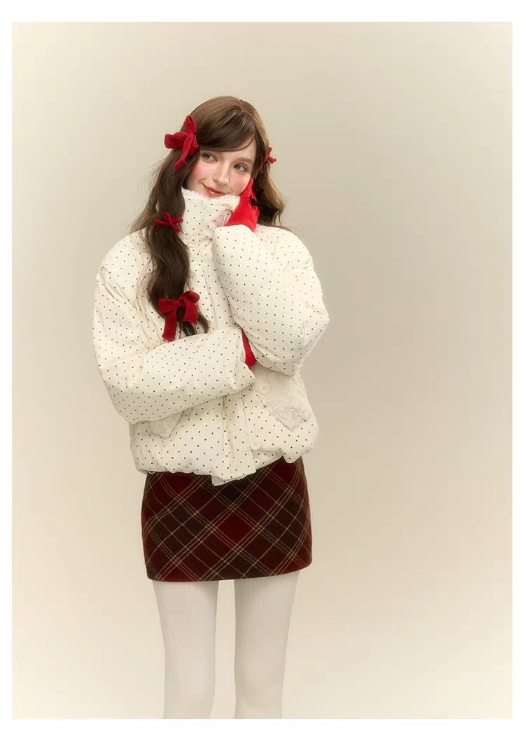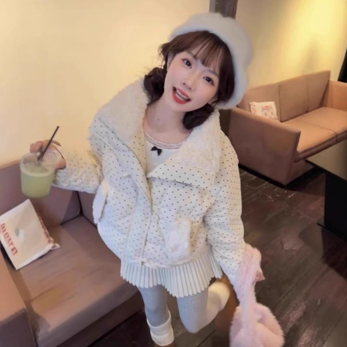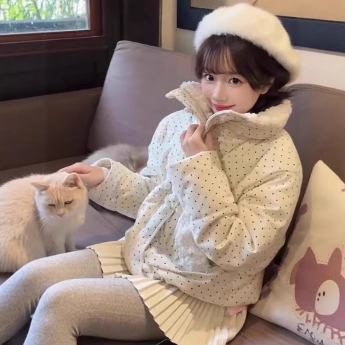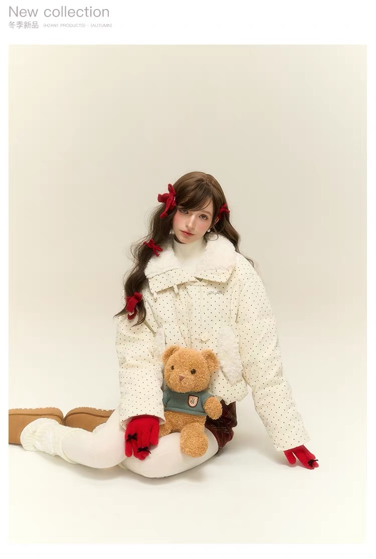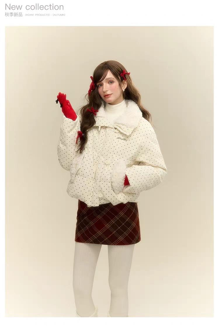 拼接设计感小众波点棉服上衣女冬季甜美可爱羊羔毛翻领外套棉衣韩 投诉