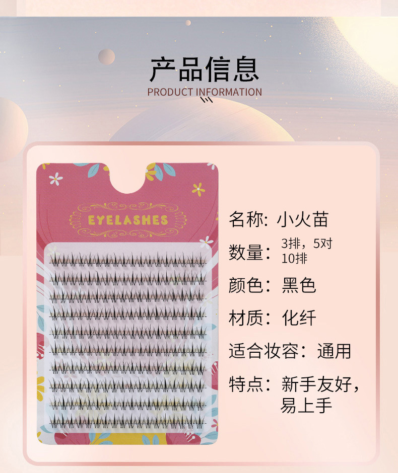 产品类别: 假睫毛 是否进口: 否 品牌: 瑞彩 材质: 化纤 制作工艺: 手工 货号: 小火苗5排斜飞狐睫毛 产地: 青岛平度 规格: 5排斜飞狐睫毛 主要下游平台: 亚马逊,速卖通 有可授权的自有品牌: 否 重量: 0.03 kg/件