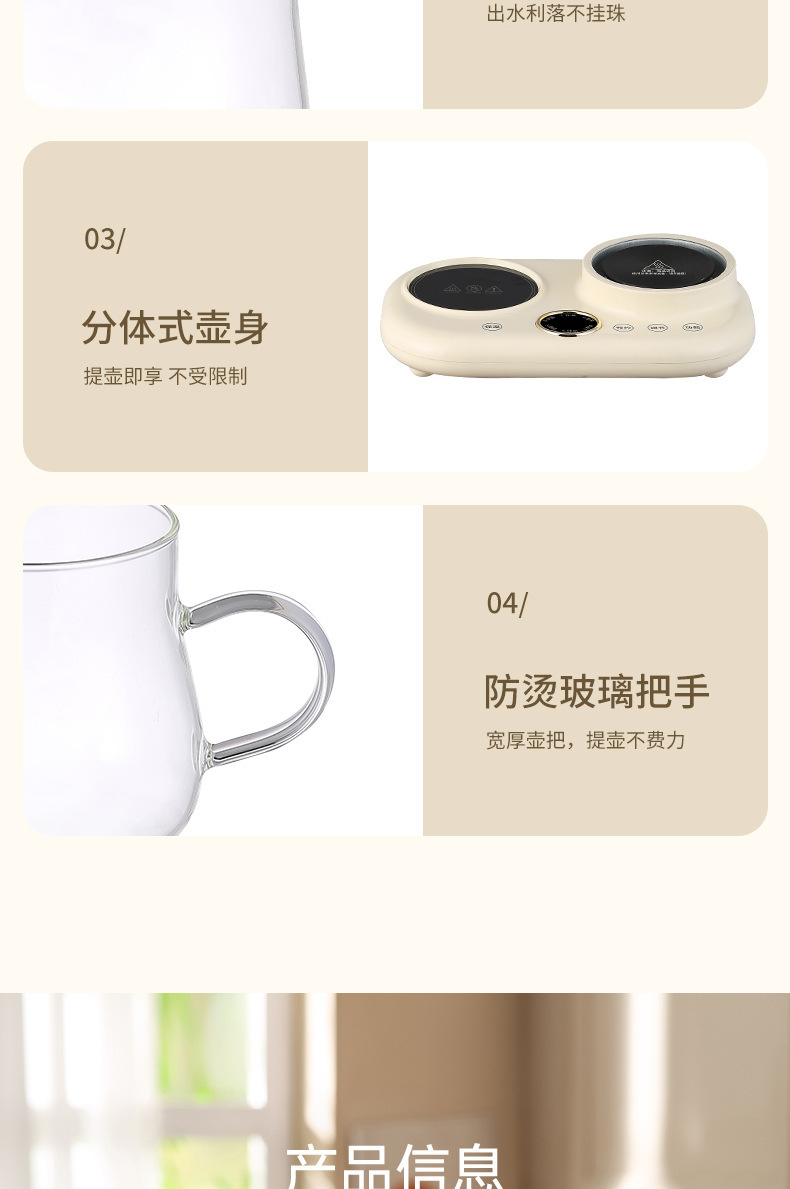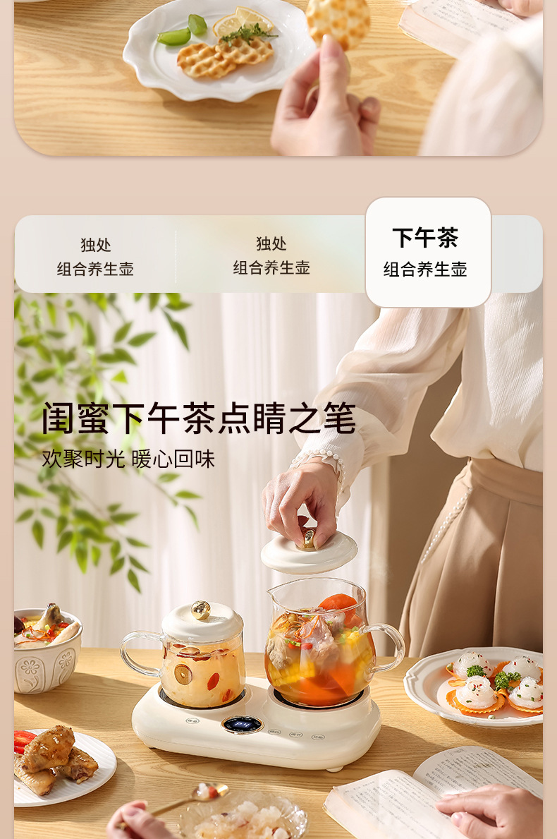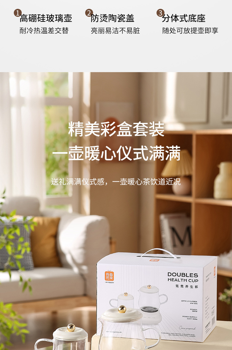 产品类别: 养生壶 控制方式: 触摸式 适用人数: 1-2人 额定频率: 50 包装清单: 礼盒套装 颜色: 鸳鸯养生壶 产品规格: - 是否跨境出口专供货源: 否 智能类型: 不支持智能 刻度标示: 内壁标示 重量: 0.786 kg/台 装箱信息:长宽高:21X24X25cm 装箱重量: 22KG 装箱数量:29pcs