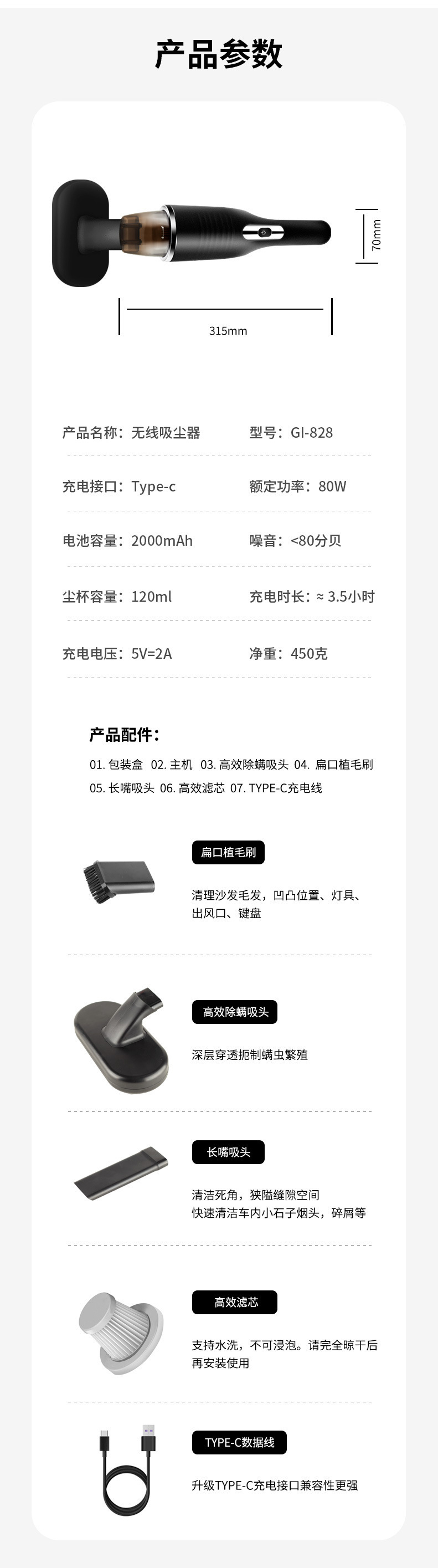 配件:包装盒、主机、高效除蠕吸头、扁口植毛刷、长嘴吸头、 高效滤芯、TYPE-C充电线