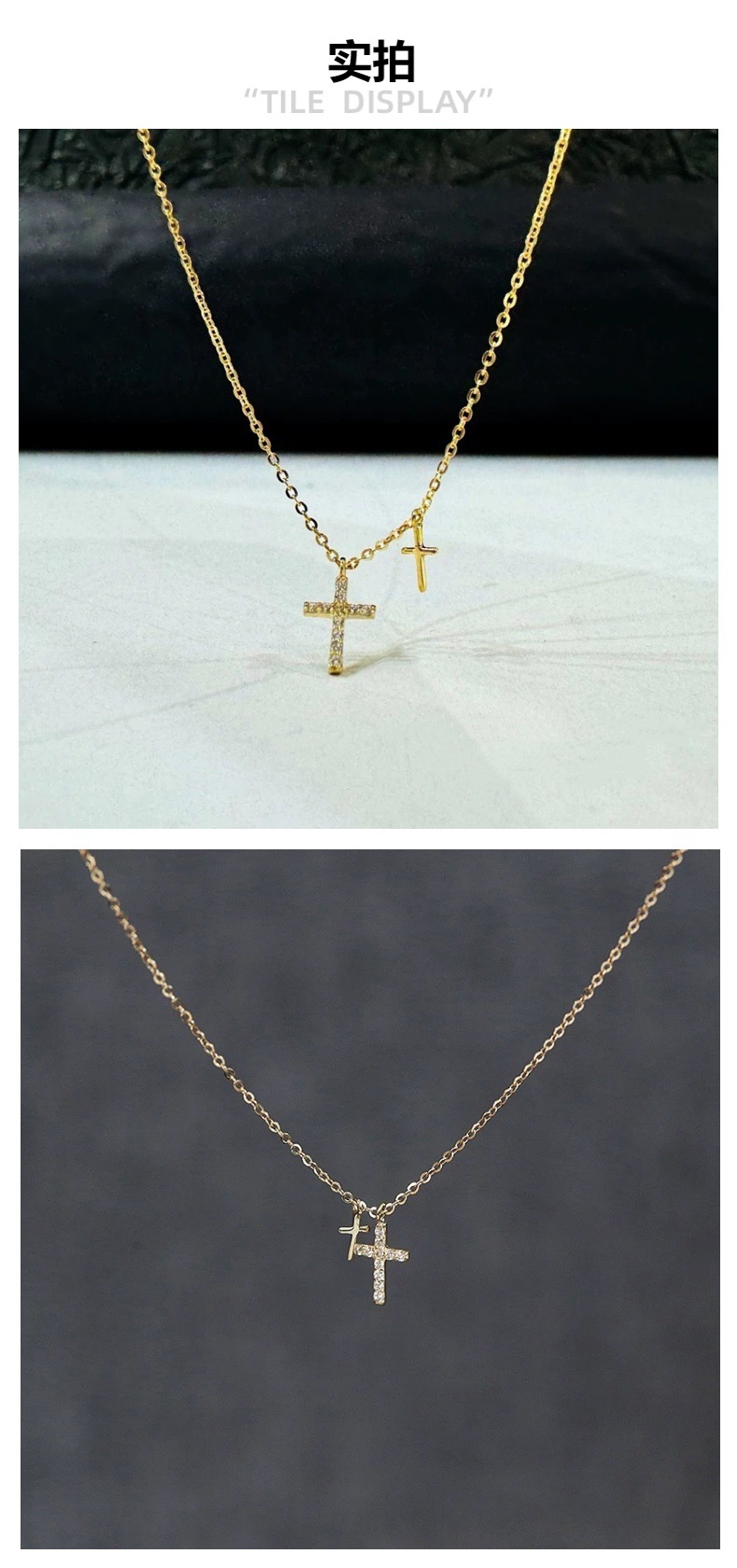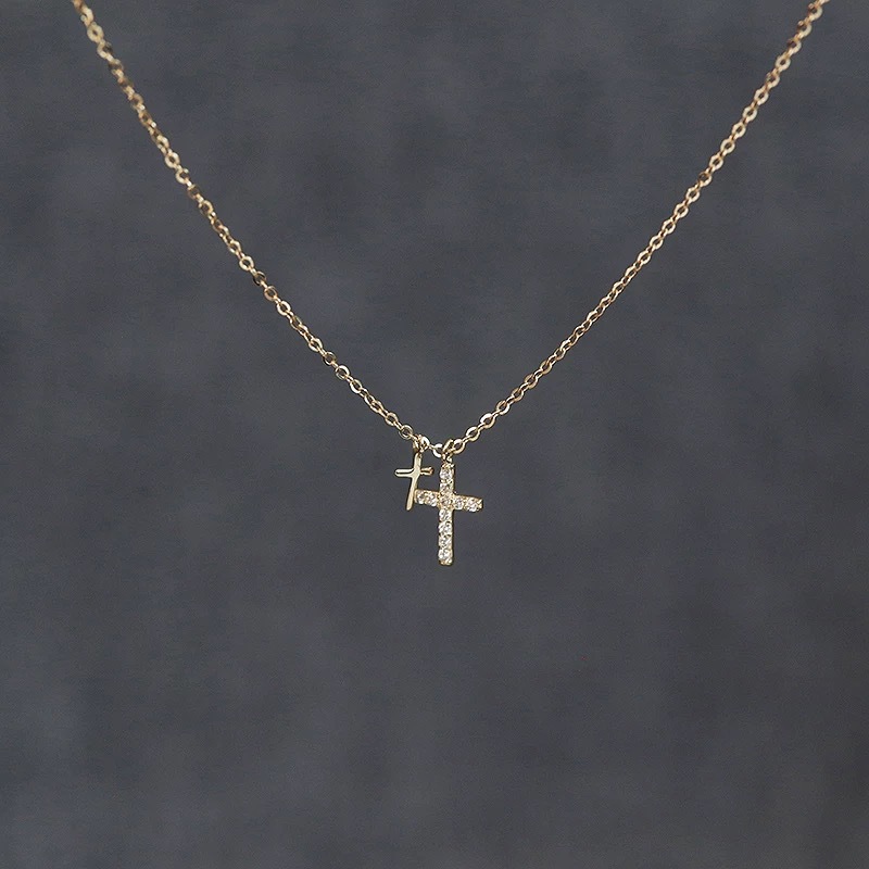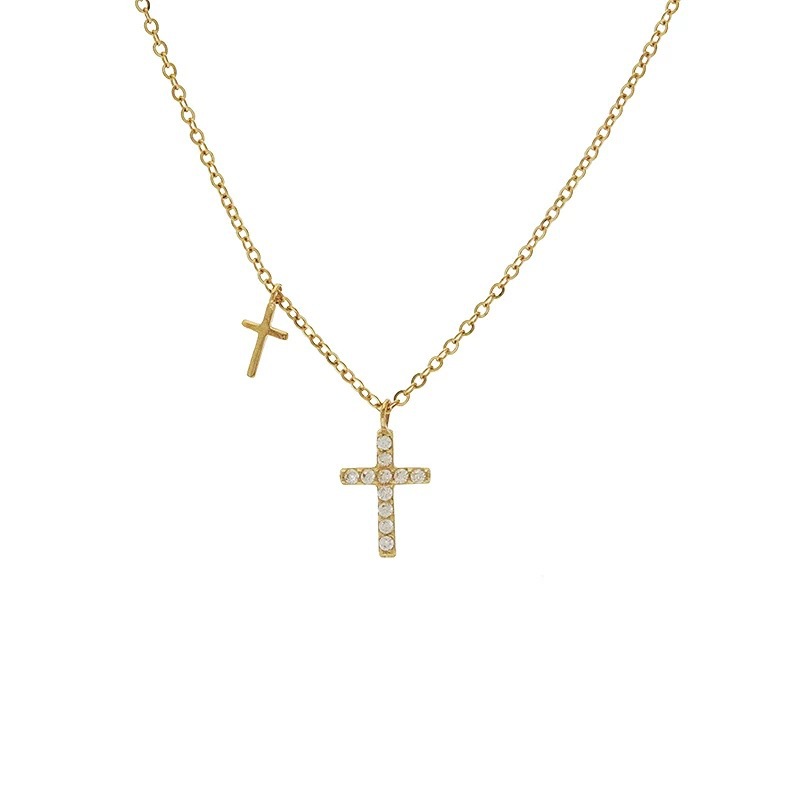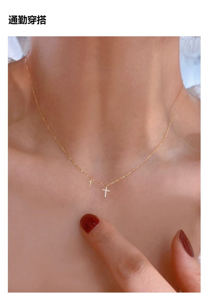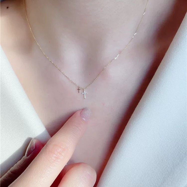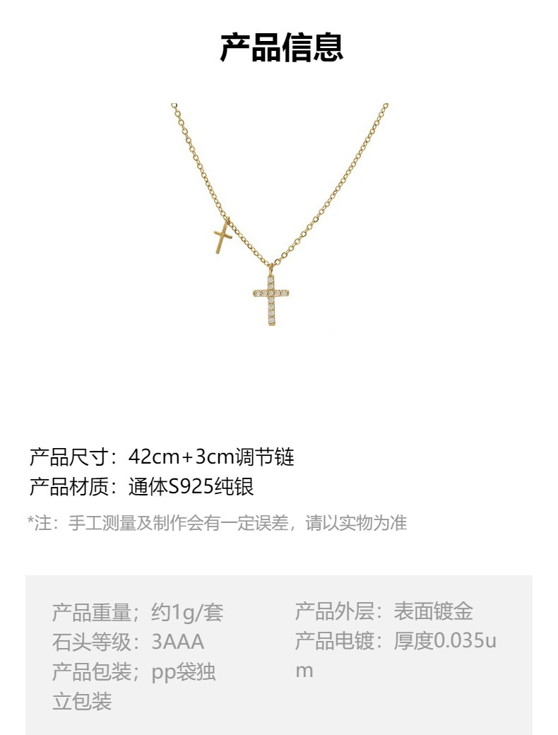 S925纯银镀14K金双十字架项链女 日韩小众镶钻吊坠超细锁骨链礼物 English | 投诉