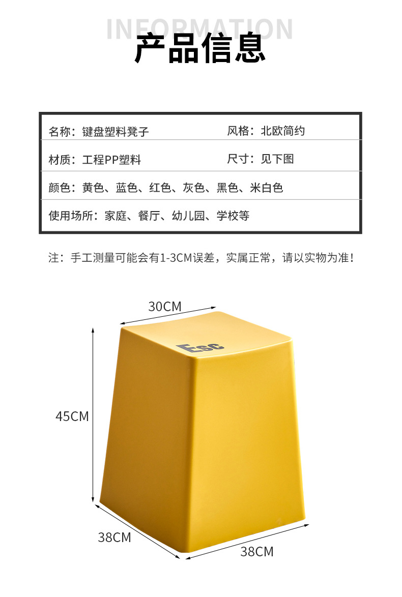 产品类别: 塑料椅 货号: 068键盘凳 品牌: 艾格 适用年龄段: 成年 材质: 塑料 适用场合: 餐厅 风格: 现代简约 型号: 068键盘凳 框架: 无骨架 内部填充物: 无 有无扶手: 无 可否旋转: 不可以 可否折叠: 不可以 可否定做: 不可以 颜色: 米白色,黄色,灰色,墨蓝色,深红色,黑色 贸易属性: 内贸+外贸 体积: 0.3 规格: 38*38*45CM 是否跨境出口专供货源: 否 是否一般纳税人: 否 重量: 0.5 kg/个