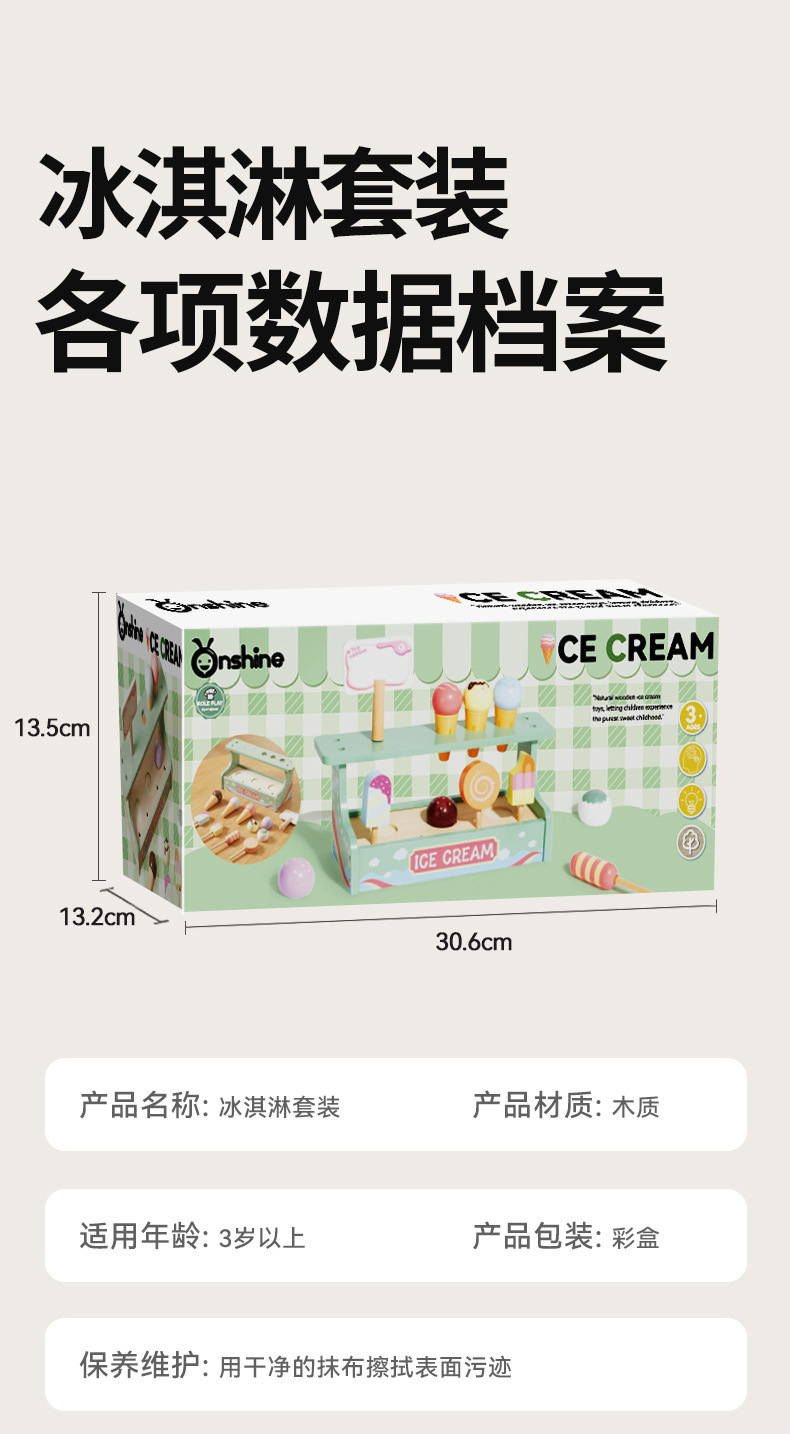 品牌: ONSHINE/童年无限 原产地: 云和 适用人群: 不限 特色功能: 过家家 是否进口: 国产 包装: 彩盒 玩具材质: 木制 能力培养: 动手动脑,感官,互动玩具 货号: 4888 是否有动漫形象: 否 专利及著作权申请时间: 2024 是否有导购视频: 是 类型: 仿真厨房类 是否专供外贸: 否 3C配置类别: 14岁以下其它玩具 颜色: 冰淇淋套装 是否跨境出口专供货源: 否 适用年龄: 儿童(4-6岁) 重量: 0.5 kg/盒