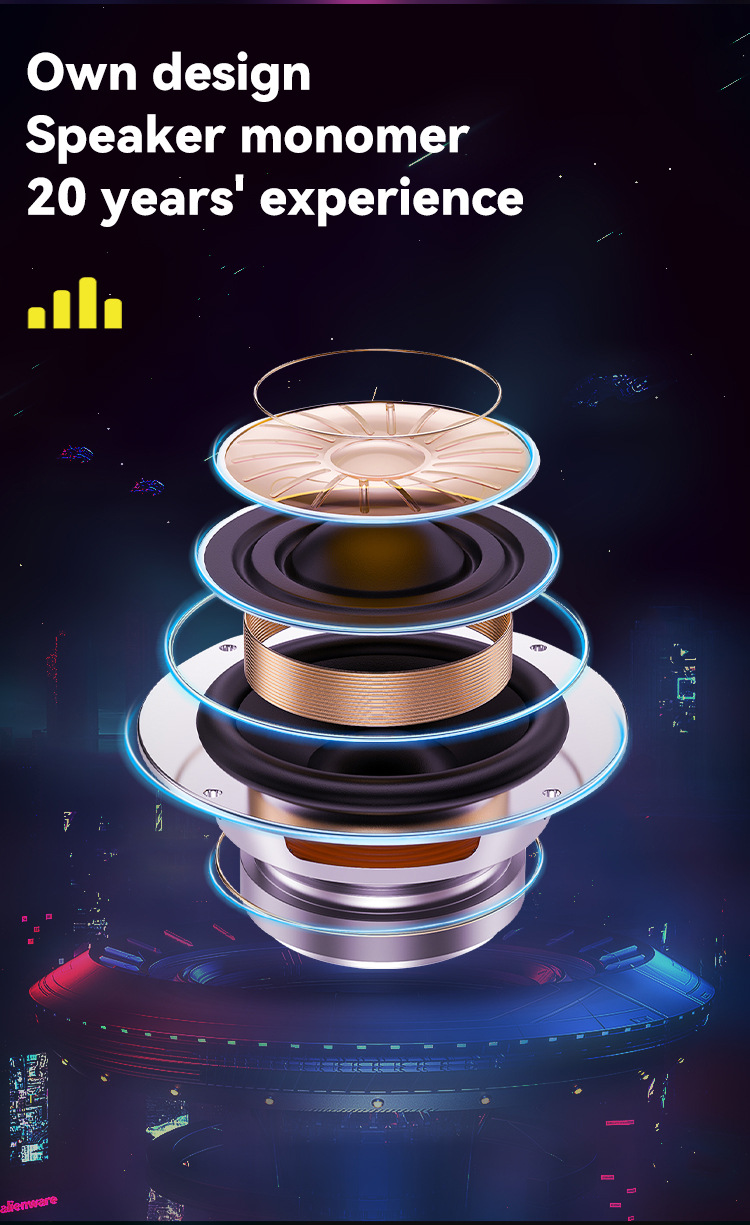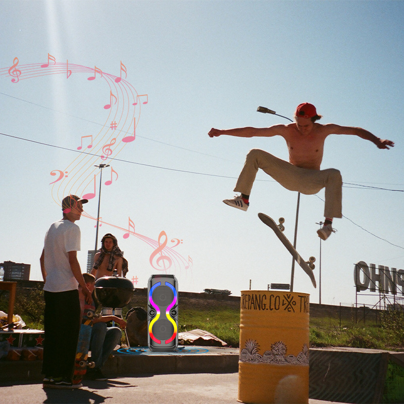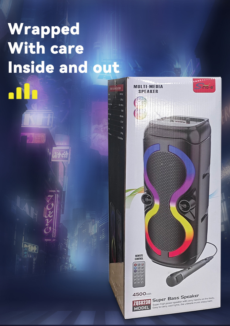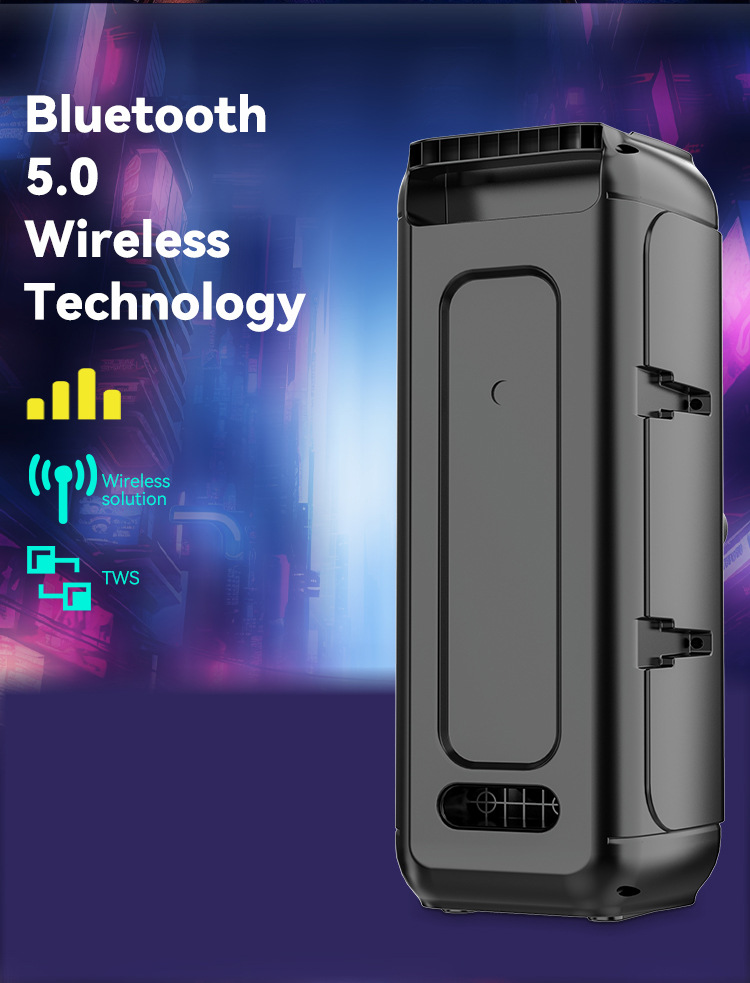 带BT/FM/USB/TF卡/AUX/MIC、DC-5V充电(Type-c)+无显示屏、USB带5V升压,带遥控+带锂电保护、麦克风座靠外装+单功放、电位器音量、对箱功能+带幻彩、幻彩受MODE控制