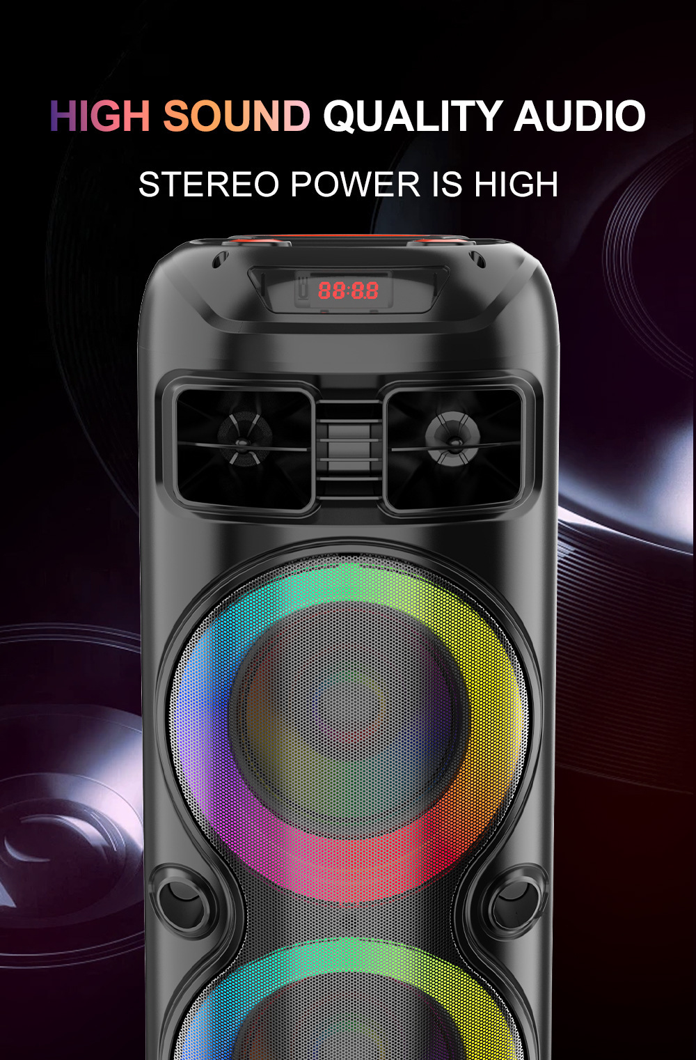 品牌: SING-E 适用场景: 车载,桌面,健身运动,户外,居家,移动便 上市时间: 2024 连接方式: 蓝牙连接 频响范围: 100HZ-20KHZ 信噪比: ≥70db 喇叭数: 2个 有效距离: 8米 箱体材质: 塑胶 外观尺寸: 268x258x614m