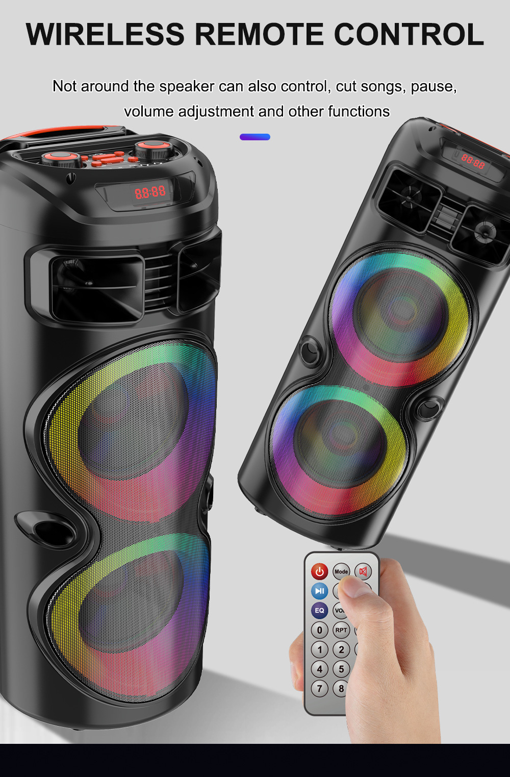 、对箱功能、电位器音量、+带彩灯、彩灯受LED键控制、带无线麦功能(无线元件上板)