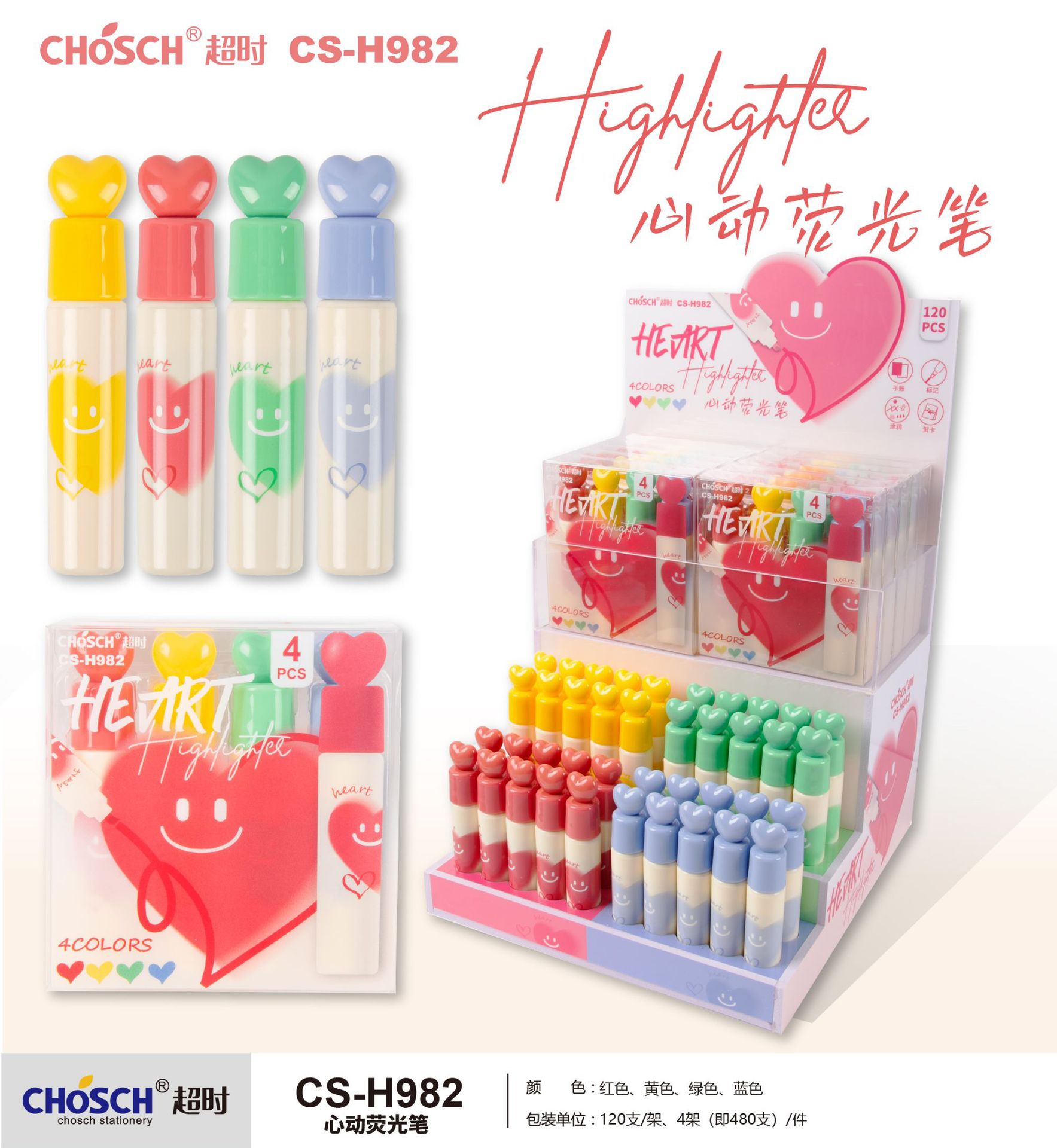 品牌: 超时 货号: H982 外壳材质: 塑料 规格: 正常规格 型号: H982 包装方式: 展示架 是否双头: 否 是否可擦: 否 是否进口: 否 笔芯颜色: 红色、黄色、绿色、蓝色 笔头形状: 斜头 是否属于礼品: 否 重量: 0.02 kg/支