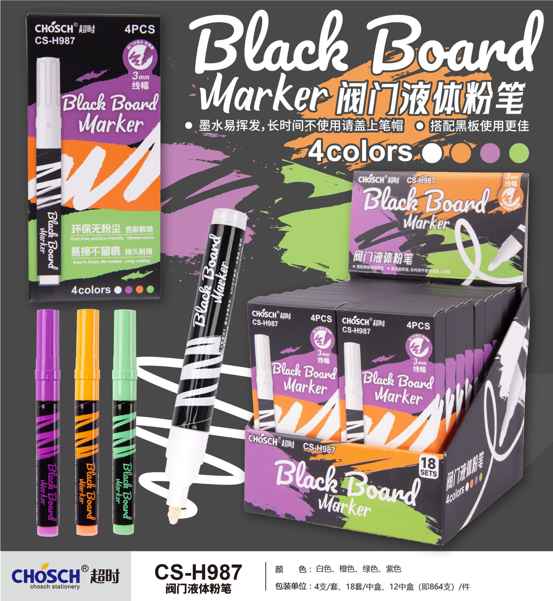 品牌: 超时 货号: H987 外壳材质: 塑料 型号: H987 包装方式: 纸盒包装 是否双头: 否 是否可擦: 否 加印LOGO: 可以 加工定制: 是 是否进口: 否 笔芯颜色: 白色,橙色,绿色,紫色 是否属于礼品: 否 重量: 0.02 kg/支