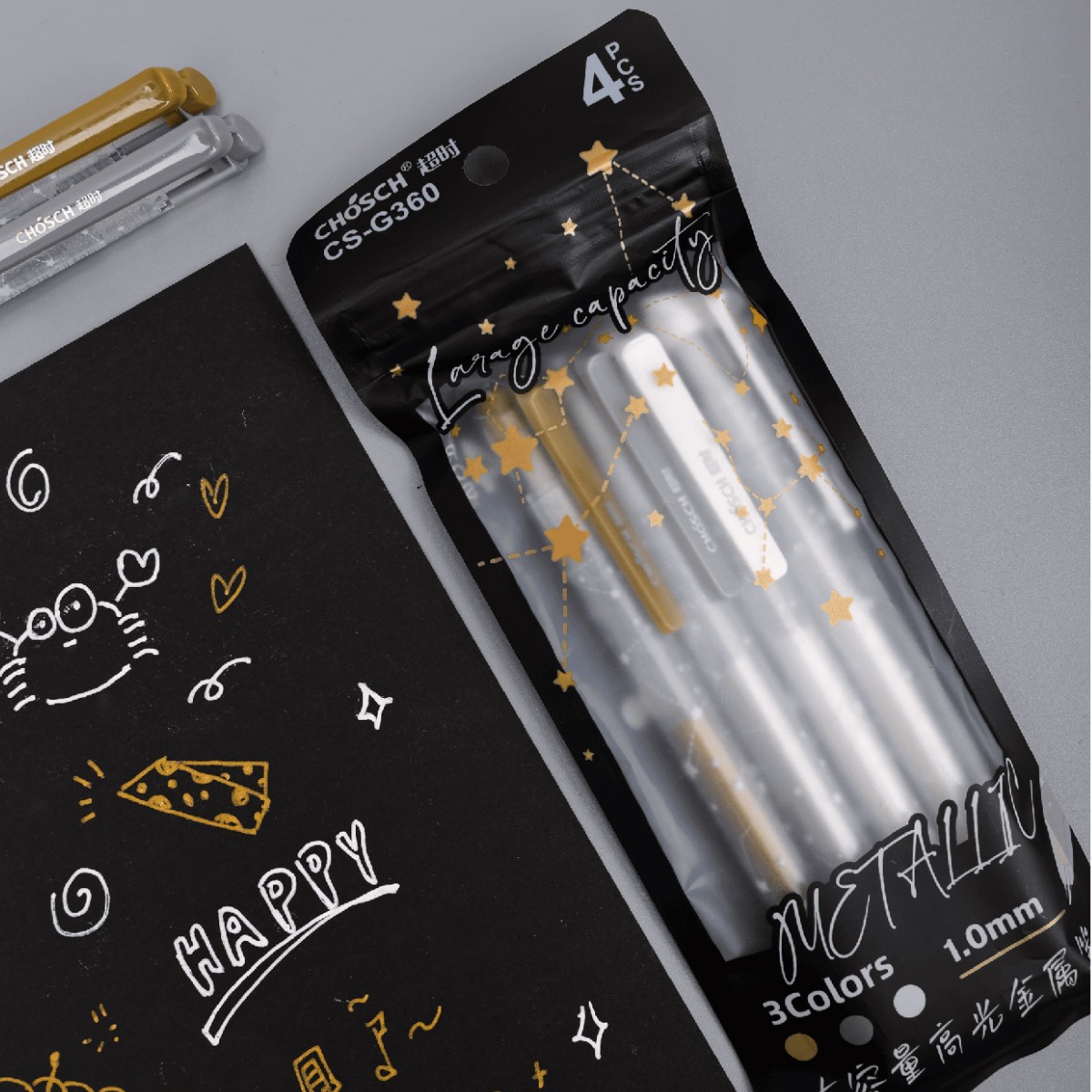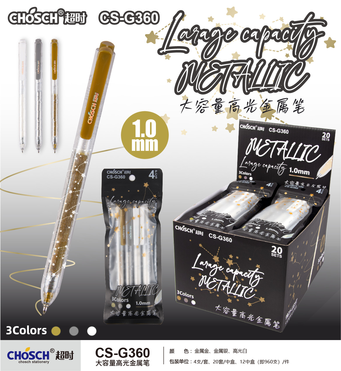 品牌: 超时 货号: CS-G360 系列: 学生 外壳材质: 塑料 是否可擦: 否 笔芯颜色: 金银白 笔头: 1.0mm 笔尖材质: 金属 重量: 0.012 kg/支