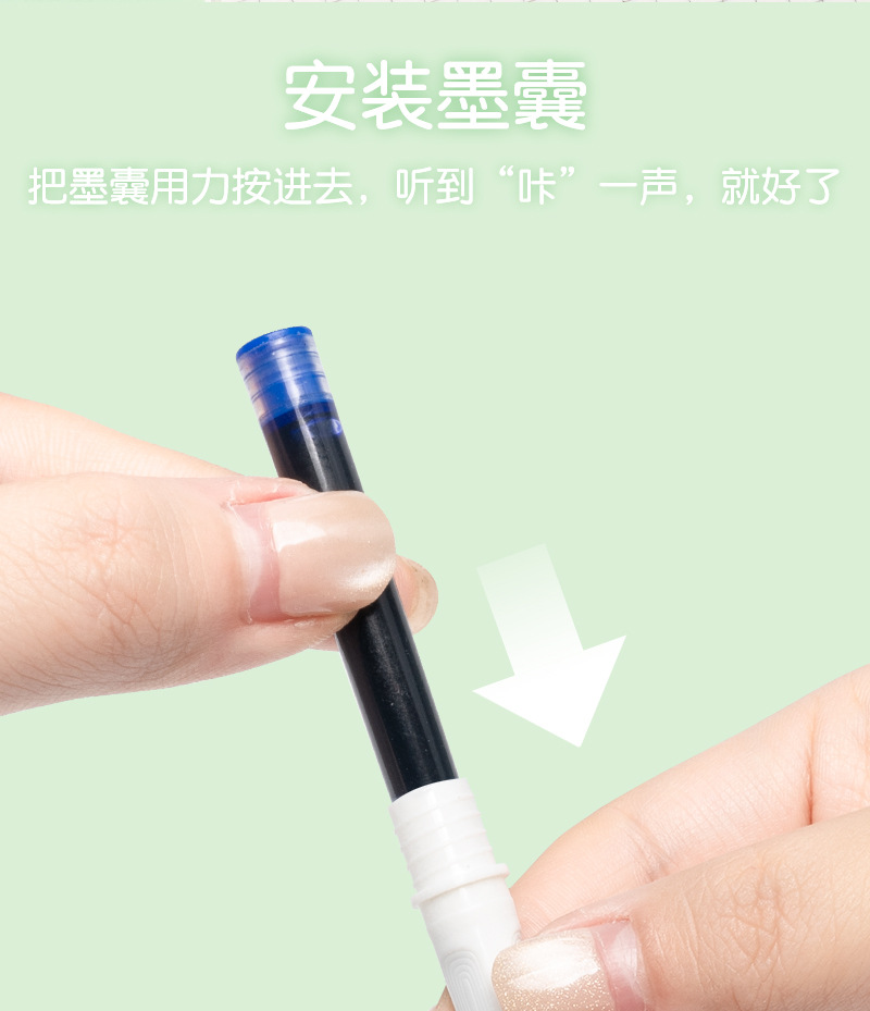 温馨提示:每支钢笔内置一支蓝色墨囊,笔杆背面上有贴条形码标签。