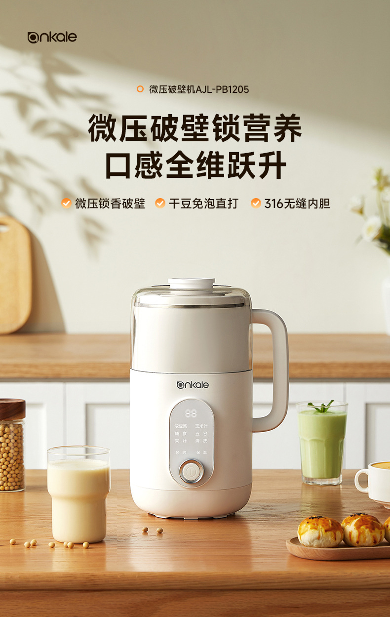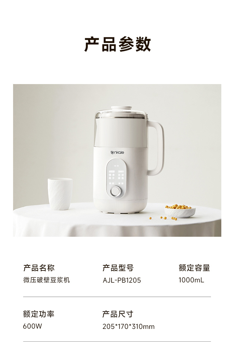 品牌: ankale 豆浆机功能: 干豆,湿豆,米糊,五谷,玉米汁,其他 容量: 1L 自动清洗功能: 有 机身材质: 316不锈钢 适用人数: 4-5人 产品尺寸: 205*170*310 额定电压: 220 型号: PB1205 货号: PB1205
