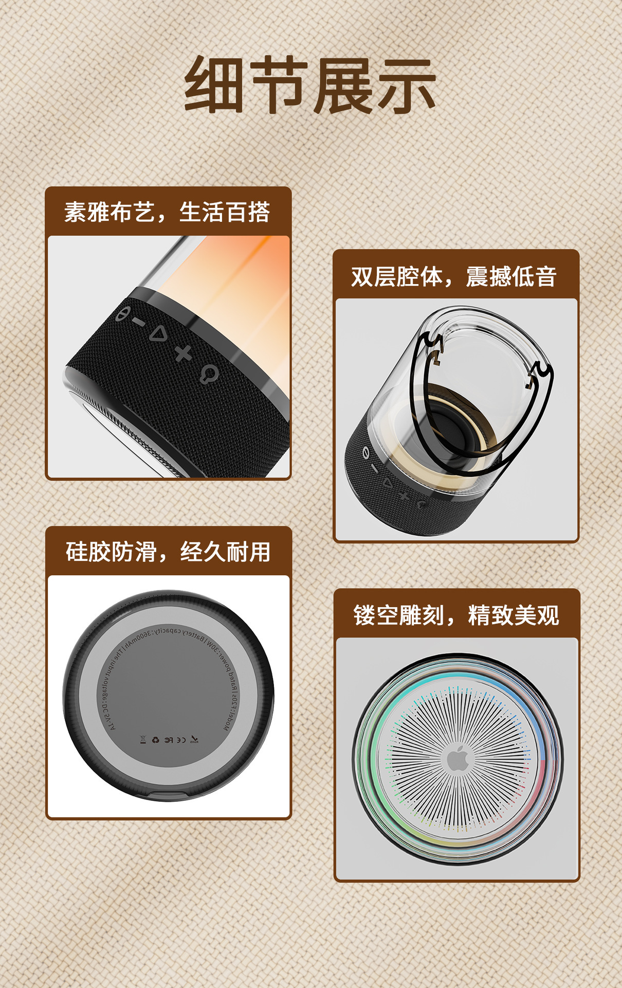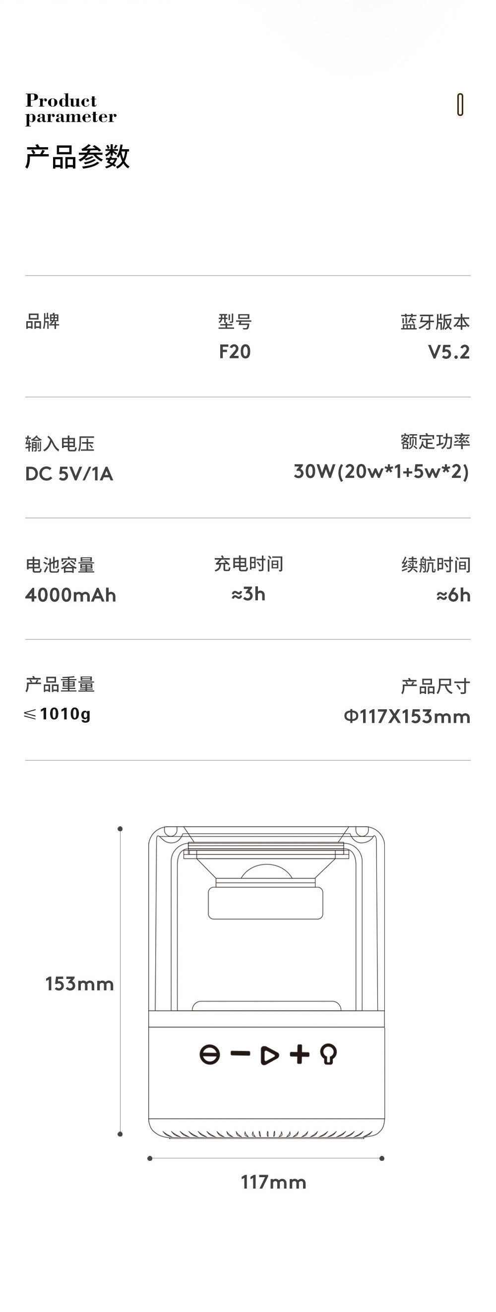 品牌: 中性 箱体材质: 塑料 电源方式: 锂电池 防水等级: 不防水 外观尺寸: 117*117*153 内置蓄电池容量: 4000mAh-6000mAh(含) 连接方式: 蓝牙连接 适用场景: 桌面,居家,移动便携 上市时间: 2022 频响范围: 30Hz-15kHz 信噪比: ≥70db 喇叭数: 3 有效距离: 10M 售后服务: 店铺三包 货号: F20 颜色: 黑色,白色 是否外贸: 是 主要销售地区: 日韩,非洲,韩国,日本,欧洲,南美,东南 是否跨境出口专供货源: 否 是否专利货源: 否 重量: 0.4 kg/件