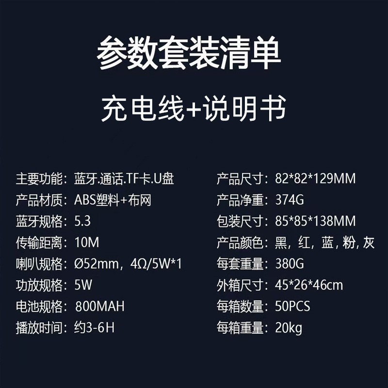 品牌: 中性 箱体材质: ABS 电源方式: 锂电池 防水等级: IPX 4 外观尺寸: 115*85*85mm 内置蓄电池容量: 800mAh-1000mAh(含) 连接方式: 蓝牙连接 适用场景: 其他 上市时间: 2024 频响范围: 100HZ-20KHZ 信噪比: ≥70db 喇叭数: 1个 有效距离: 10米 售后服务: 店铺三包 货号: S620 颜色: 蓝色,红色,黑色,灰色 是否外贸: 是 主要下游平台: 亚马逊,速卖通,独立站,其他 主要销售地区: 其他 是否跨境出口专供货源: 是 重量: 0.4 kg/台
