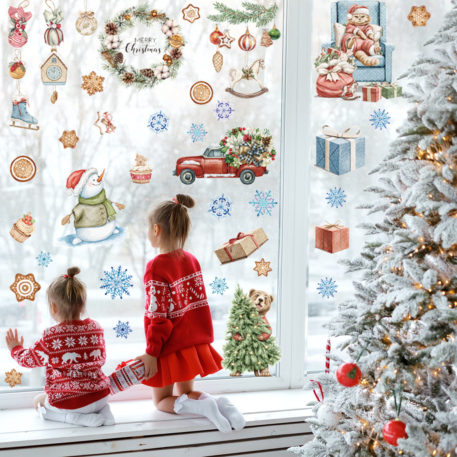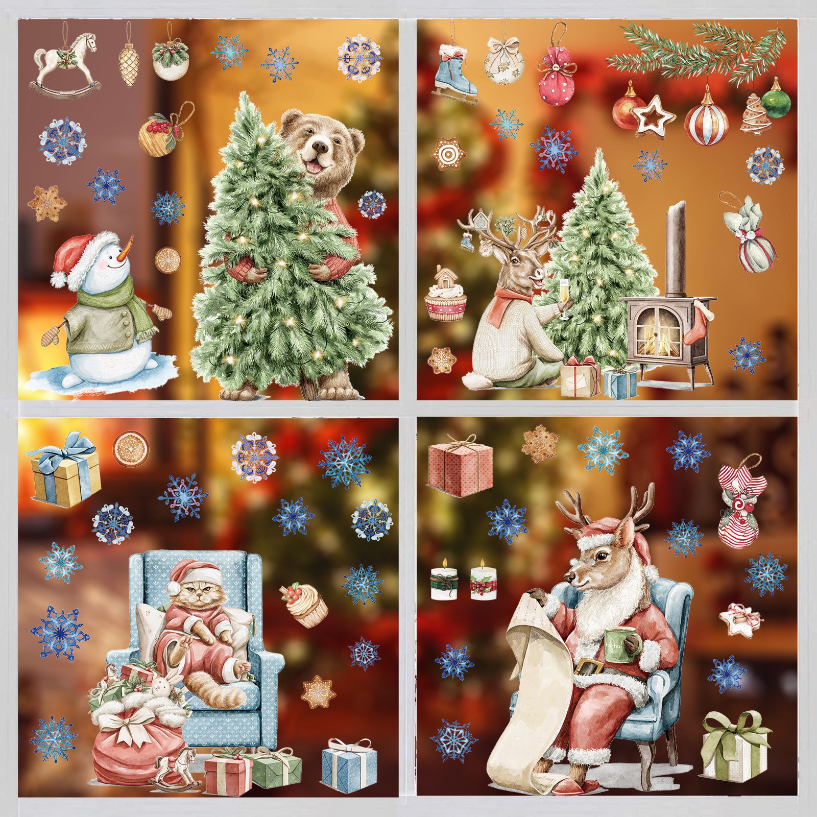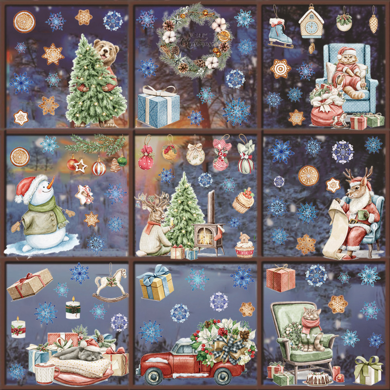 新款亚马逊圣诞水彩动物猫咪静电窗贴橱窗玻璃门圣诞节装饰贴自粘