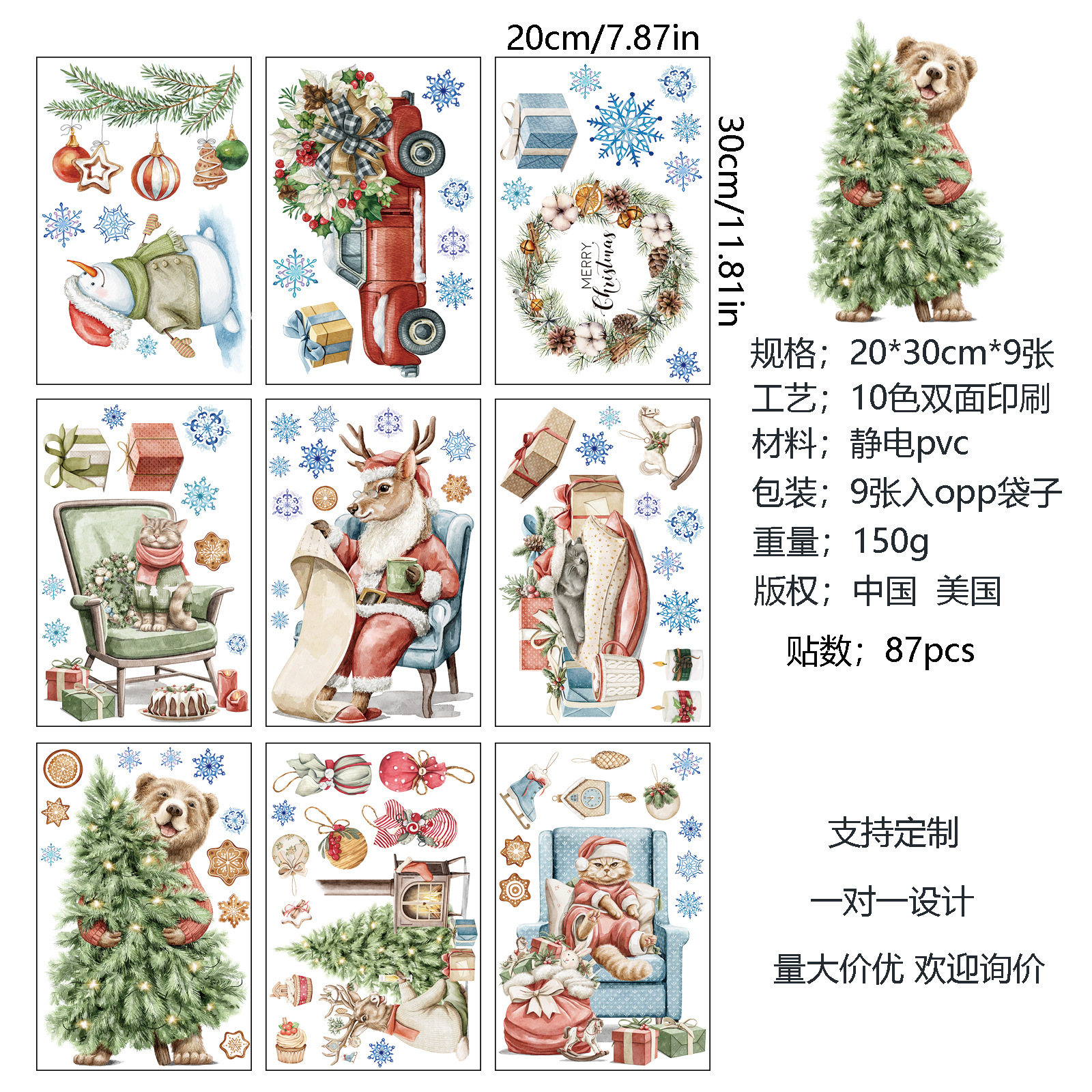 材质: PVC 功能: 美化装饰 墙贴类型: 防水墙贴 是否有版权或专利: 否 品牌: 艾霖 款式: 平面墙贴 风格: 北欧 空间: 客厅,卧室,书房,餐厅,玄关 图案: 萌趣动物 片数: 5片以上 规格: 9张动物圣诞款 重量: 0.5 kg/套