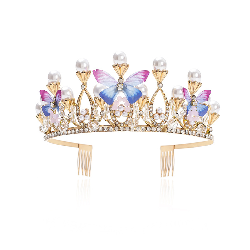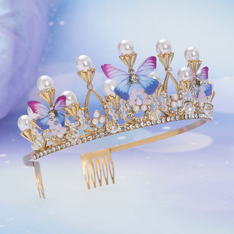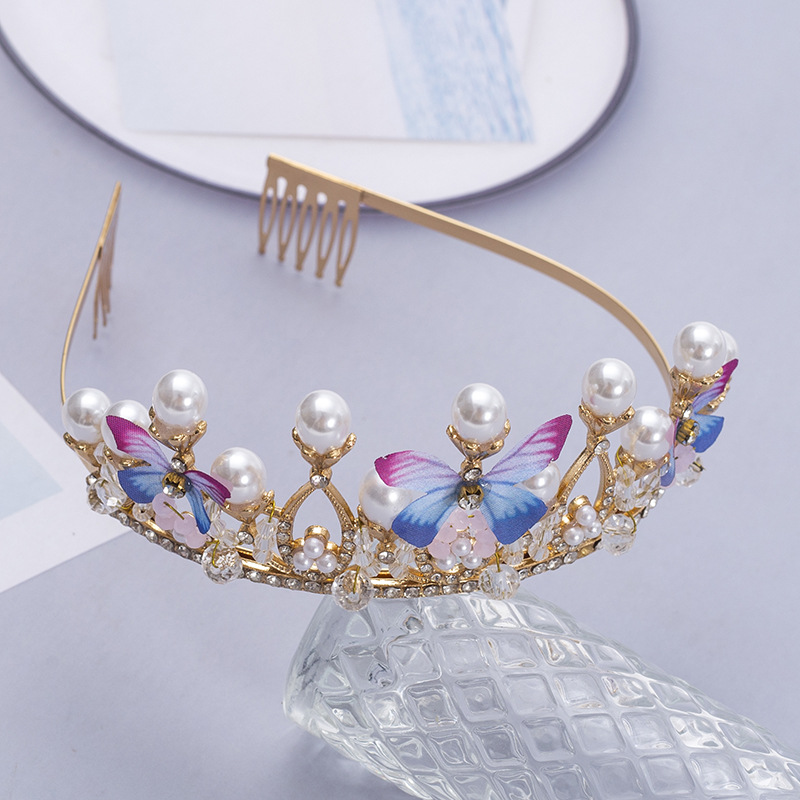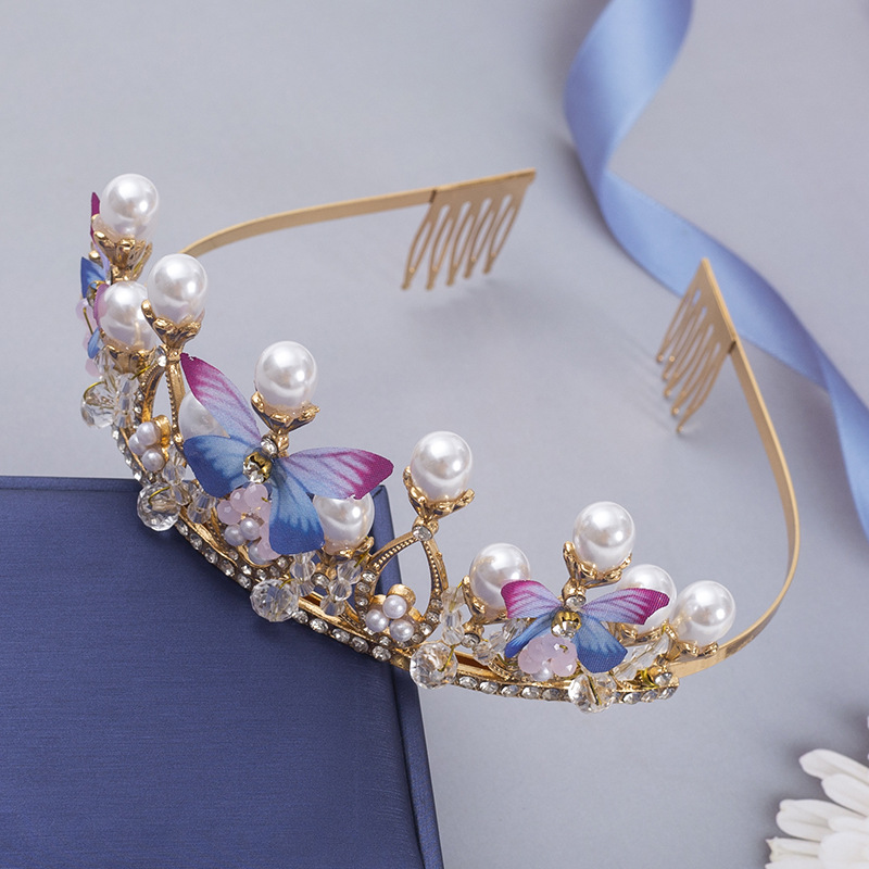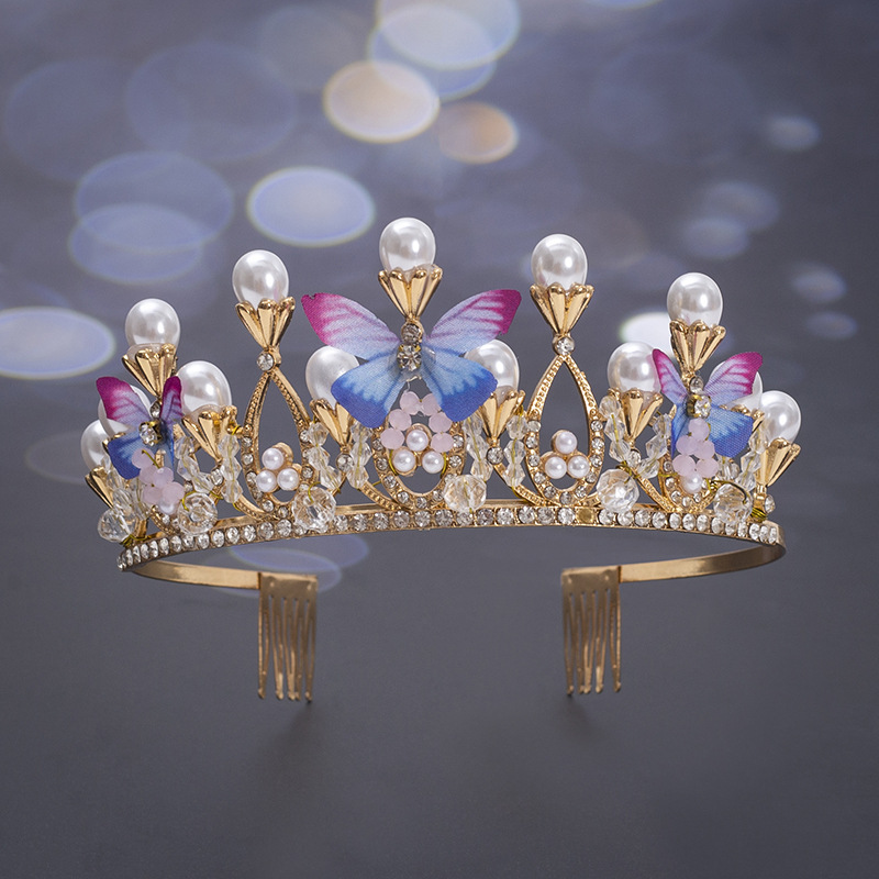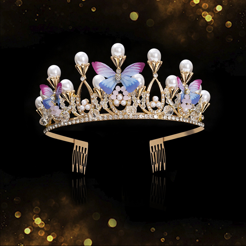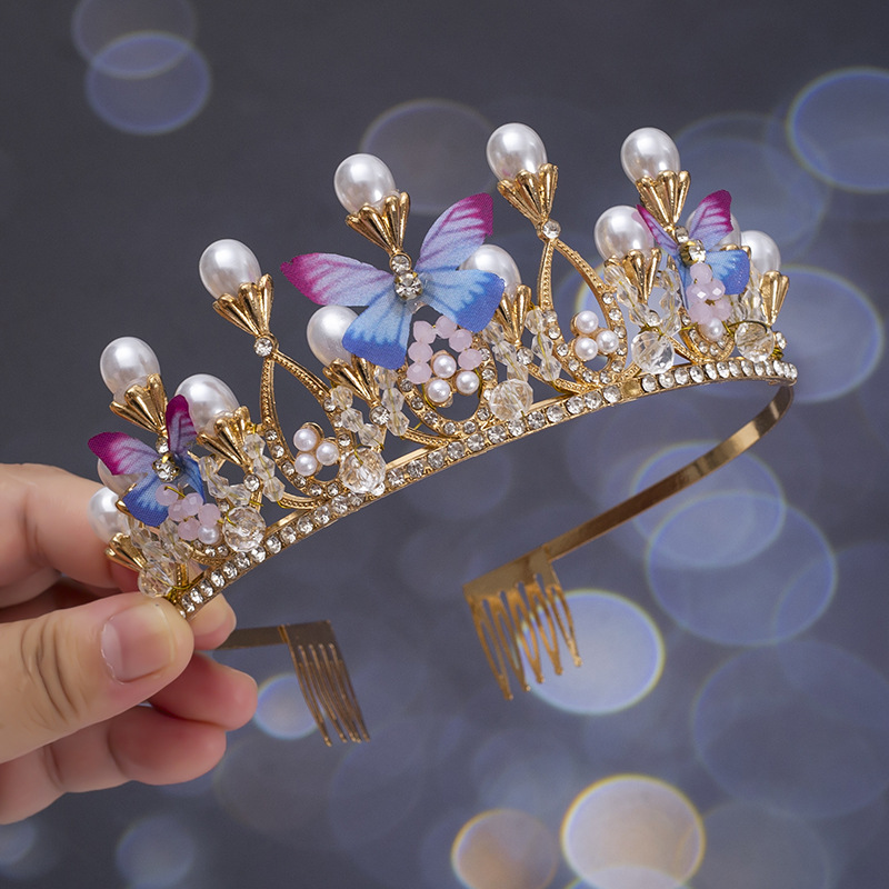 新款儿童珍珠手工水晶皇冠发属儿童舞台走秀礼服头饰简约蝴蝶设计