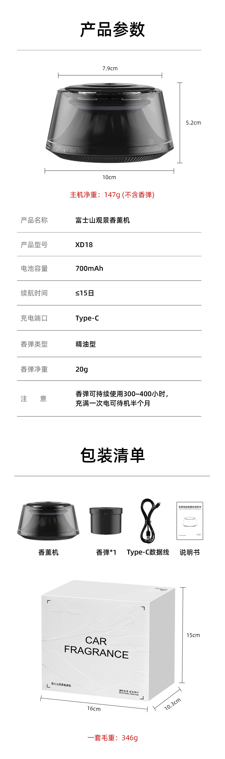 【产品清单】:主机、香弹、USB充电线、说明书