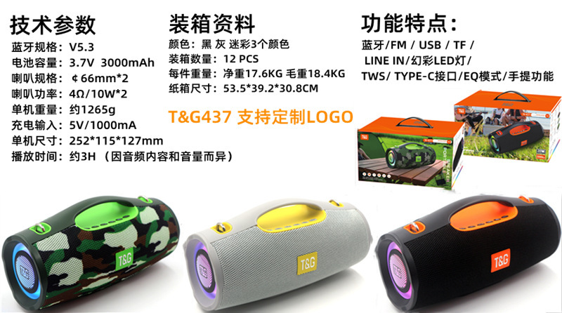 品牌: 中性 箱体材质: ABS 电源方式: 锂电池 防水等级: 不防水 外观尺寸: 252*115*127mm 内置蓄电池容量: 2000mAh-4000mAh(含) 连接方式: 蓝牙连接 适用场景: 车载,桌面,健身运动,户外,居家,移动便 上市时间: 2024 频响范围: 100HZ-20KHZ 信噪比: ≥95dB 喇叭数: 2 有效距离: 15米 售后服务: 店铺三包 货号: TG-437 颜色: 黑色,灰色,迷彩 是否外贸: 是 主要销售地区: 日韩,非洲,韩国,欧洲,中东,拉丁美洲, 是否跨境出口专供货源: 是 是否专利货源: 否 重量: 0.4 kg/台