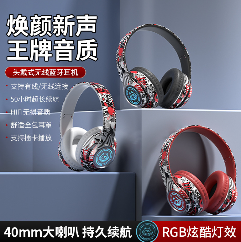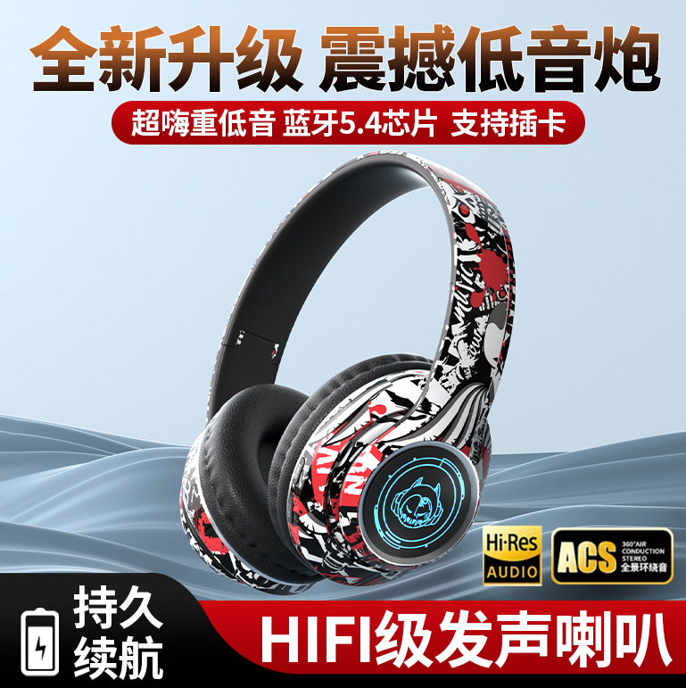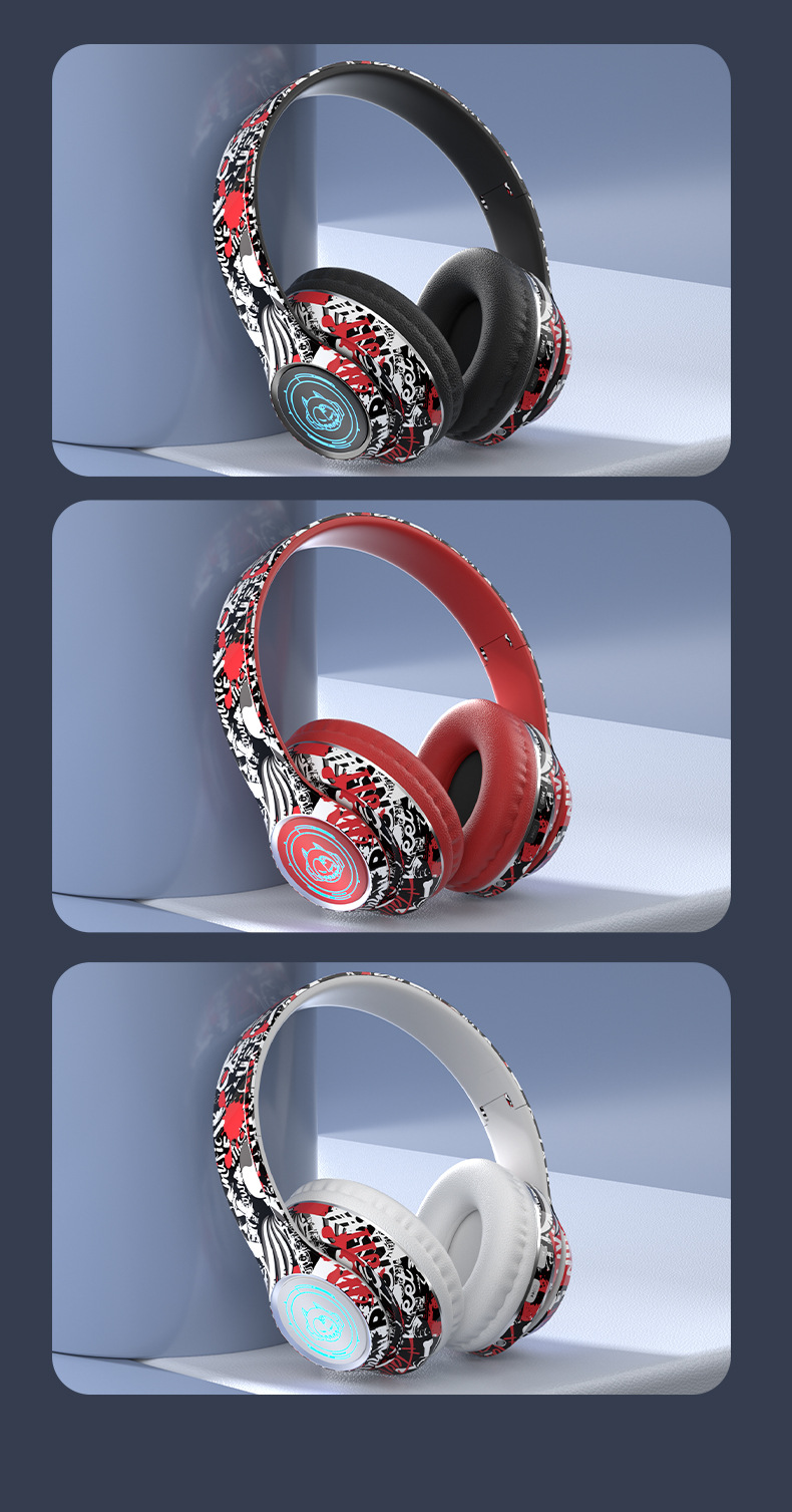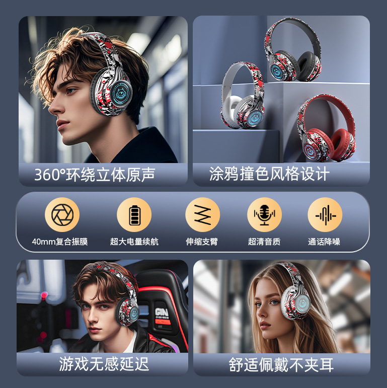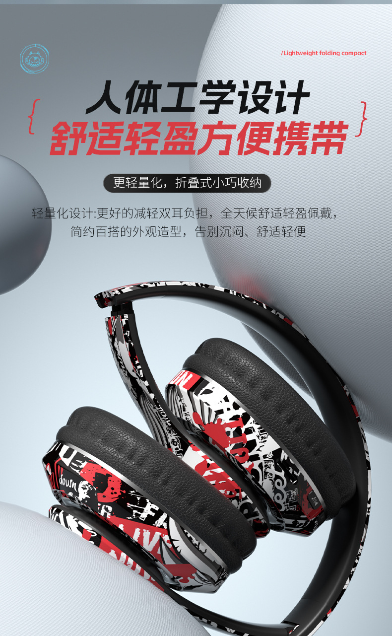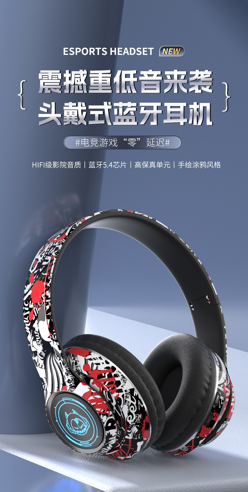 品牌: 中性 功能: 超长续航,通话功能,支持音乐,电竞低延迟 防水性能: 不支持防水 芯片类型: 杰理 材质: PC+ABS 续航时间: 8小时以上 使用方式: 头戴式 传输范围: 10米 蓝牙协议: 5.0 是否单双耳: 双边立体声 颜色: 涂鸦白,涂鸦黑,涂鸦红 主要下游平台: 亚马逊,速卖通 主要销售地区: 欧洲,南美,北美 有可授权的自有品牌: 是 是否跨境出口专供货源: 是 支持订制: 支持 是否专利货源: 否 模具类型: 私模 上市年份/季节: 2025 风格: 简约风 重量: 0.4 kg/副