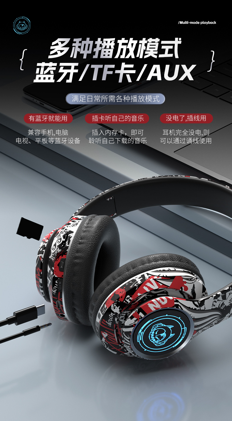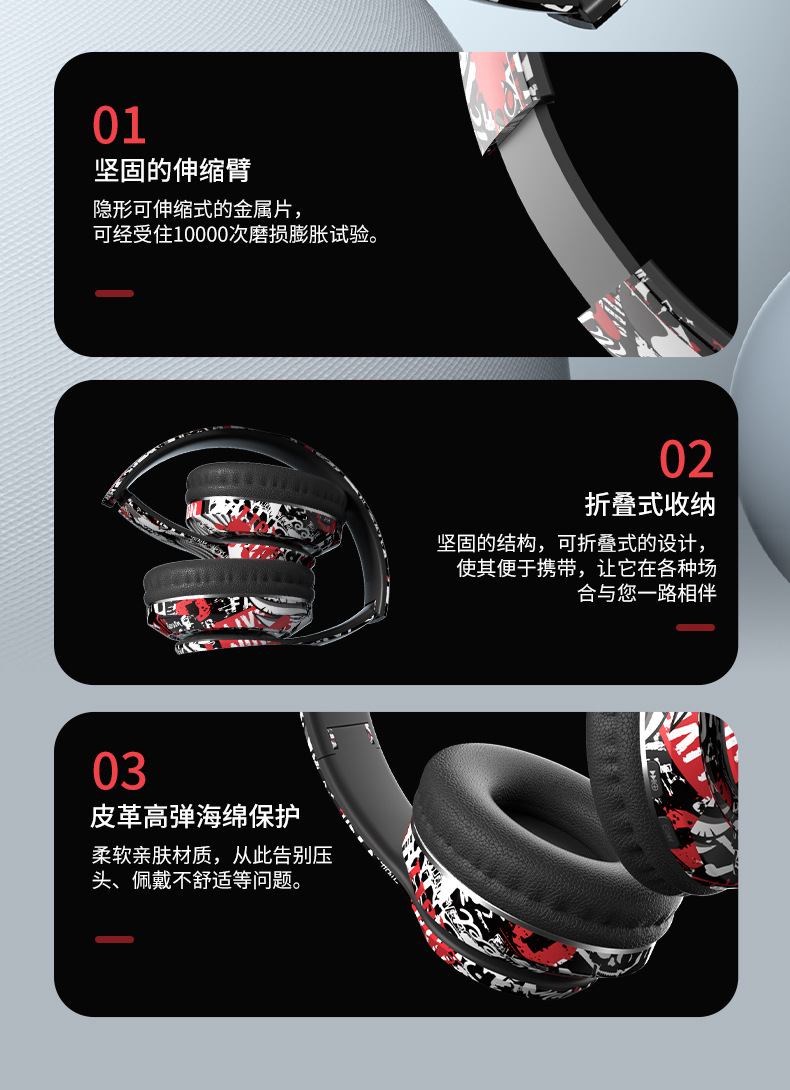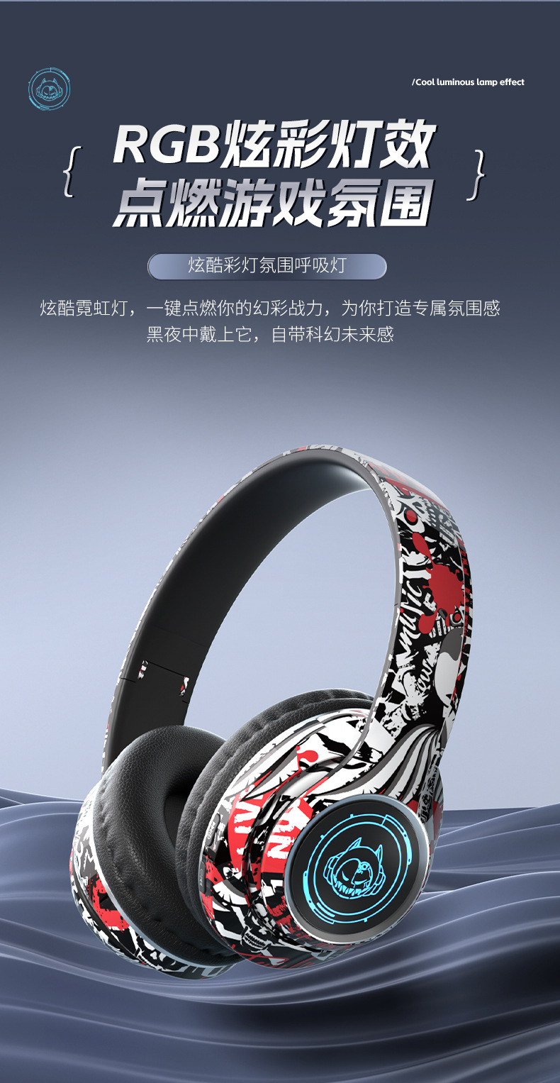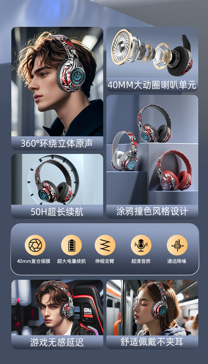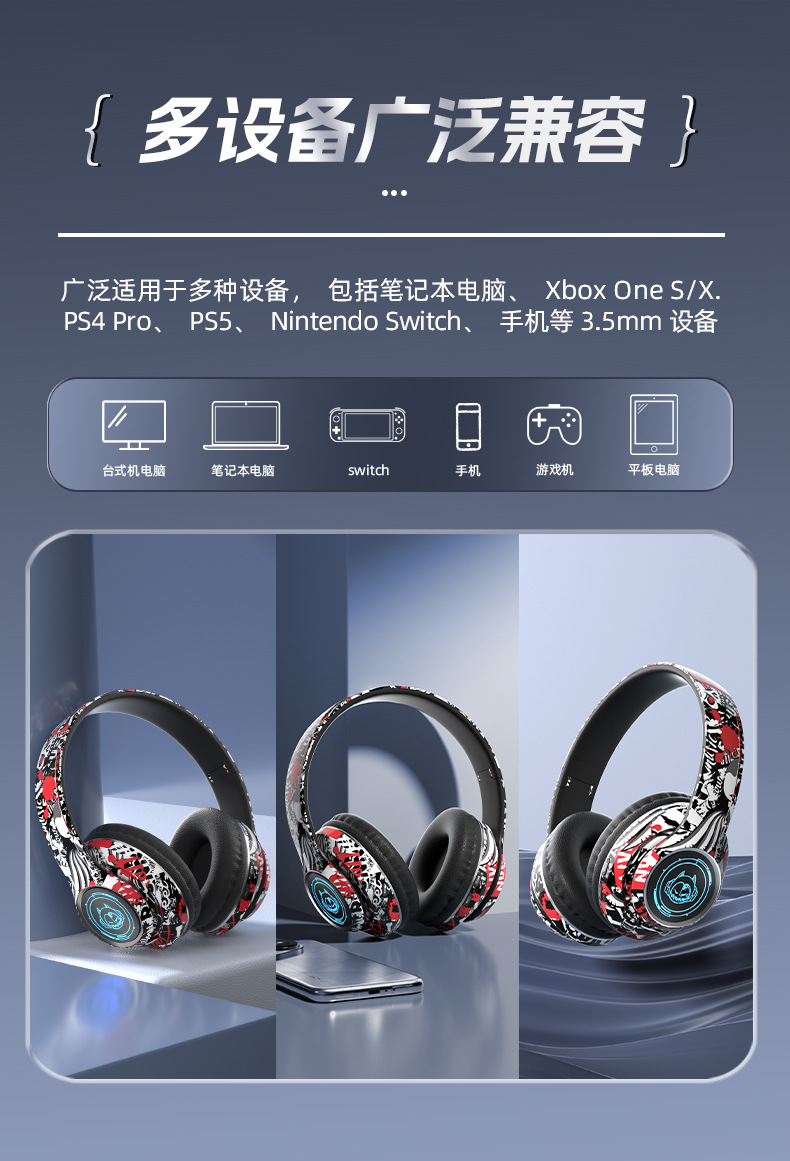品牌: 中性 功能: 超长续航,通话功能,支持音乐,电竞低延迟 防水性能: 不支持防水 芯片类型: 杰理 材质: PC+ABS 续航时间: 8小时以上 使用方式: 头戴式 传输范围: 10米 蓝牙协议: 5.0 是否单双耳: 双边立体声 颜色: 涂鸦白,涂鸦黑,涂鸦红 主要下游平台: 亚马逊,速卖通 主要销售地区: 欧洲,南美,北美 有可授权的自有品牌: 是 是否跨境出口专供货源: 是 支持订制: 支持 是否专利货源: 否 模具类型: 私模 上市年份/季节: 2025 风格: 简约风 重量: 0.4 kg/副