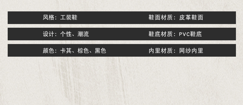 鞋面材质: 皮革 鞋底材质: PVC 内里材质: 网纱 鞋底工艺: 注塑鞋 款式: 马丁靴 筒高: 中筒 适用性别: 男 货源类别: 现货 品牌: 泛司 货号: L-1763 适用年龄段: 成年 鞋头形状: 圆头 功能: 增高 鞋跟高度: 平跟 流行靴款: 马丁靴 鞋跟形状: 马蹄跟 流行元素: 皮革拼接 风格: 日常休闲 厚薄: 普通厚 图案: 纯色