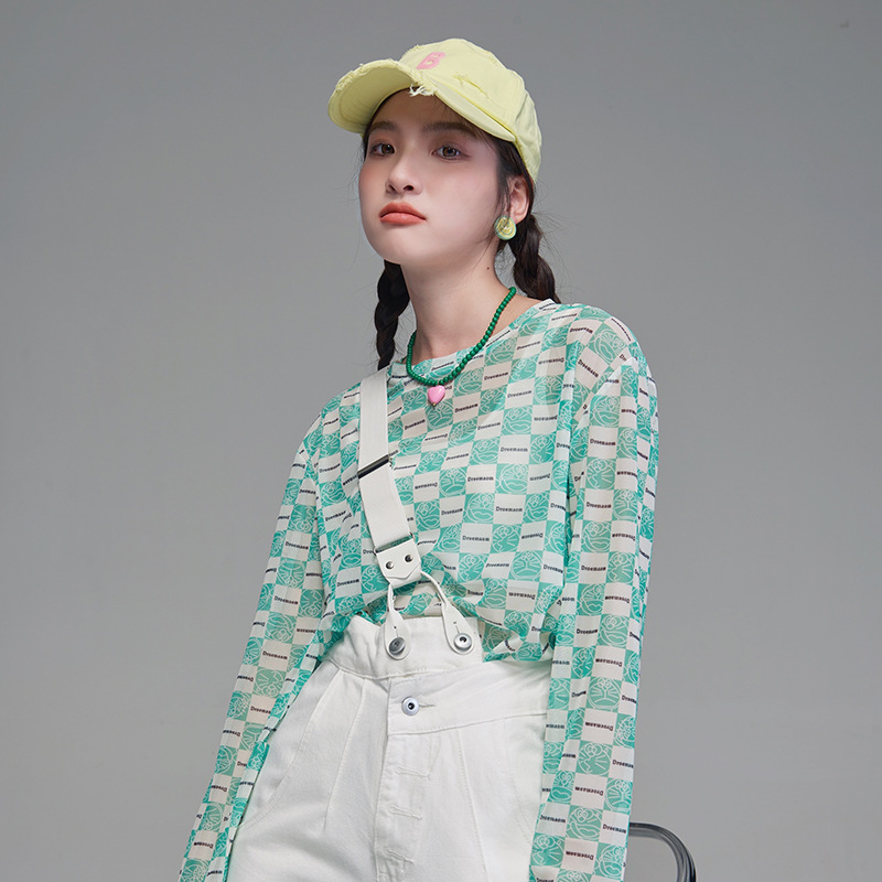 夏季新款创意棋盘格叮当猫冰丝打底衫女防晒内搭薄款时尚网纱T恤
