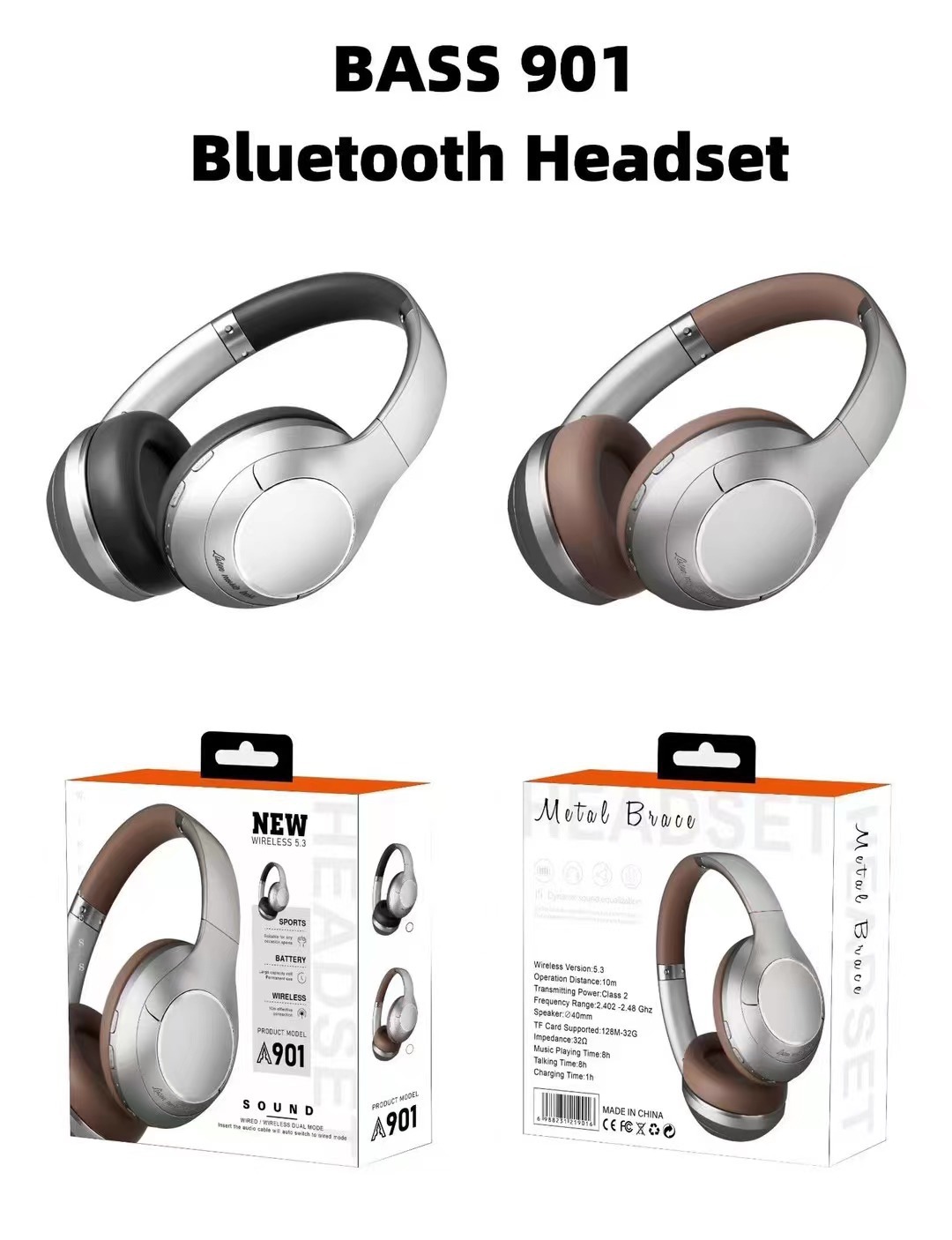 901BT创意复古金属无线头戴式蓝牙耳机金属喷砂装饰片 FM折叠耳机 English | 投诉