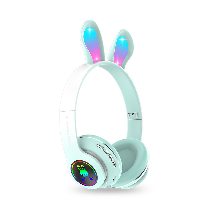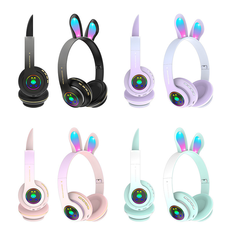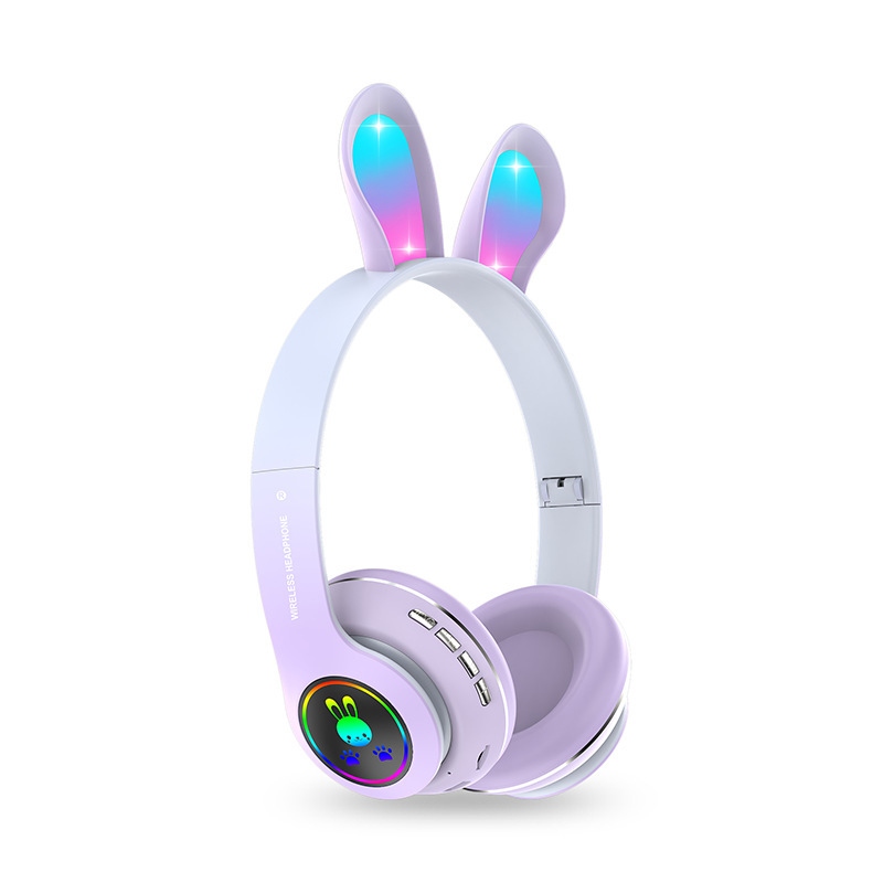 跨境外贸 PM08新款头戴式兔耳学生蓝牙耳机发光可爱折叠粉紫黑绿