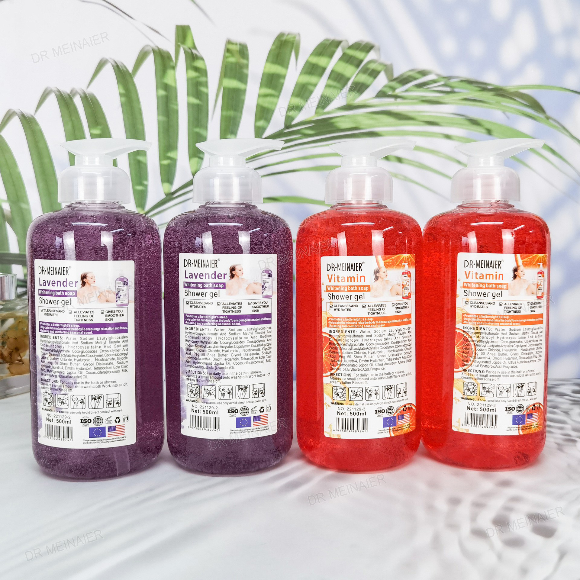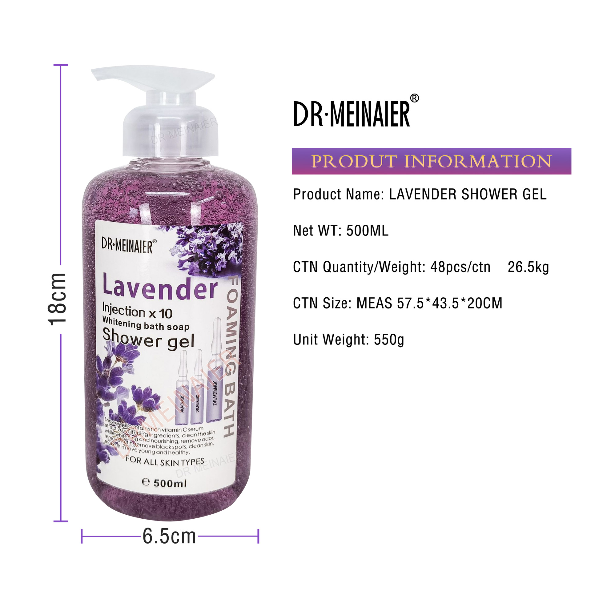 产品名称 500ml身体沐浴露 品牌:DRMEINAIER单品毛重 550g 净含量:500ml装箱规格 48pcs/ctns 箱重26.5kg/箱单品尺寸 18*6.5cm装箱尺寸 MEAS 57.5*43.5*20 cm包装:如图 可按客户需求来订做
