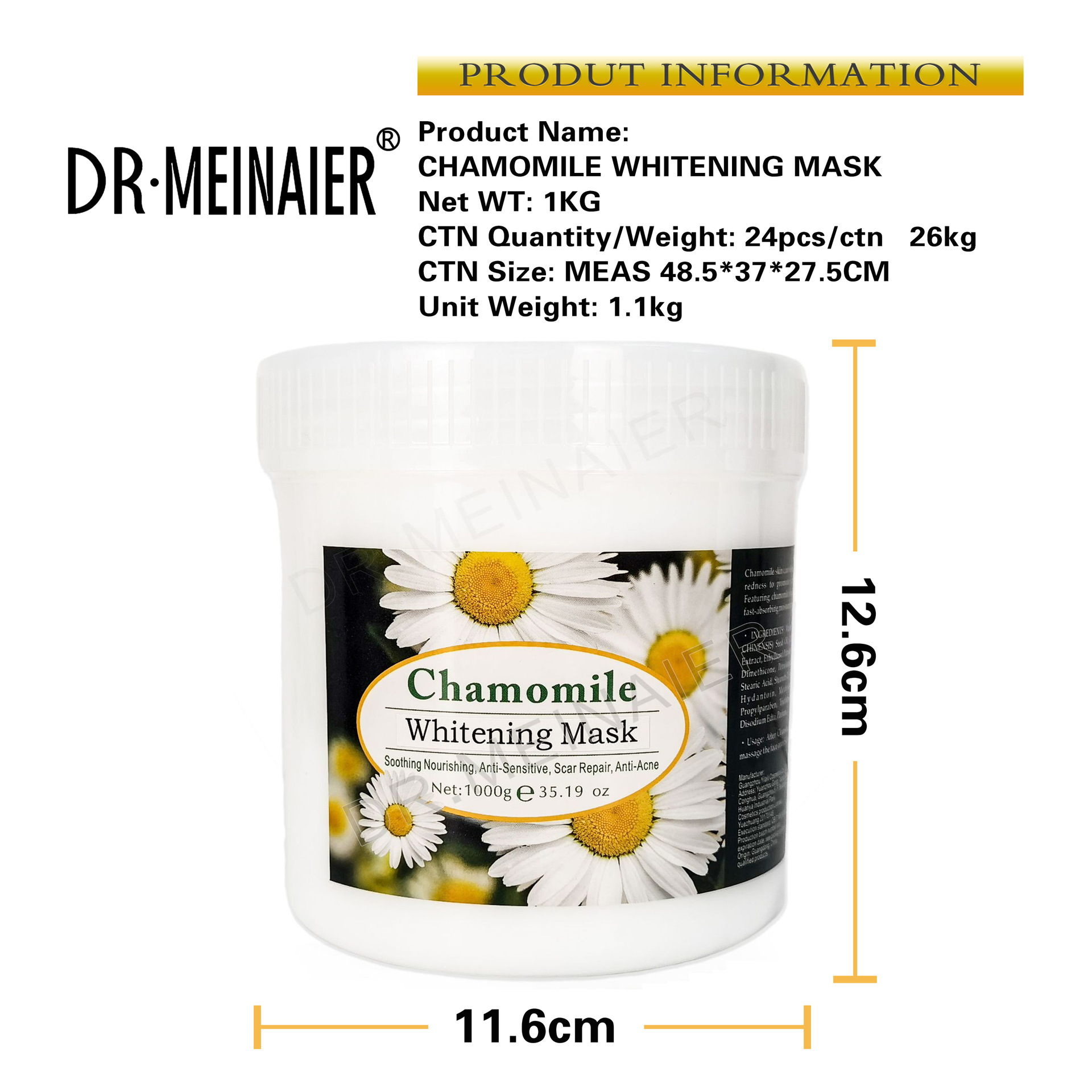 产品名称 :1000g面膜膏 品牌:DRMEINAIER单品毛重 :1100g 净含量1000g装箱规格 :24pcs/ctns 箱重26kg箱单品尺寸 :11.6*12.6cm装箱尺寸 :MEAS48.5*37*27.5 CM包装:如图 可按客户需求来订做