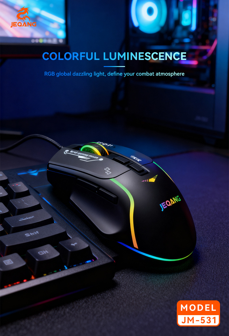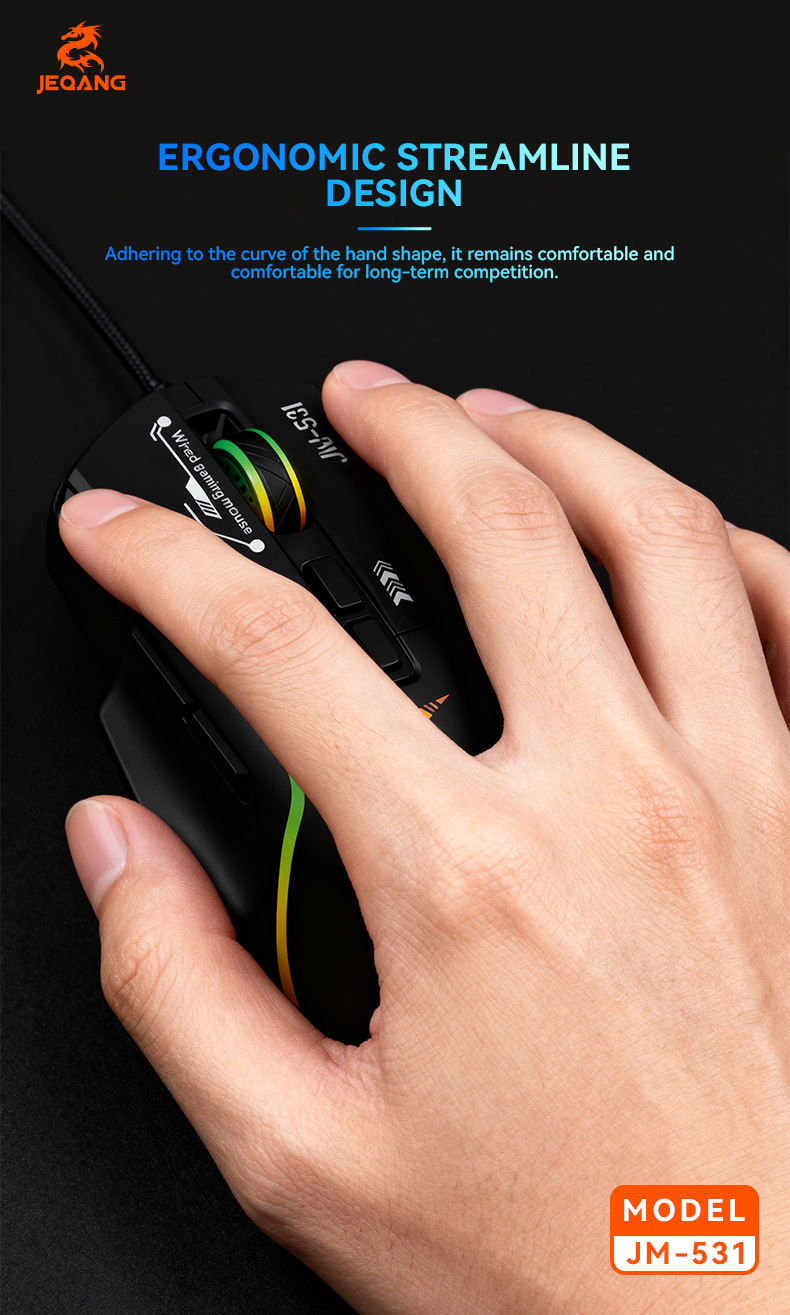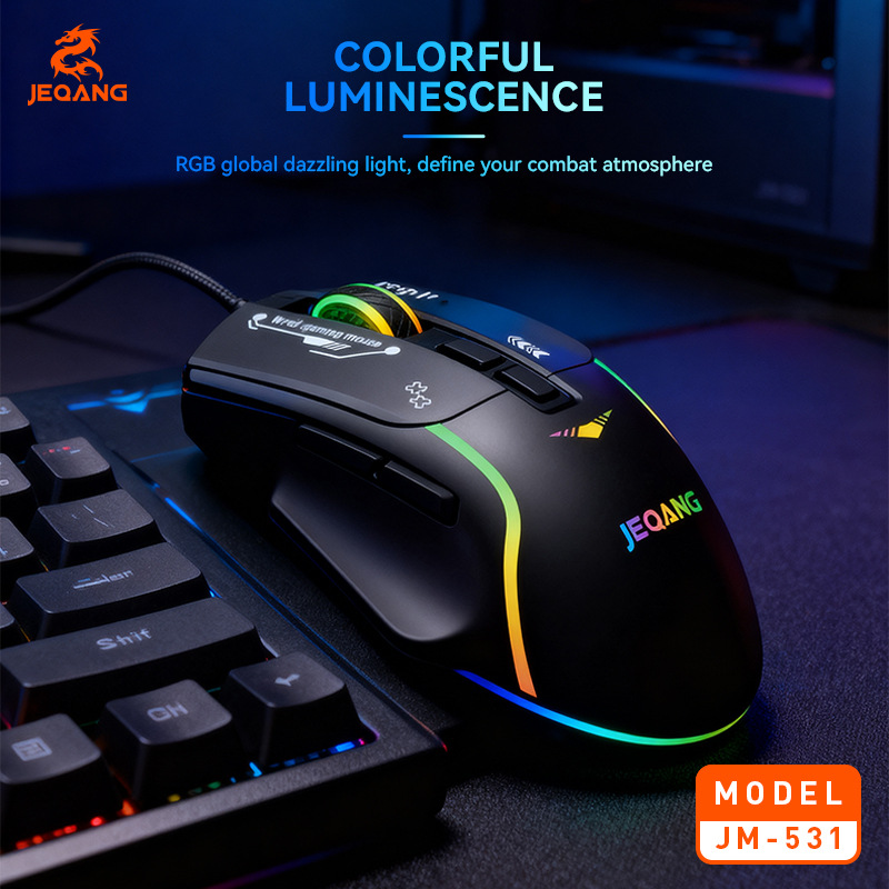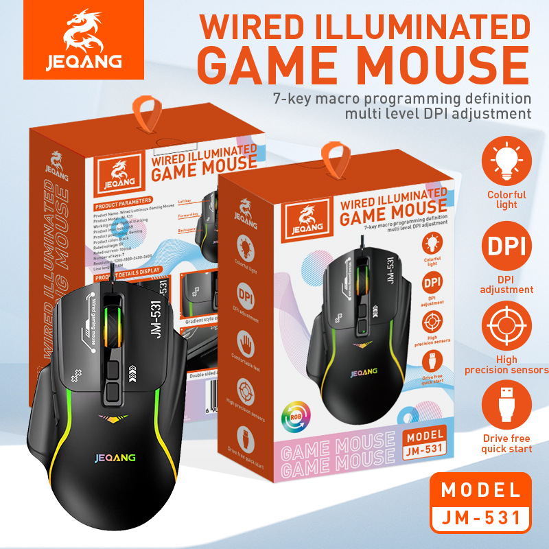 与电脑连接方式: 有线 类型: 光电鼠标 光电分辨率: 1600dpi 接口: USB 工作方式: 光电 分辨率可调: 四档 按键数: 7个 货号: JM-531 上市时间: 2025 鼠标大小: 普通鼠(100-120mm) 适用机型: 台式机 无线传输频率: 2.4GHz 是否支持人体工程学: 支持 操作距离: 其他 滚轮方向: 触控滚轮 线长: 1.5 产品尺寸: 10.5*4.5*15cm(彩盒尺寸) 产品重量: 120g