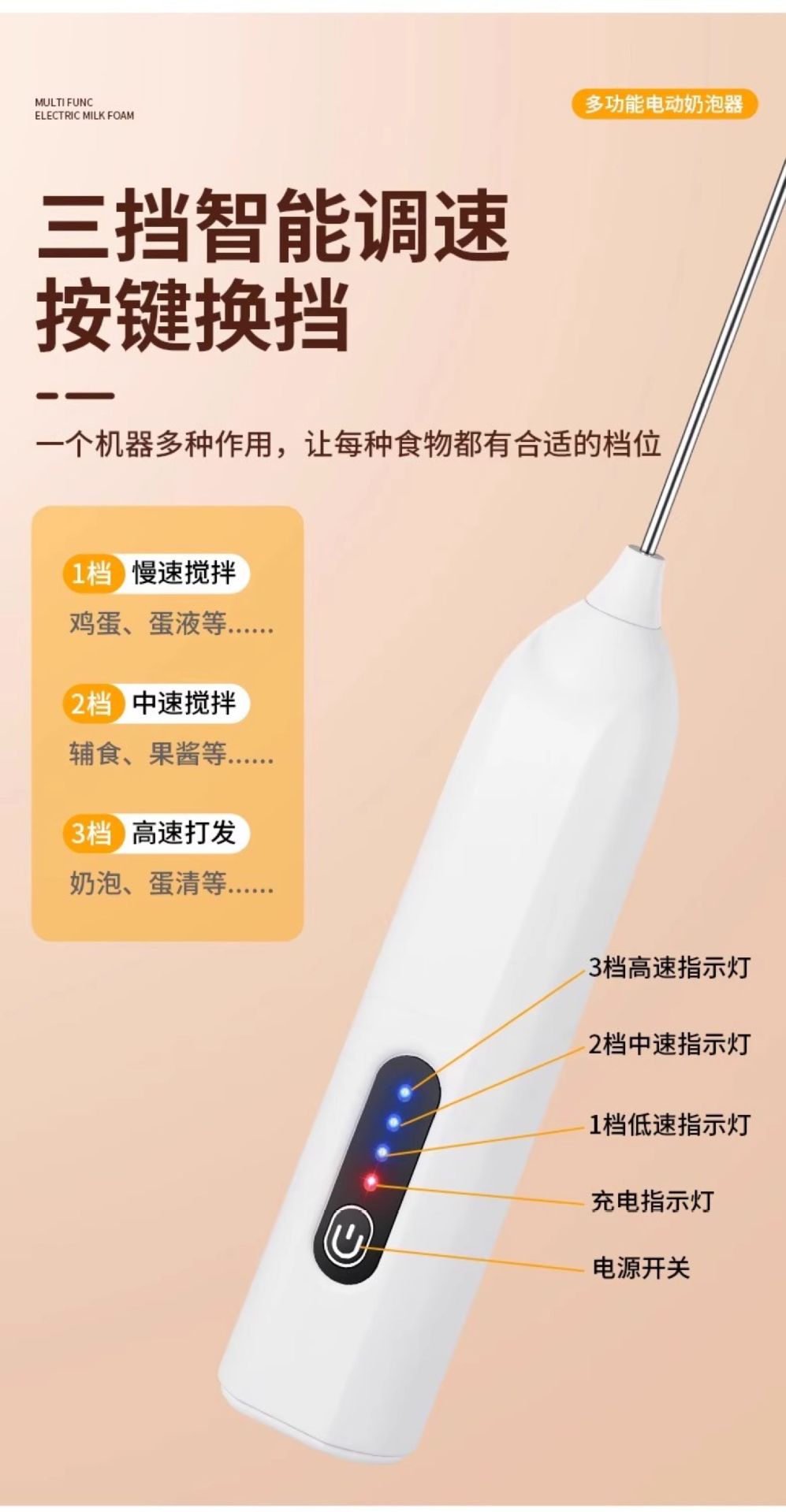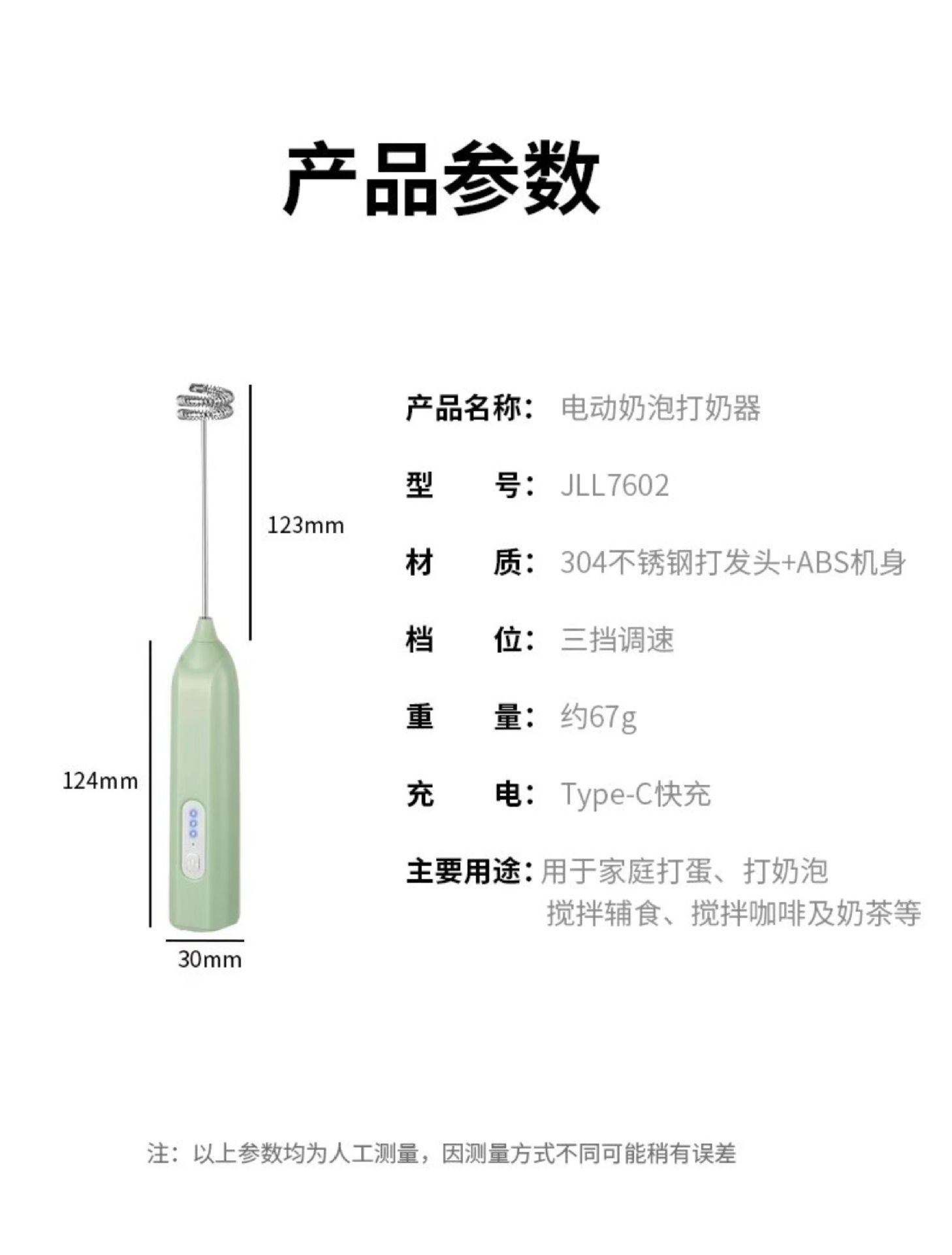功率: 150W及以下 档位: 3档 功能: 搅拌,打蛋,家用,和面,烘焙,打奶油 放置方式: 手持式 产品分类: 打蛋器 额定电压: 36V及以下 品牌: 启旺 货号: 31821 型号: 0001 上市时间: 2025.6.6 颜色: 白色,绿色 规格: 三档调节/快速打发/带充电线 是否跨境出口专供货源: 否 重量: 0.5 kg/个