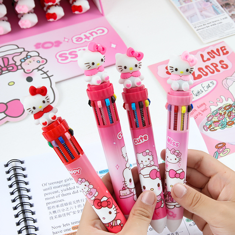 可爱猫咪10色圆珠笔卡通多色手账笔按压式彩色多功能笔学生盒装笔