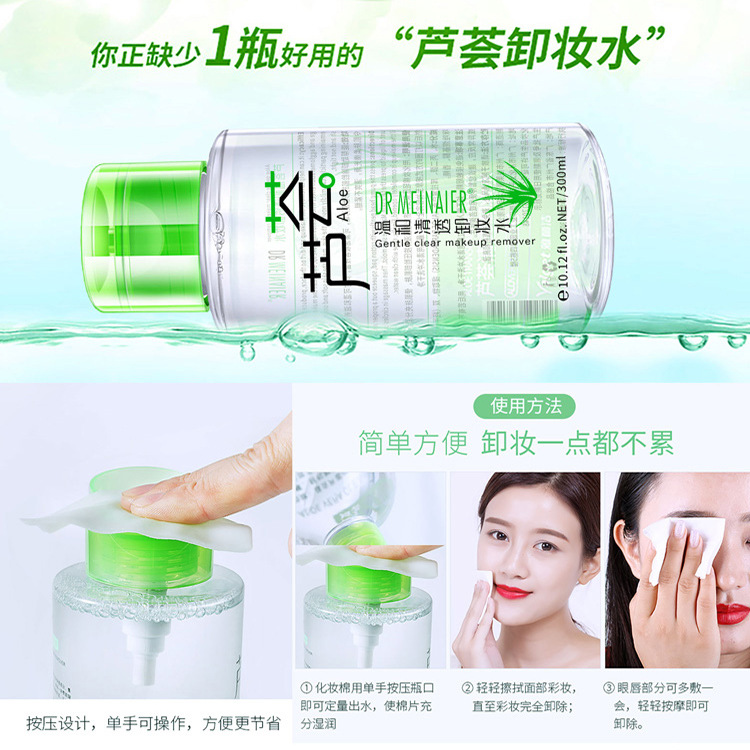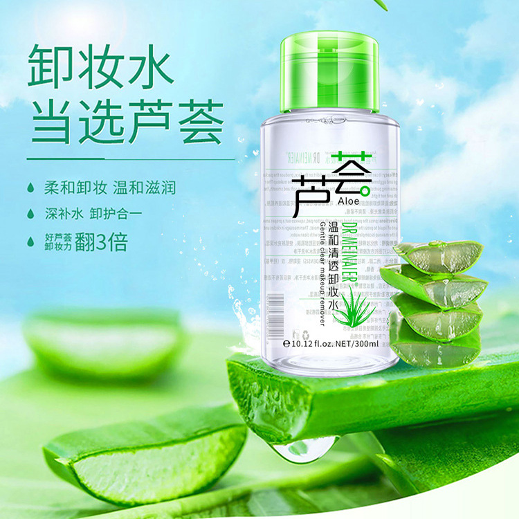 产品名称 :300ml芦荟卸妆水 品牌:DRMEINAIER单品毛重 :355g 净含量:300ml装箱规格 :48pcs/ctns 箱重17kg/箱单品尺寸:14.8*6.3装箱尺寸 ME42.5*29.1*34包装:如图 可按客户需求来订做