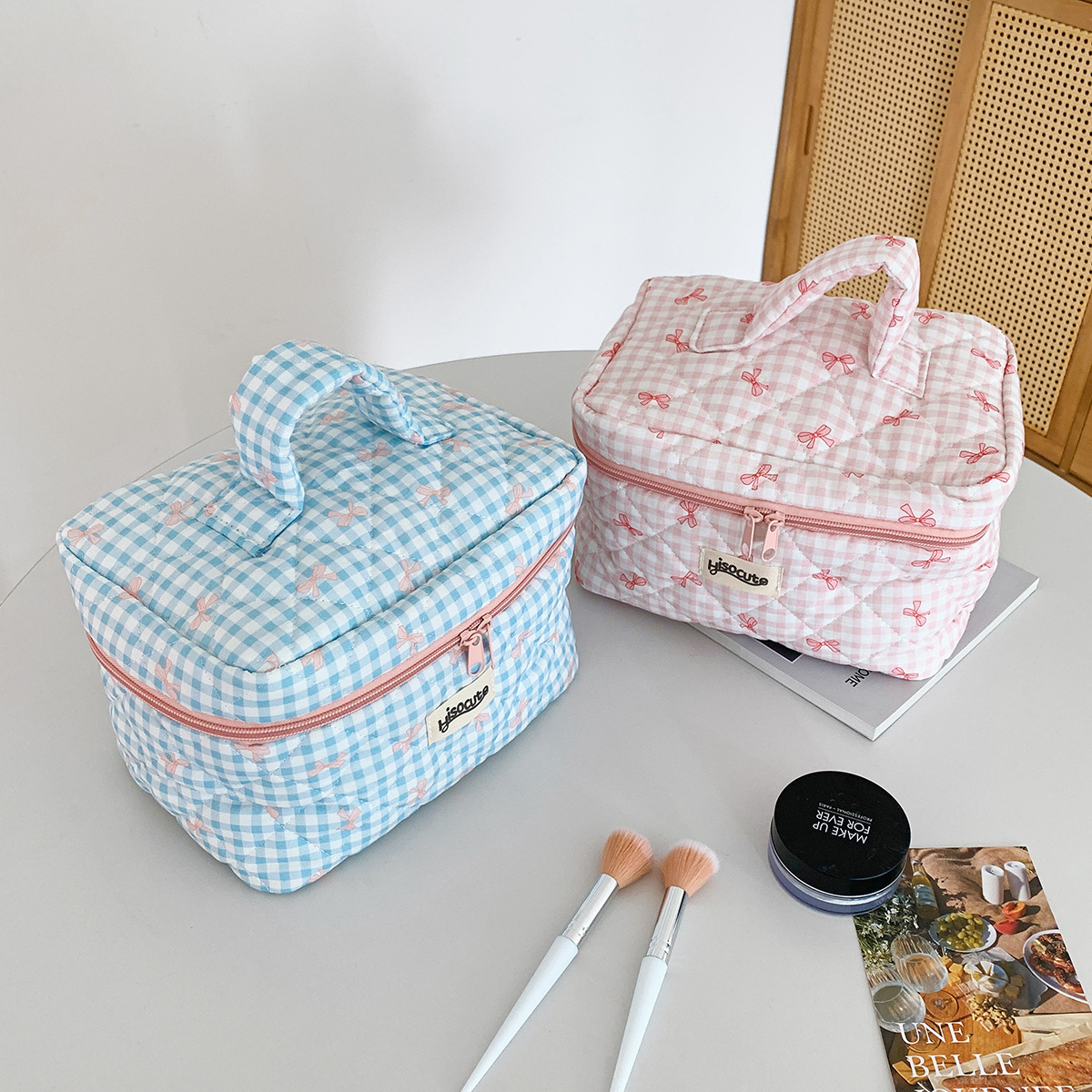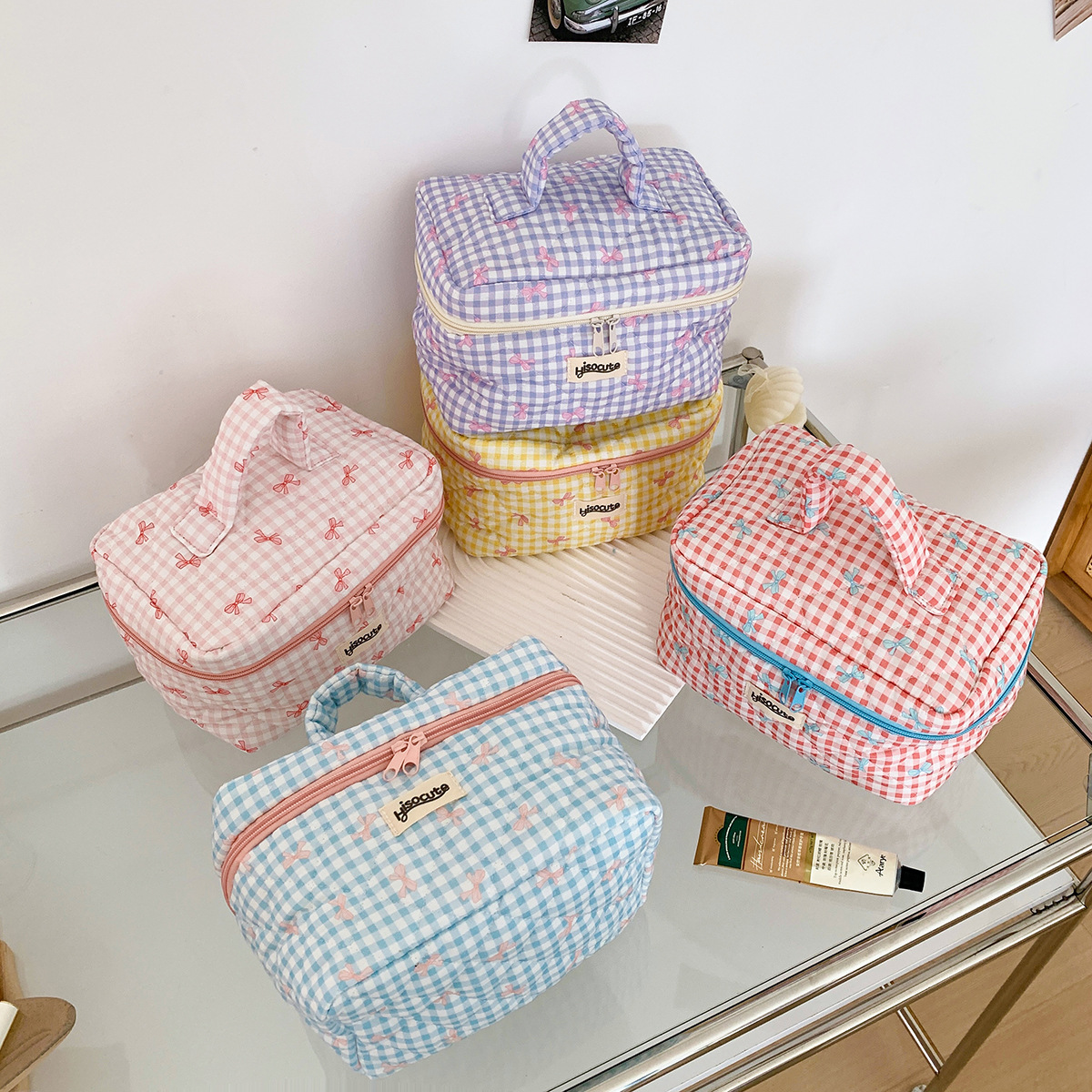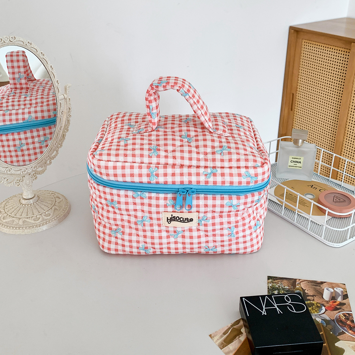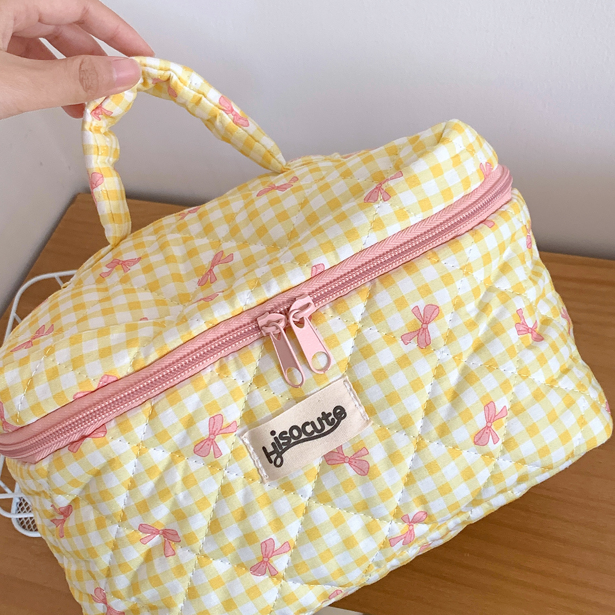 ins简约格子化妆包韩版蝴蝶结大容量洗漱收纳包高颜值手提护肤包