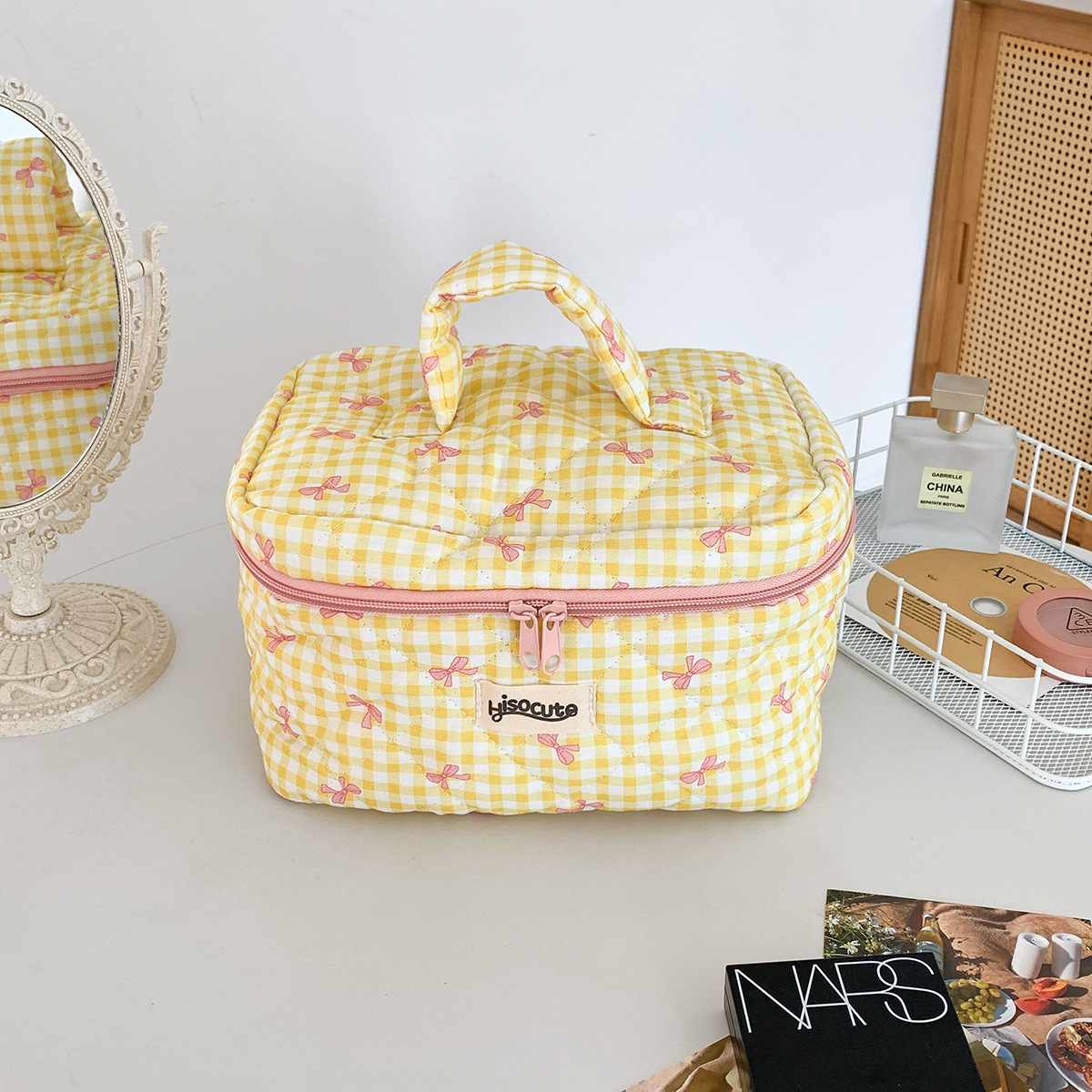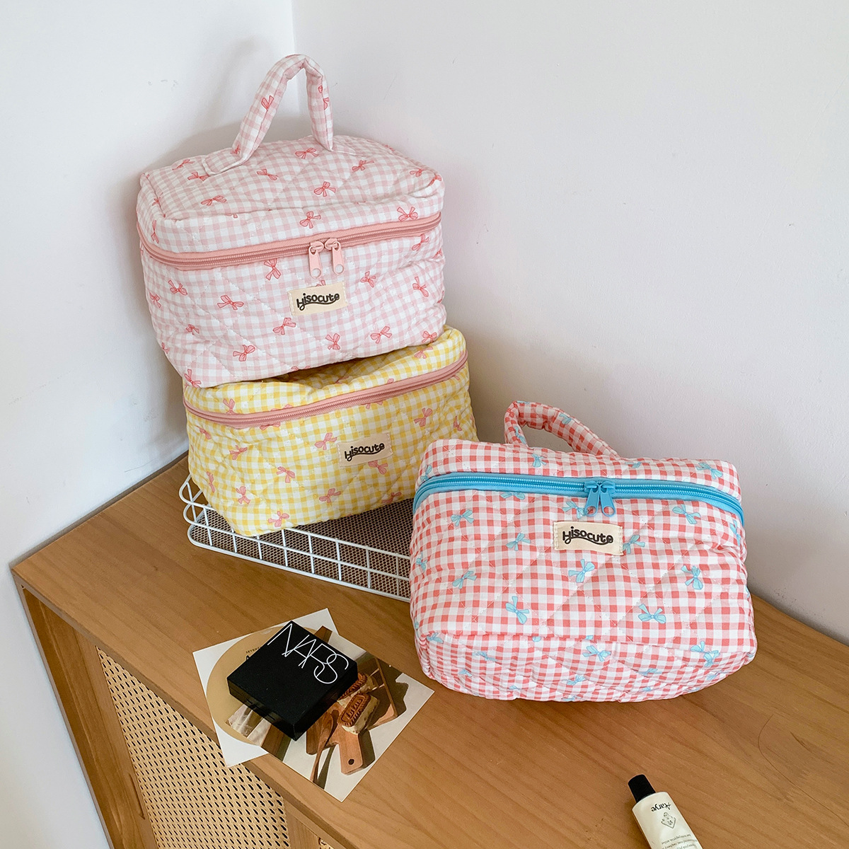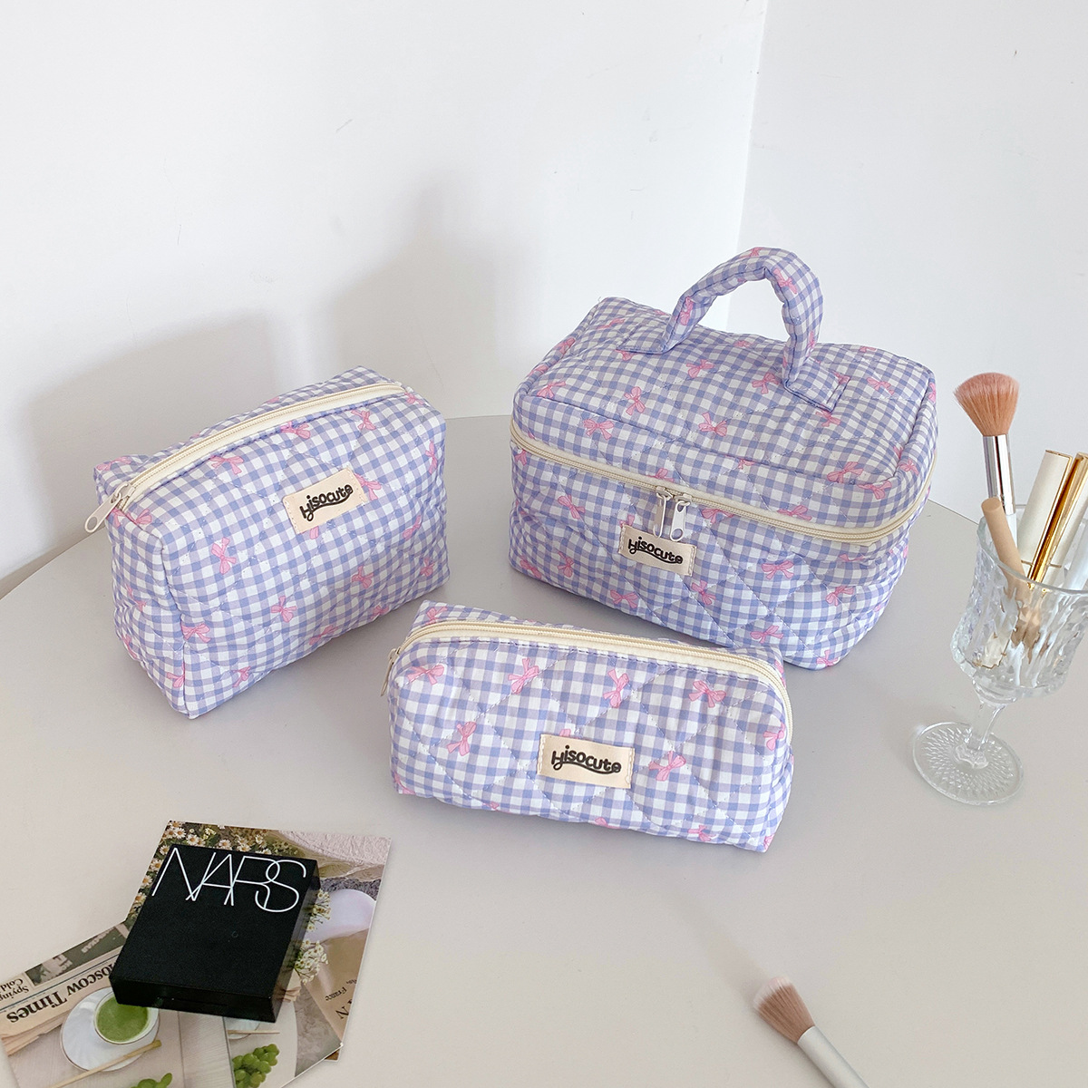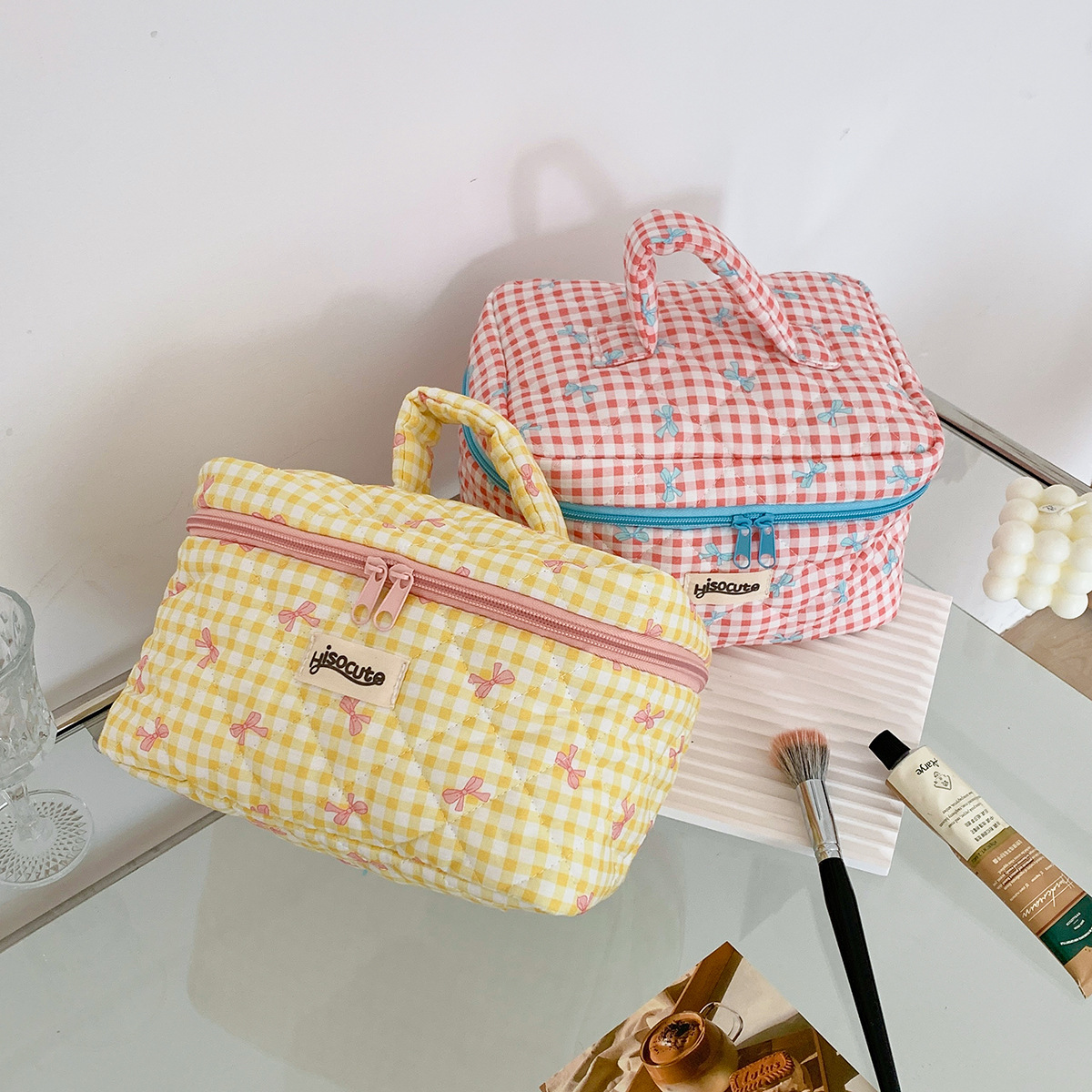 ins简约格子化妆包韩版蝴蝶结大容量洗漱收纳包高颜值手提护肤包