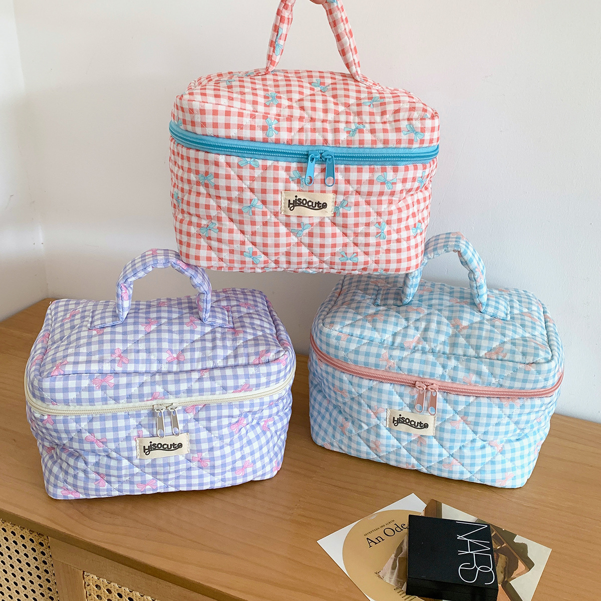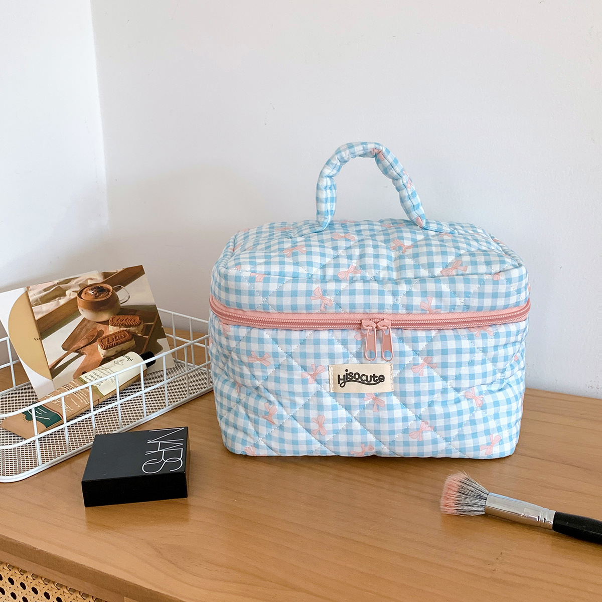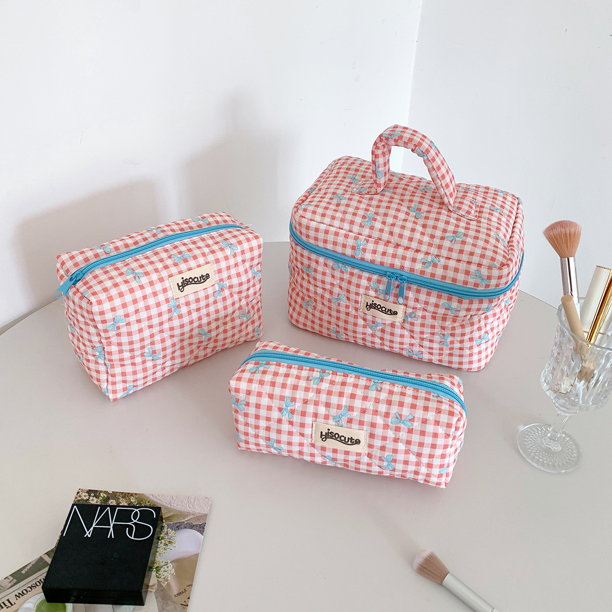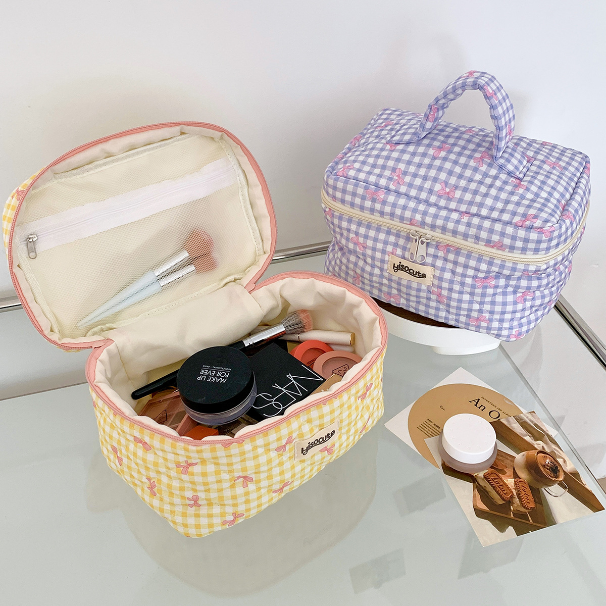 ins简约格子化妆包韩版蝴蝶结大容量洗漱收纳包高颜值手提护肤包