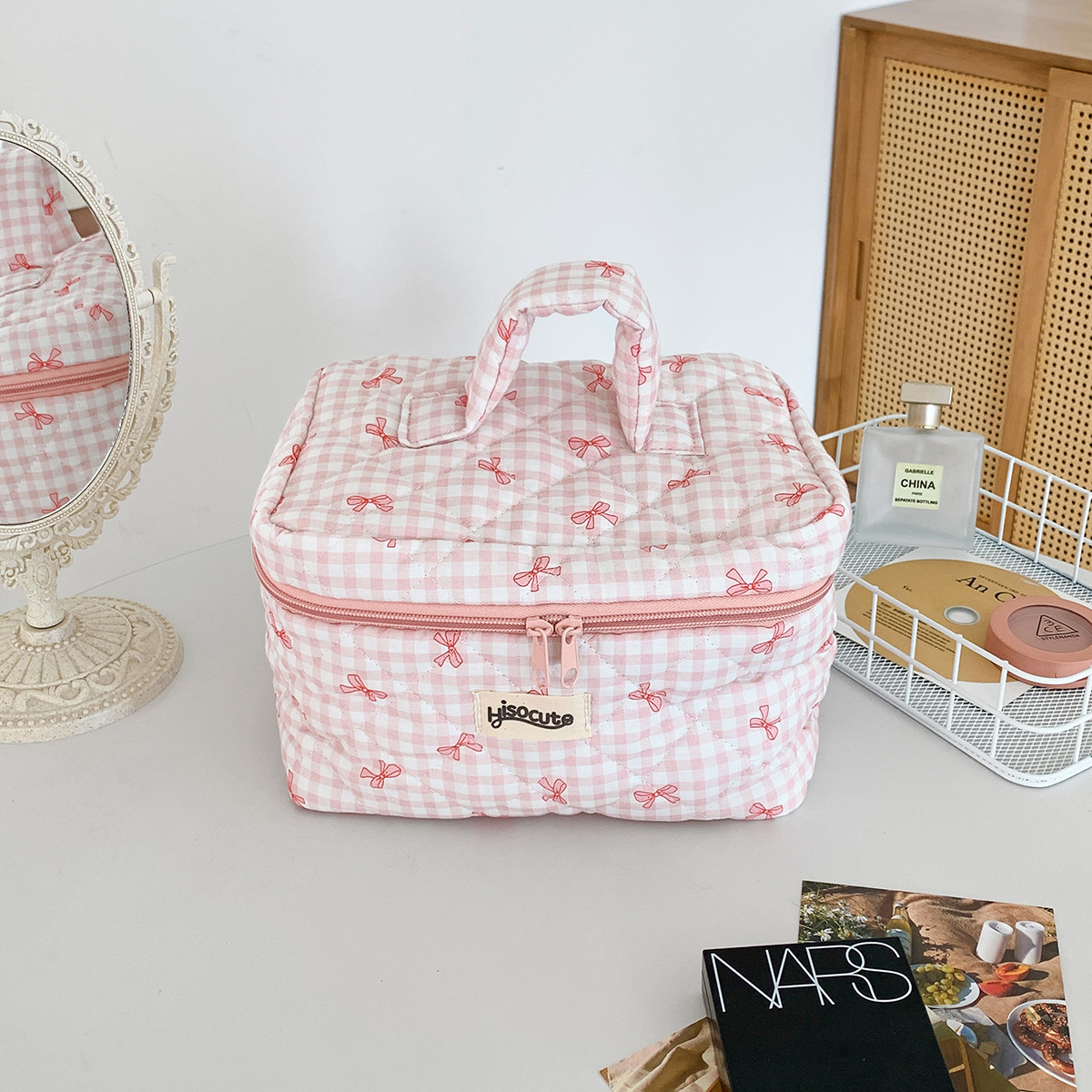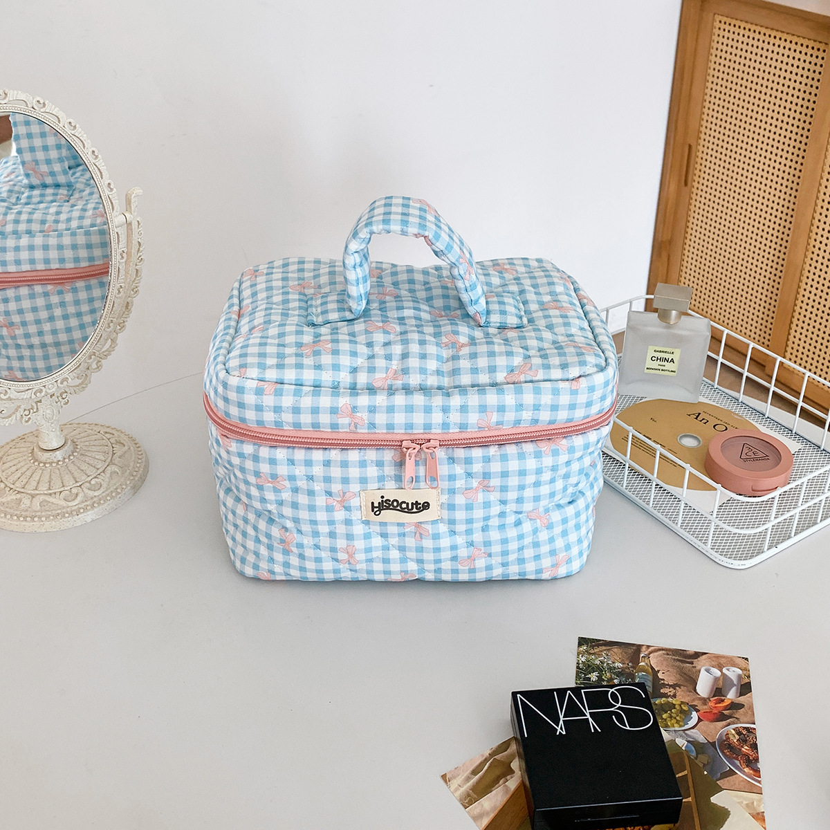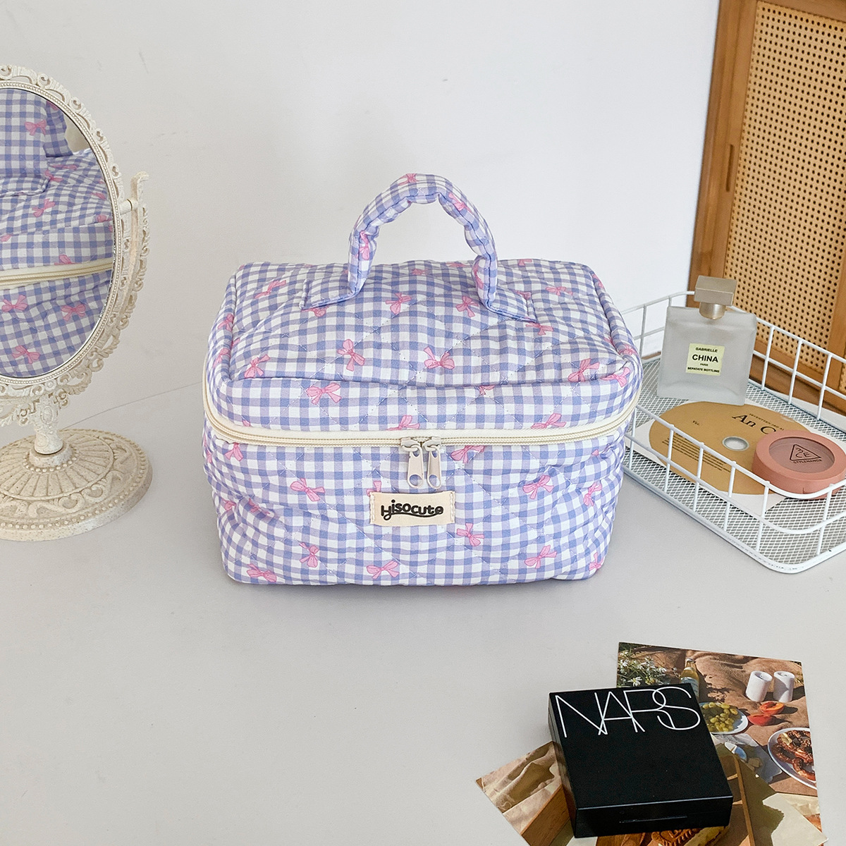 材质: 棉 里料质地: 涤纶 功能: 扩容,可收纳 品牌: HISOCUTE 流行元素: 蝴蝶结 有可授权的自有品牌: 是 风格: 清新甜美 货号: LM22 适用场景: 家用收纳 图案: 格纹 上市年份季节: 2024年夏季 适用性别: 女 重量: 0.5 kg/个